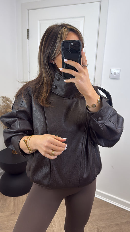 ZARIAH dark brown oversize high neck faux leather jacket