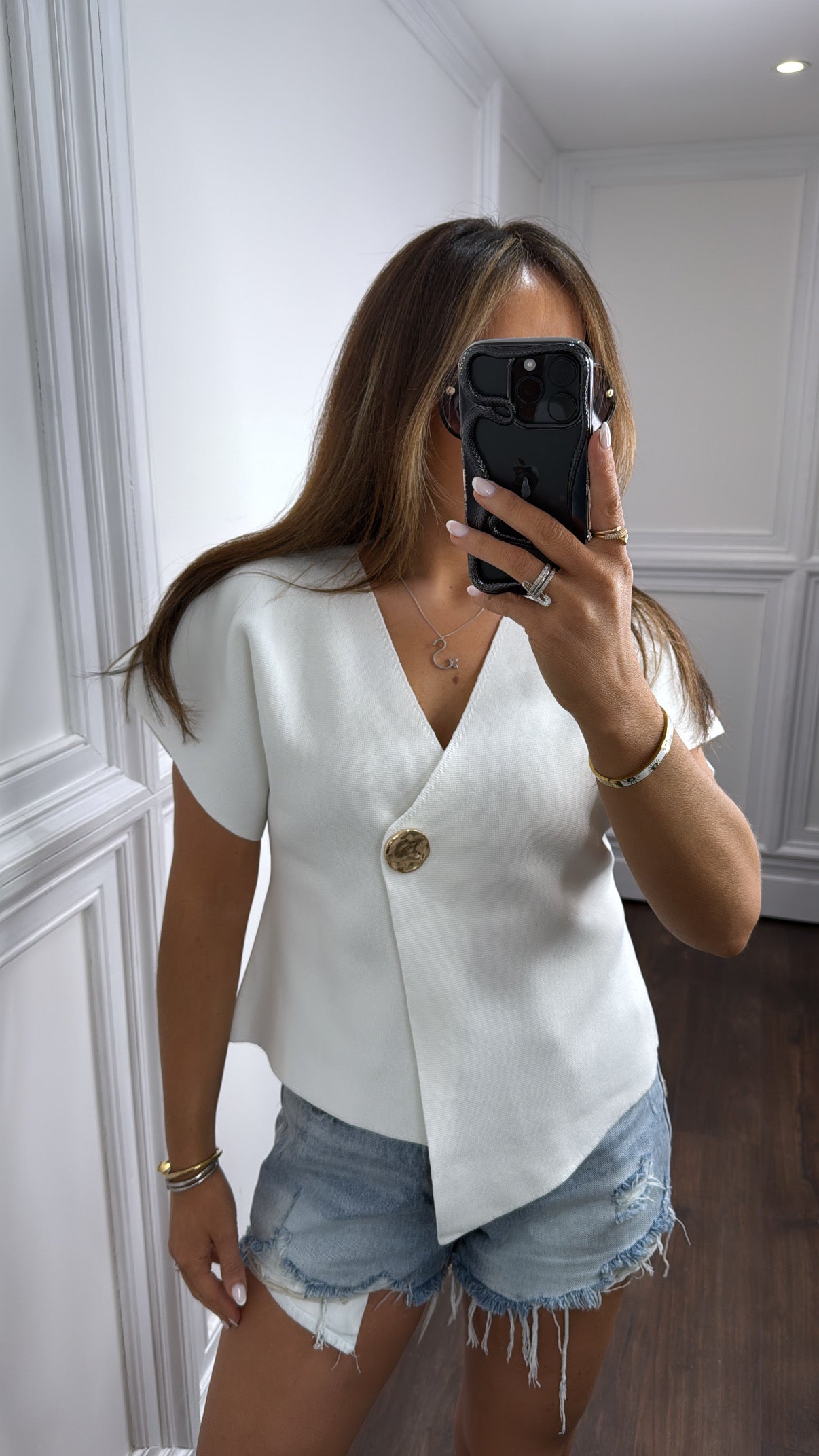 Introducing our ALICE white gold button top, made from luxurious knitted fabric. The asymmetric style adds a modern twist to this classic piece, making it the perfect addition to your fashionable wardrobe. Elevate your look and exude elegance with this top.