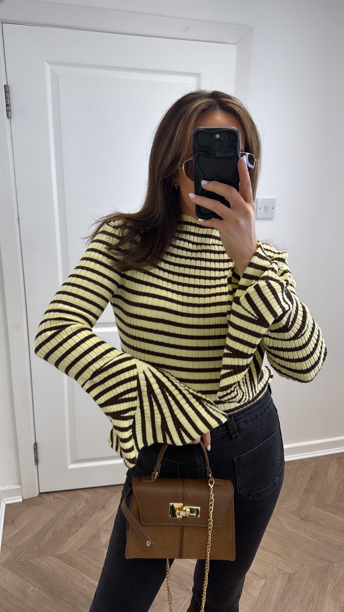 This ANNA top features bold lemon and brown stripes paired with super soft ribbed fabric, offering comfort and style. The gorgeous frill cuffs add a feminine touch, making it a standout piece for any wardrobe. Perfect for adding a cute and fashionable edge to your look.