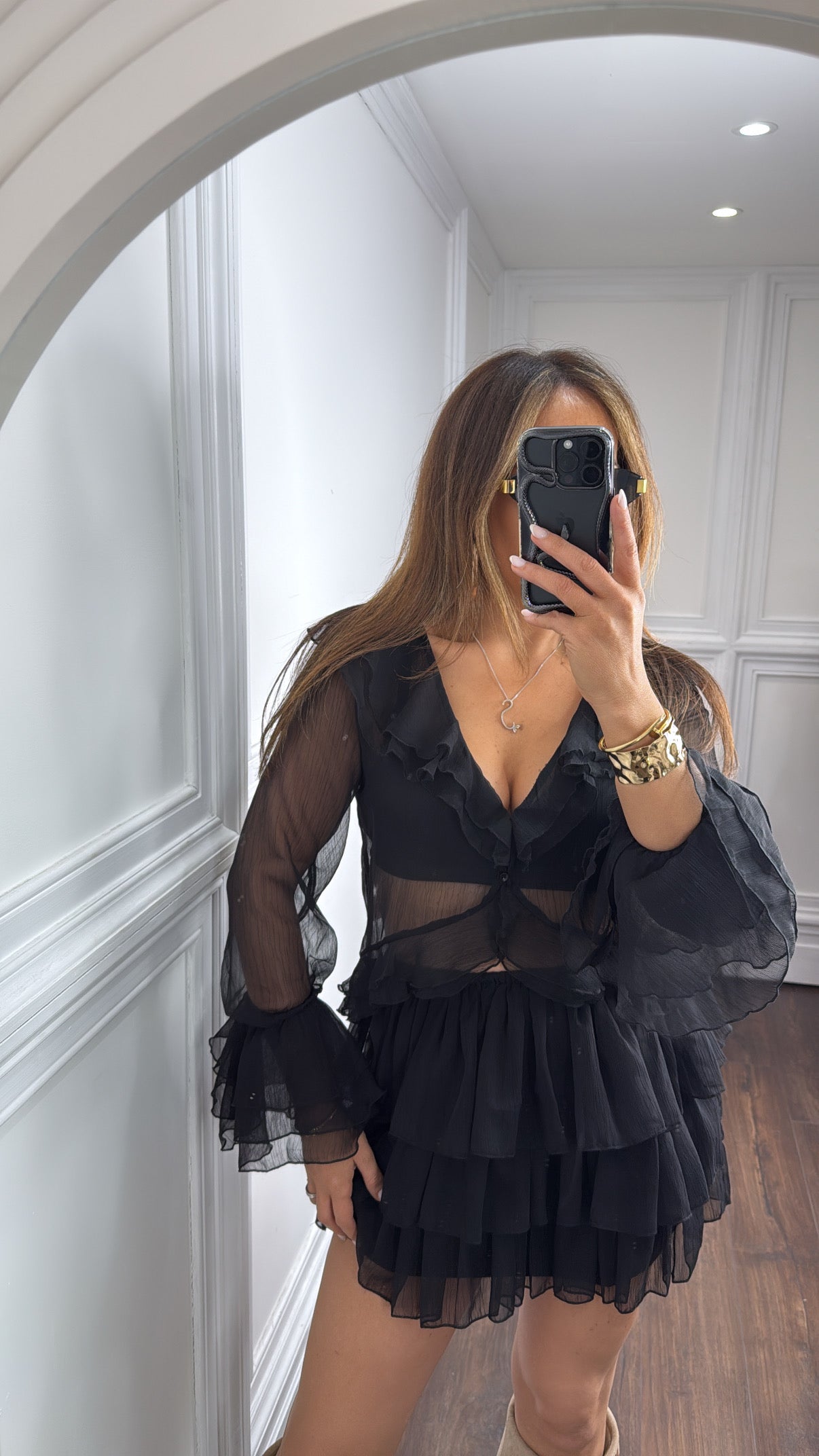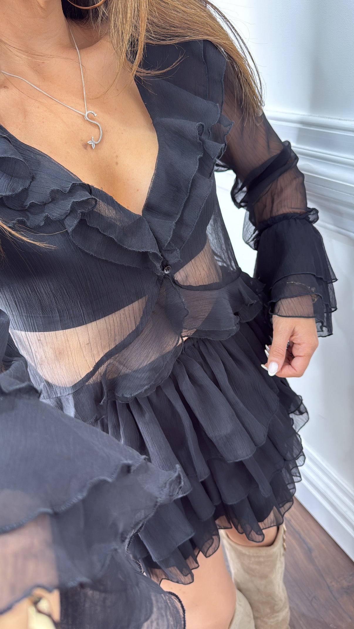 Elevate your style with our ANNIE chiffon co-ord set. The delicate sheer top features elegant ruffle detailing along the front with button accents and graceful long sleeves. Paired perfectly with a matching ruffle skirt that sits comfortably on an elasticated waist for effortless movement and all-day wear. This ethereal two-piece creates a stunning silhouette for any occasion.