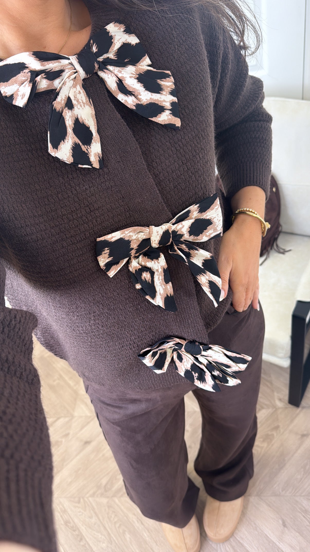 Wrap yourself in warmth and style with the ARIA brown cardigan, featuring a rich textured knit that adds depth to your look. Its stretchy fabric ensures a comfortable fit, while the eye-catching leopard bow detail brings a touch of playful sophistication to this timeless piece. Perfect for layering, this cardigan effortlessly blends cozy comfort with fashion-forward charm.