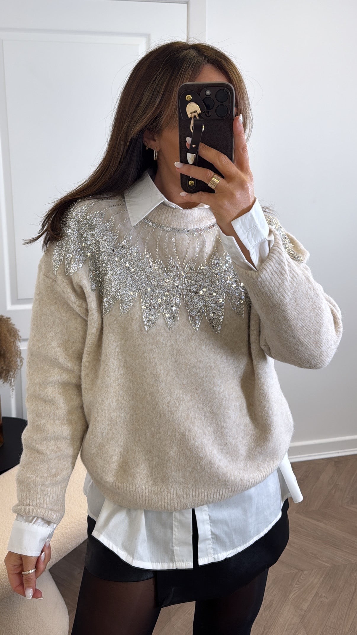 Elevate your festive wardrobe with the AZURA beige embellished sequin beaded jumper—a luxe statement piece that captures the glamour of the season. This stunning knit features intricate sequin and bead detailing that catches the light beautifully, making it the perfect choice for holiday gatherings and celebrations. Rich brown tones provide a sophisticated backdrop for the eye-catching embellishments, creating a look that's both elegant and undeniably show-stopping. Designed for those who refuse to blend in, this is the ultimate festive investment.