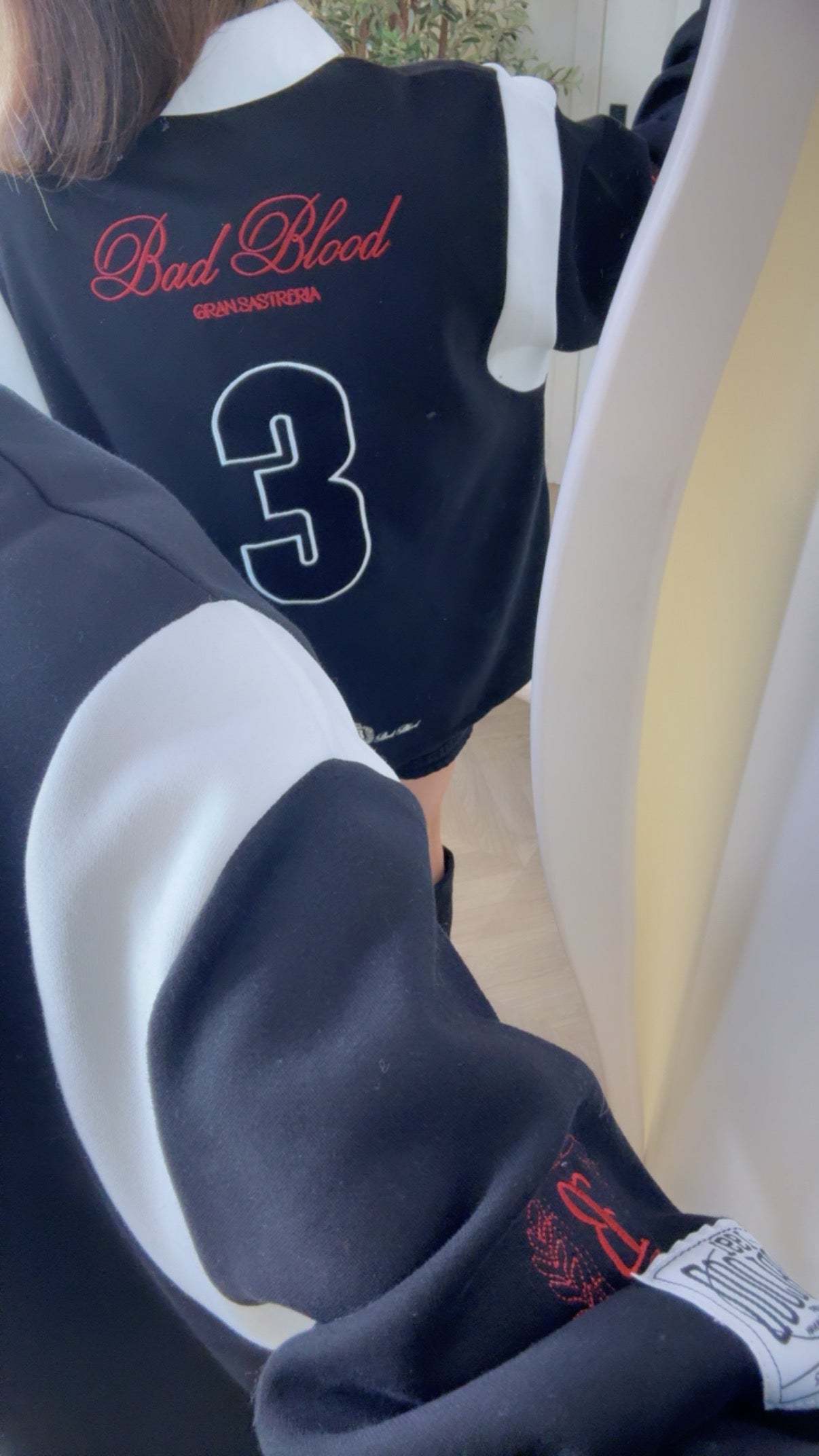 Our BAD BLOOD cream sweatshirt blends sporty style with soft comfort, featuring all-over logos for a dynamic look. The button collar with a contrasting black detail adds an edgy touch, making it a versatile piece for casual, fashion-forward outfits.