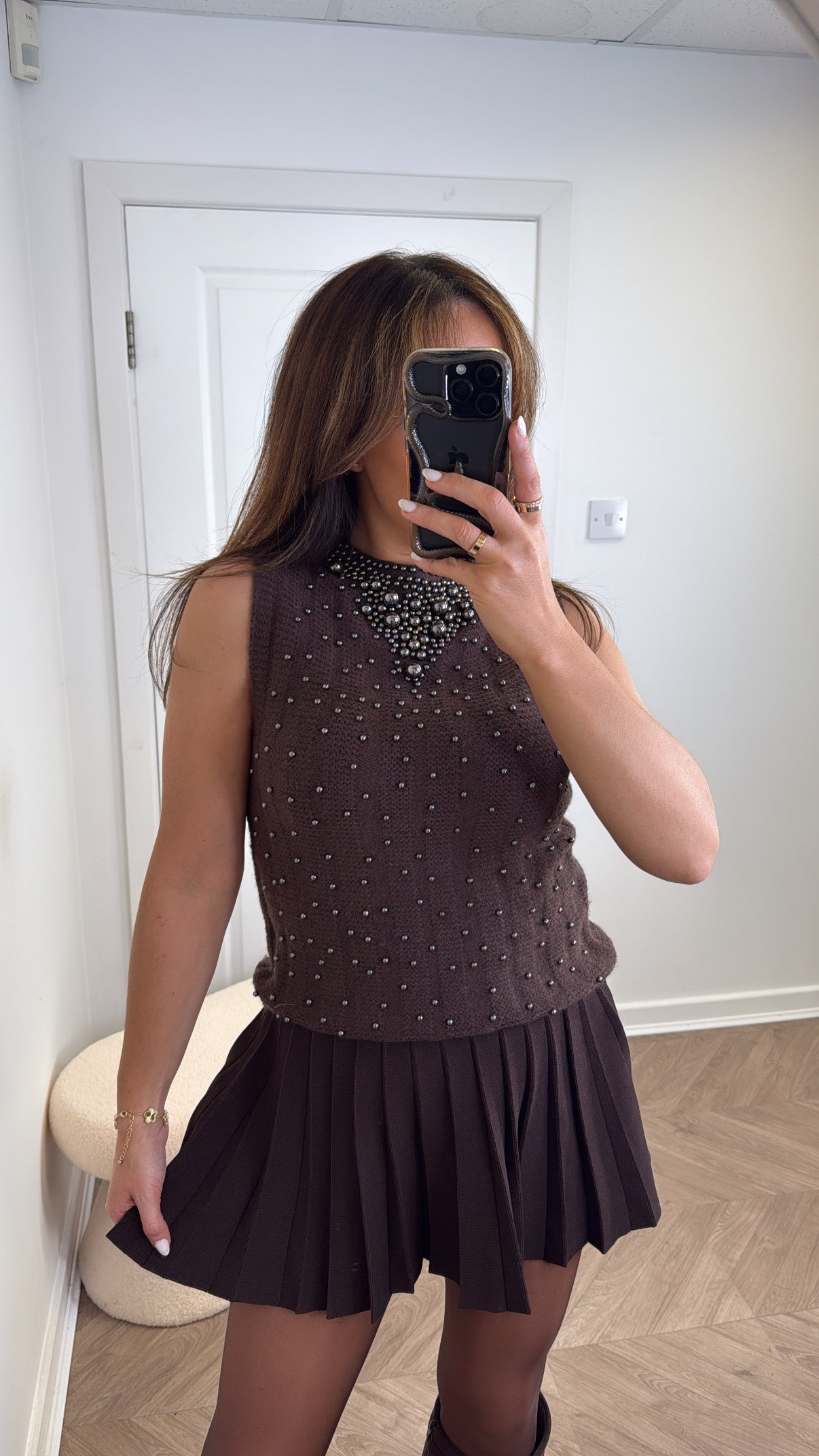 This BILLIE brown pearl embellished knitted vest offers a chic layering option with its rich texture and standout neckline detailing. The delicate pearl embellishments add a touch of elegance, making it perfect to elevate any outfit while keeping you comfortably stylish.