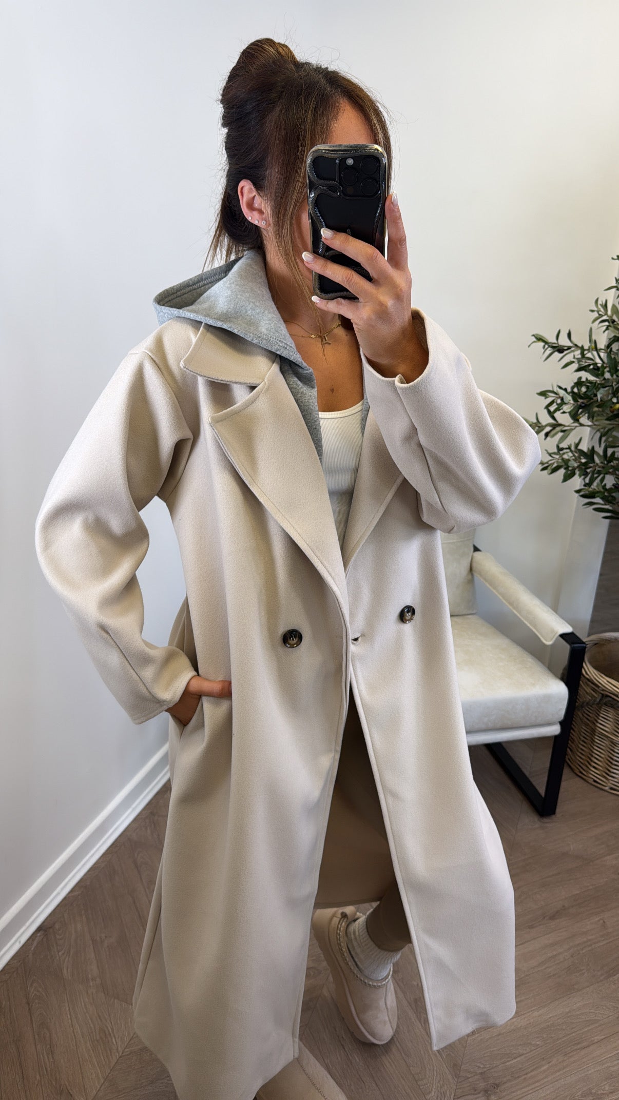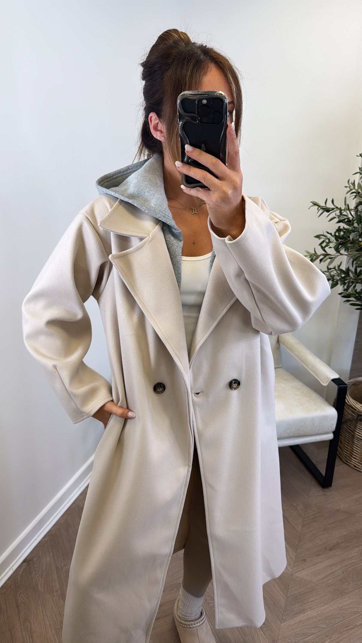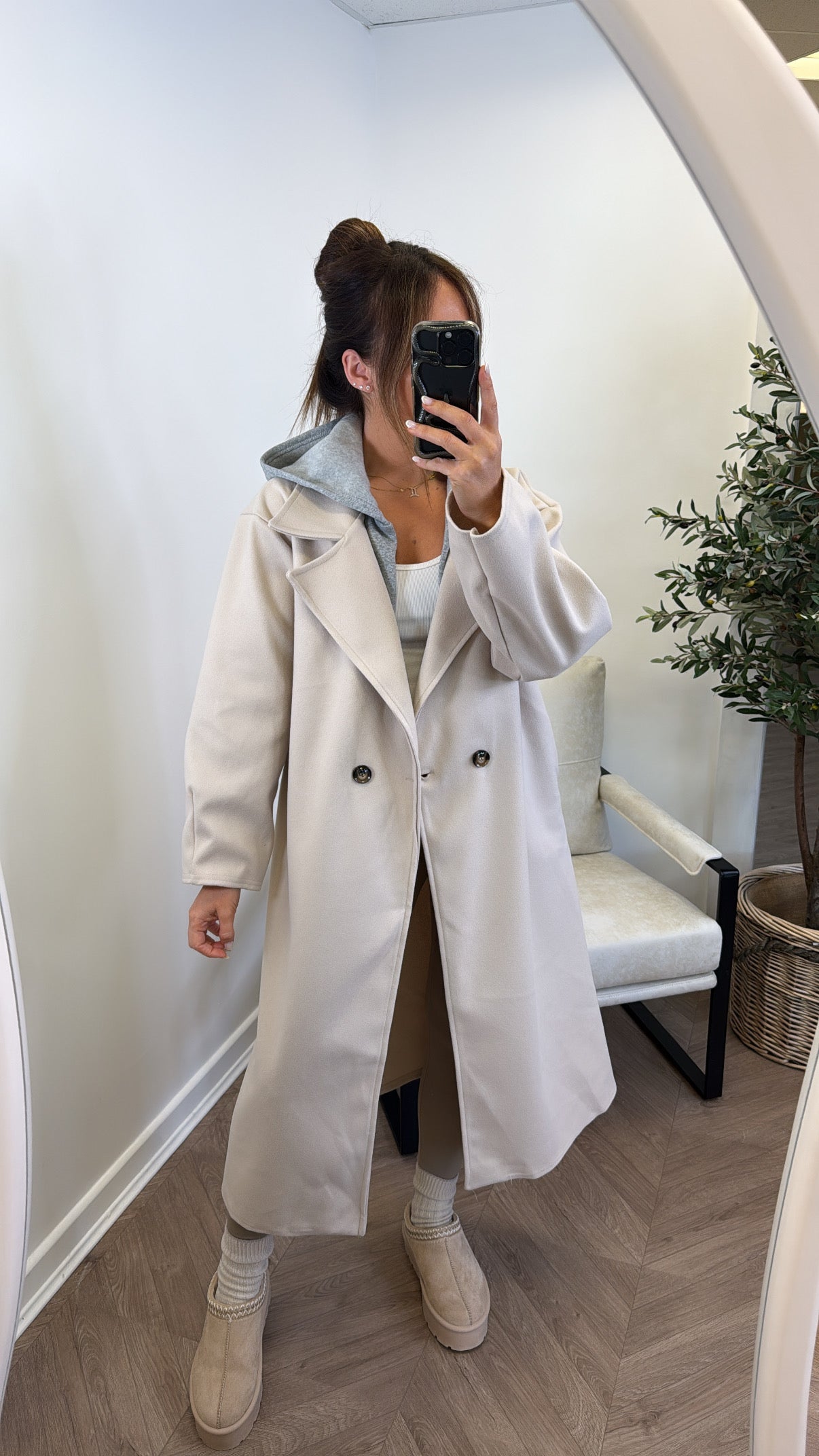 Elevate your outerwear with the BOSTON beige hooded oversize duster jacket. This double-breasted design features a relaxed, duster-length silhouette and an integral hoody, blending edgy style with practical warmth. Perfect for layering, it adds a bold, fashion-forward statement to any outfit.