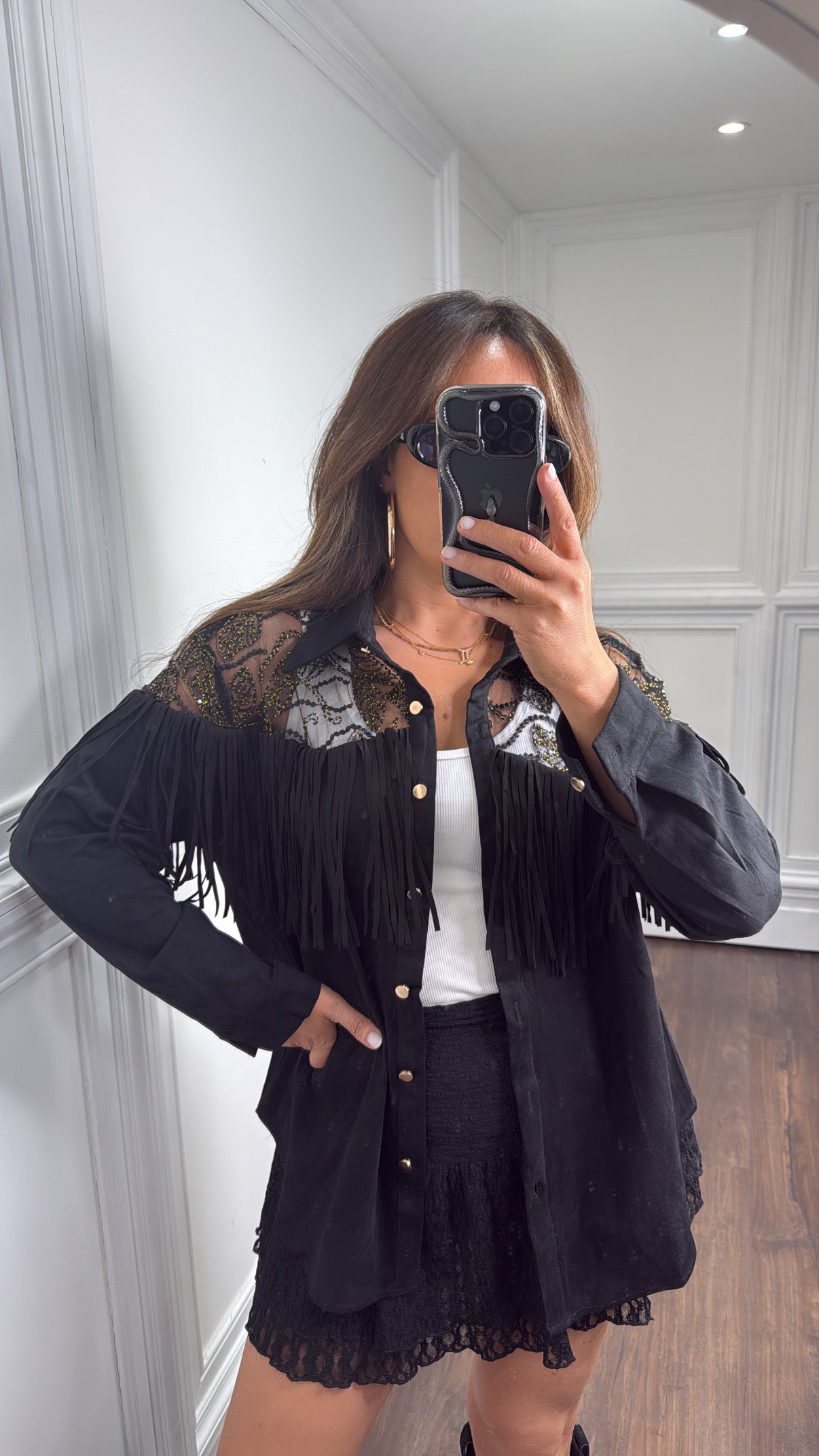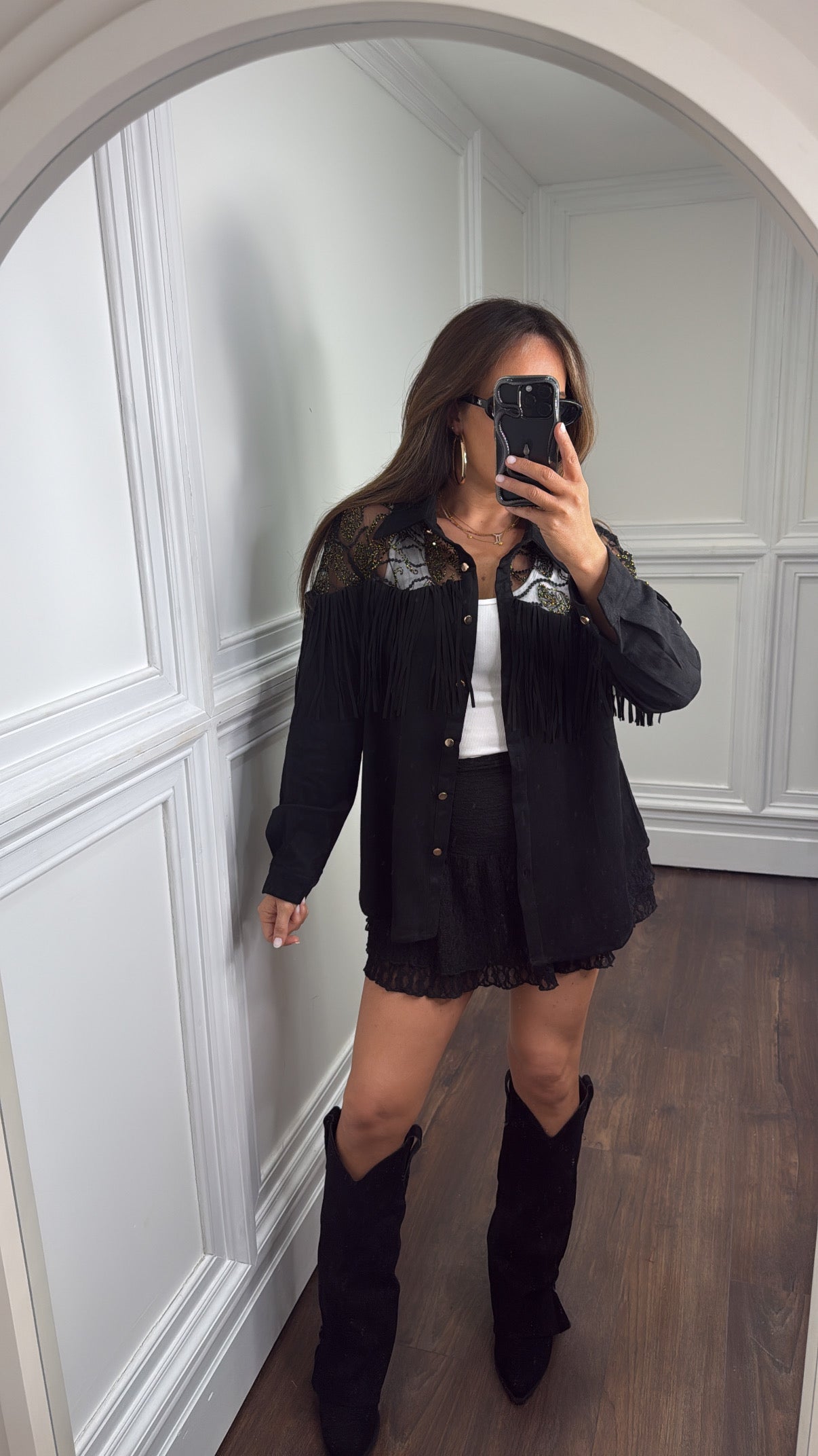 Elevate your wardrobe with the BROGAN black soft suede tassel shirt, featuring delicate lace detailing on the shoulders adorned with shimmering gold sequins. This button-up shirt combines luxurious suede softness with stylish tassels for a standout look. Perfectly paired with shorts and cowboy boots, it brings a fresh, fashion-forward edge to your new season outfits.