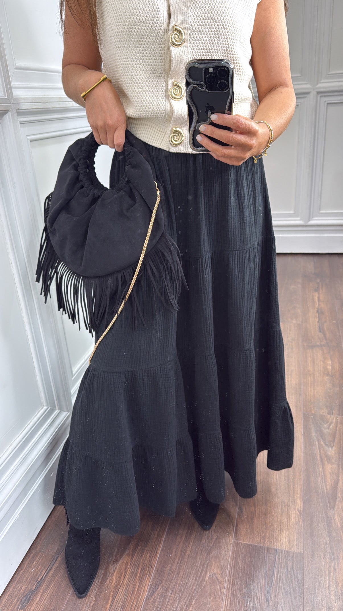 Embrace effortless boho chic with the CARLI black cheesecloth tiered maxi skirt. Featuring a stretchy waistband for all-day comfort, this festival-ready skirt flows beautifully with its lightweight, breathable fabric. Perfect for layering and movement, it adds a stylish, relaxed vibe to any summer wardrobe.