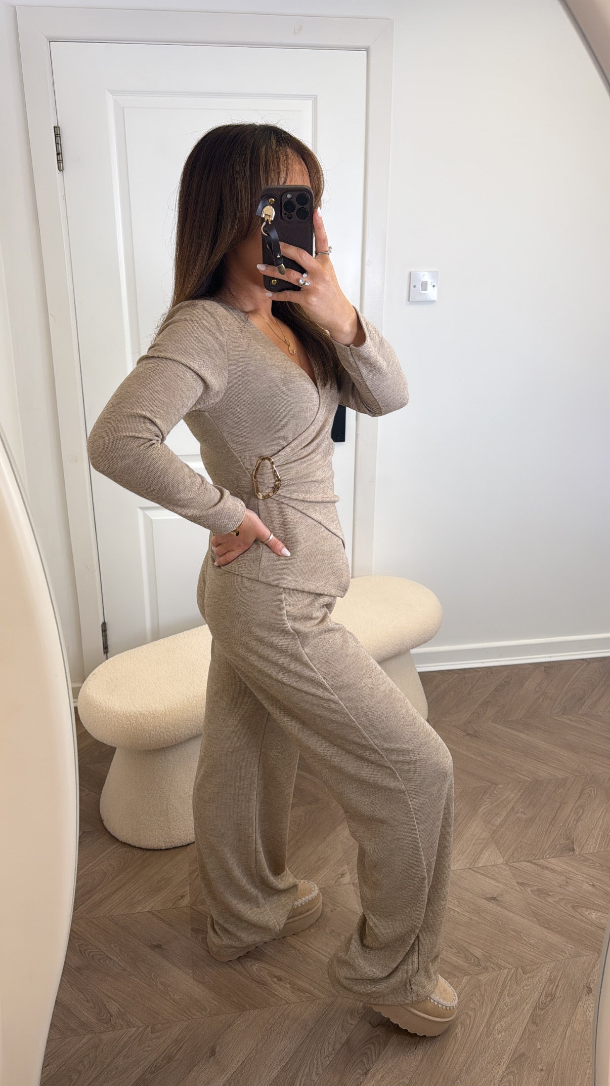 Elevate your autumn wardrobe with this effortless co-ord set. The Charlotte wrap top features a flattering silhouette secured with a gleaming gold buckle, crafted from sumptuous soft fabric that feels as luxurious as it looks. Pair it with the matching wide-leg trousers, complete with an elasticated waist for all-day comfort and ease. Perfect for transitioning from desk to dinner, this beige ensemble captures the essence of new-season sophistication with understated elegance.