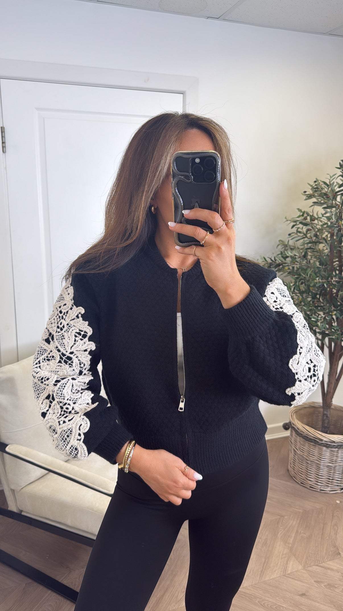 Elevate your layering game with the CLARISSA black knitted cardigan. This smart zip-up style features a textured knit and delicate crochet detailing, combining comfort with chic sophistication. Perfect for adding a cosy yet polished touch to any outfit.