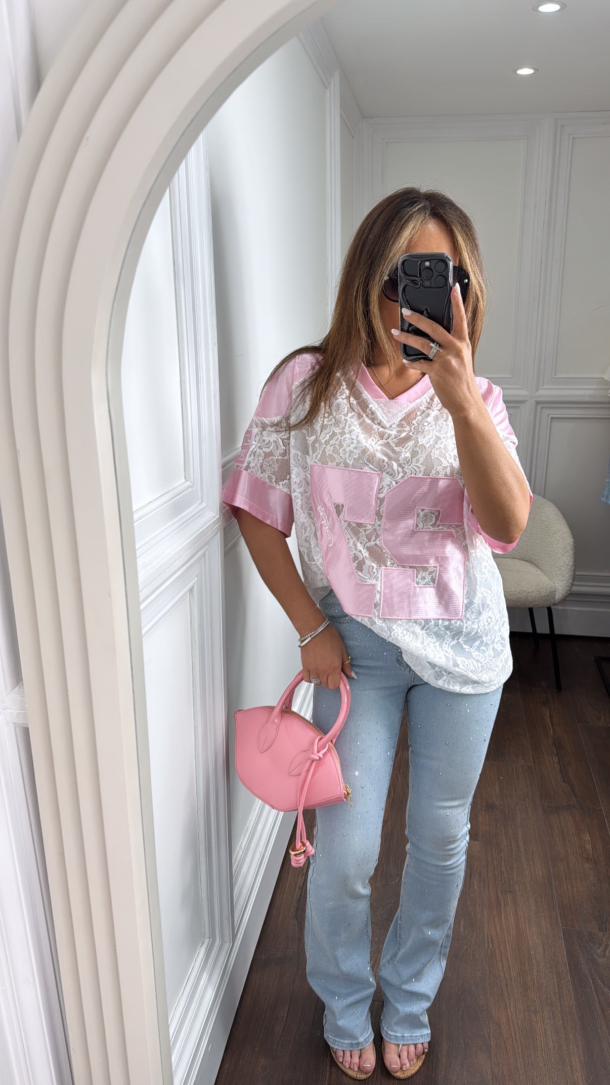Our CORIN top blends delicate sheer lace with premium satin-style detailing for an edgy yet feminine look. Designed in a sporty jersey silhouette, it features a bold "27" emblazoned on both front and back. The striking pink and white color palette makes this piece a standout addition to any style-conscious wardrobe.