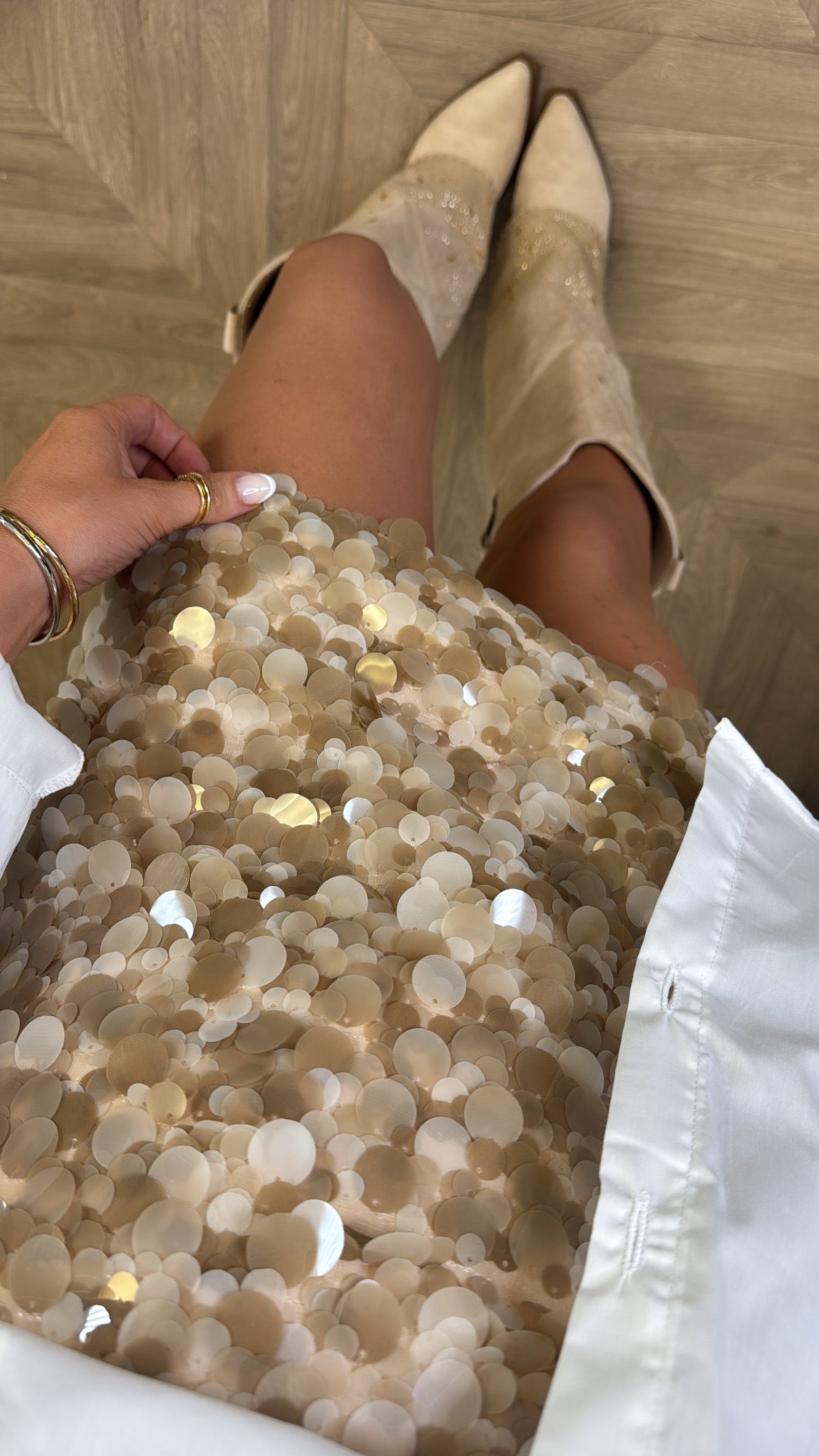Elevate your style with the DEENA beige disc sequin mini skirt, designed to catch the light and turn heads. This shimmering piece blends delicate sequins with a flattering mini length, perfect for evenings out or special occasions. Its subtle beige tone adds a sophisticated touch while the sparkling discs bring bold glamour to your look. Pair it with sleek heels and a simple top for effortlessly chic appeal.