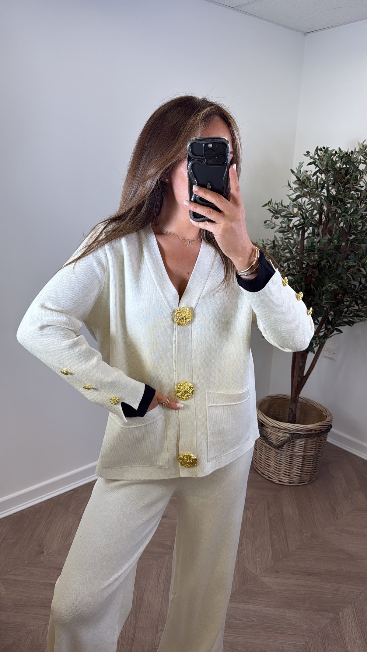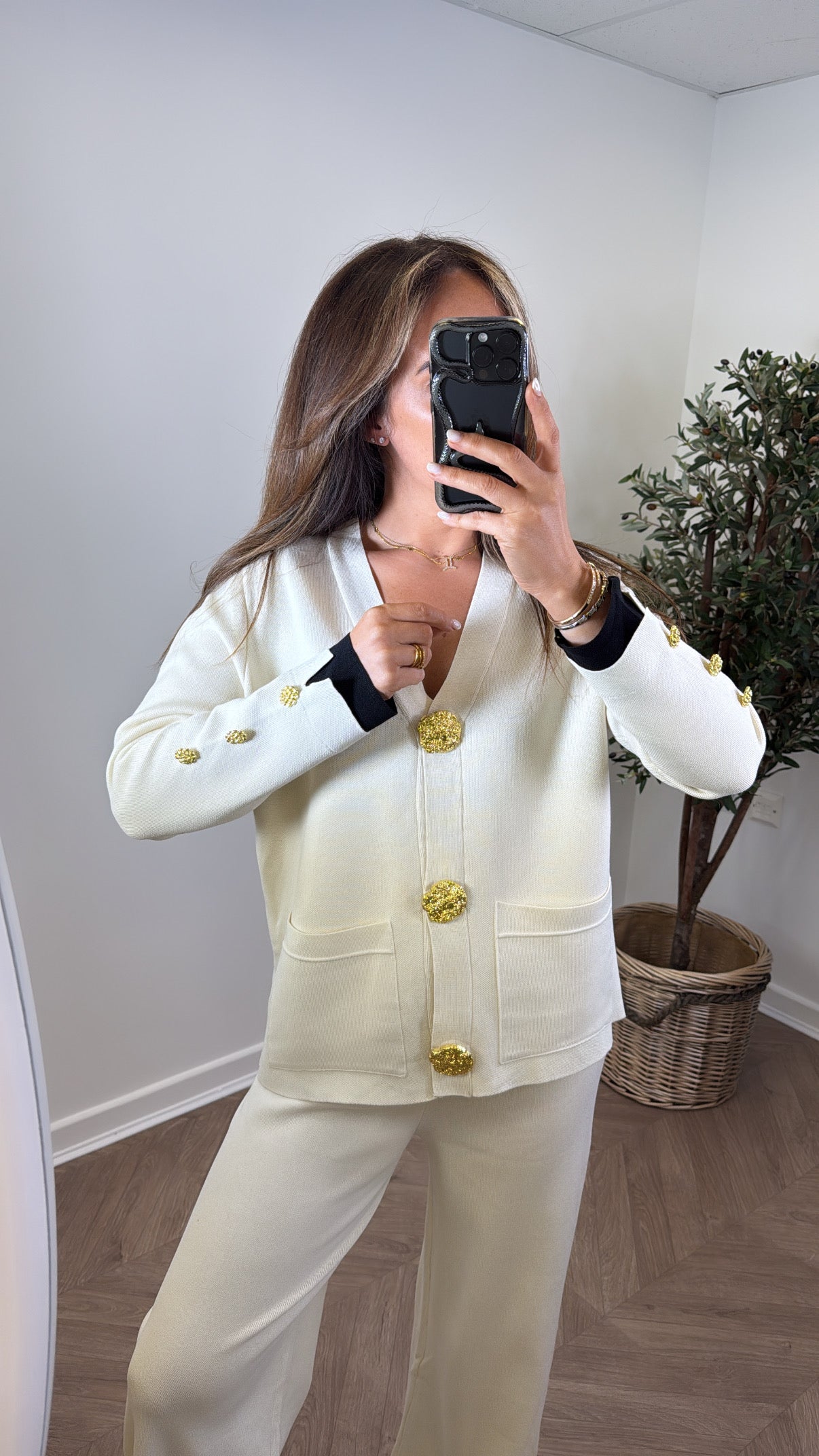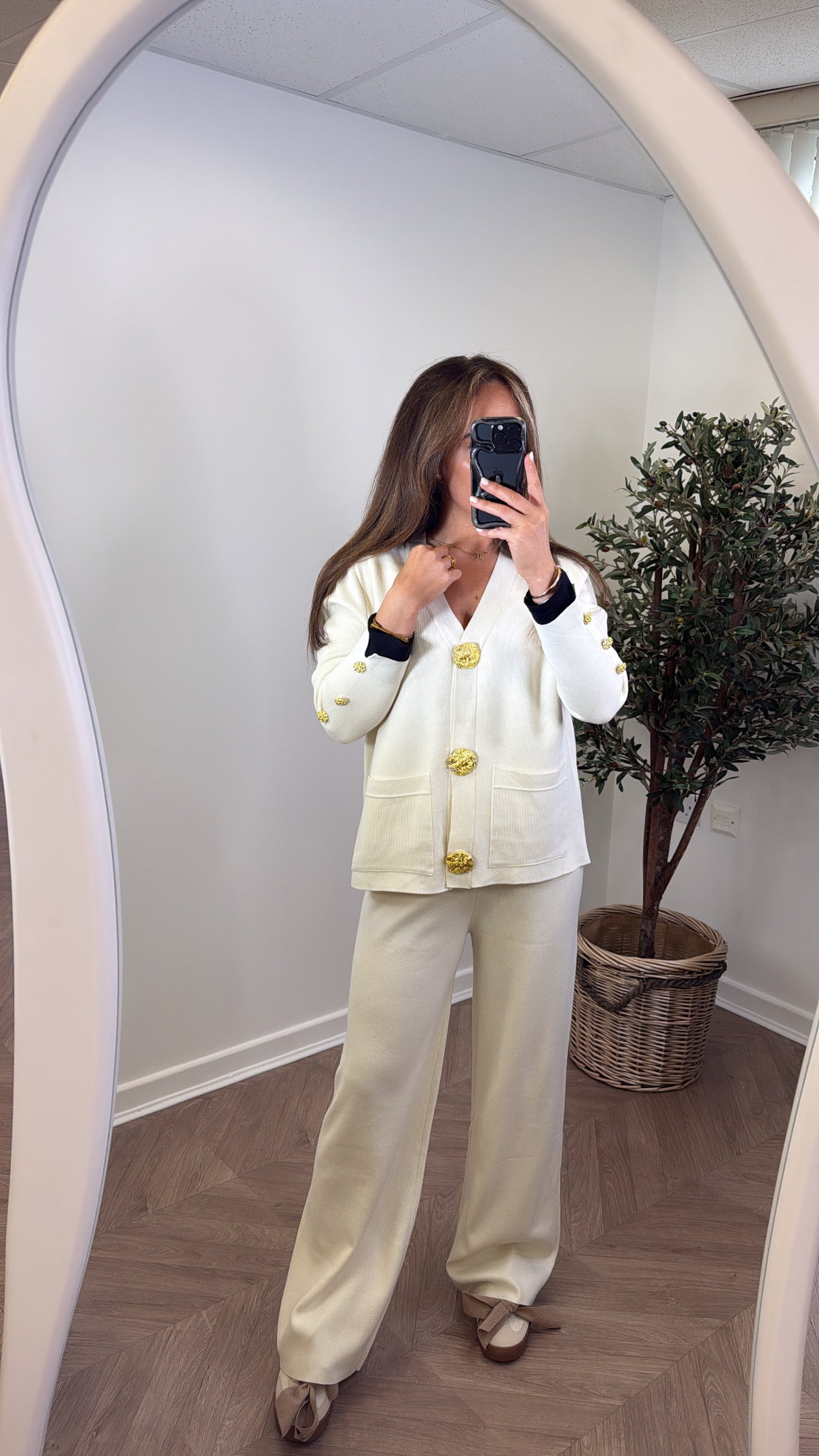 ETTA cream knitted gold button cardigan with black contrast cuff's and wide leg trousers co-ord