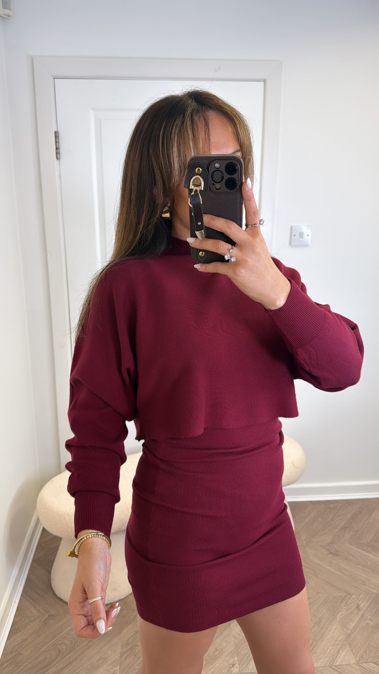 Elevate your wardrobe with this striking two-layer jumper dress. The luxurious knitted construction features a sophisticated overlay design that adds depth and visual intrigue. In a rich burgundy tone, it's the perfect piece for creating effortlessly chic looks that transition seamlessly from day to evening. The layered silhouette flatters the figure while delivering that coveted modern edge. A versatile essential that exudes understated elegance and contemporary style.