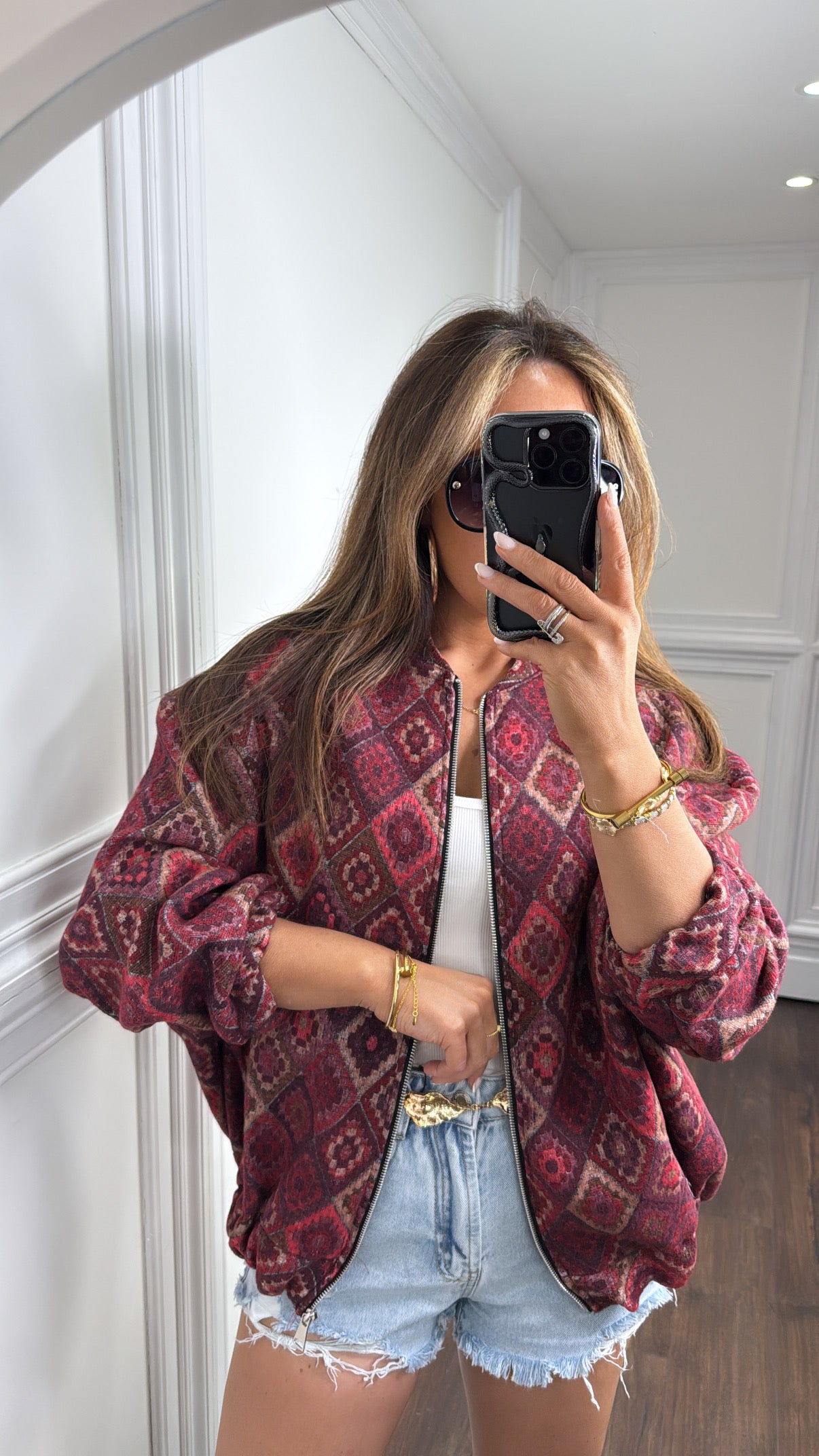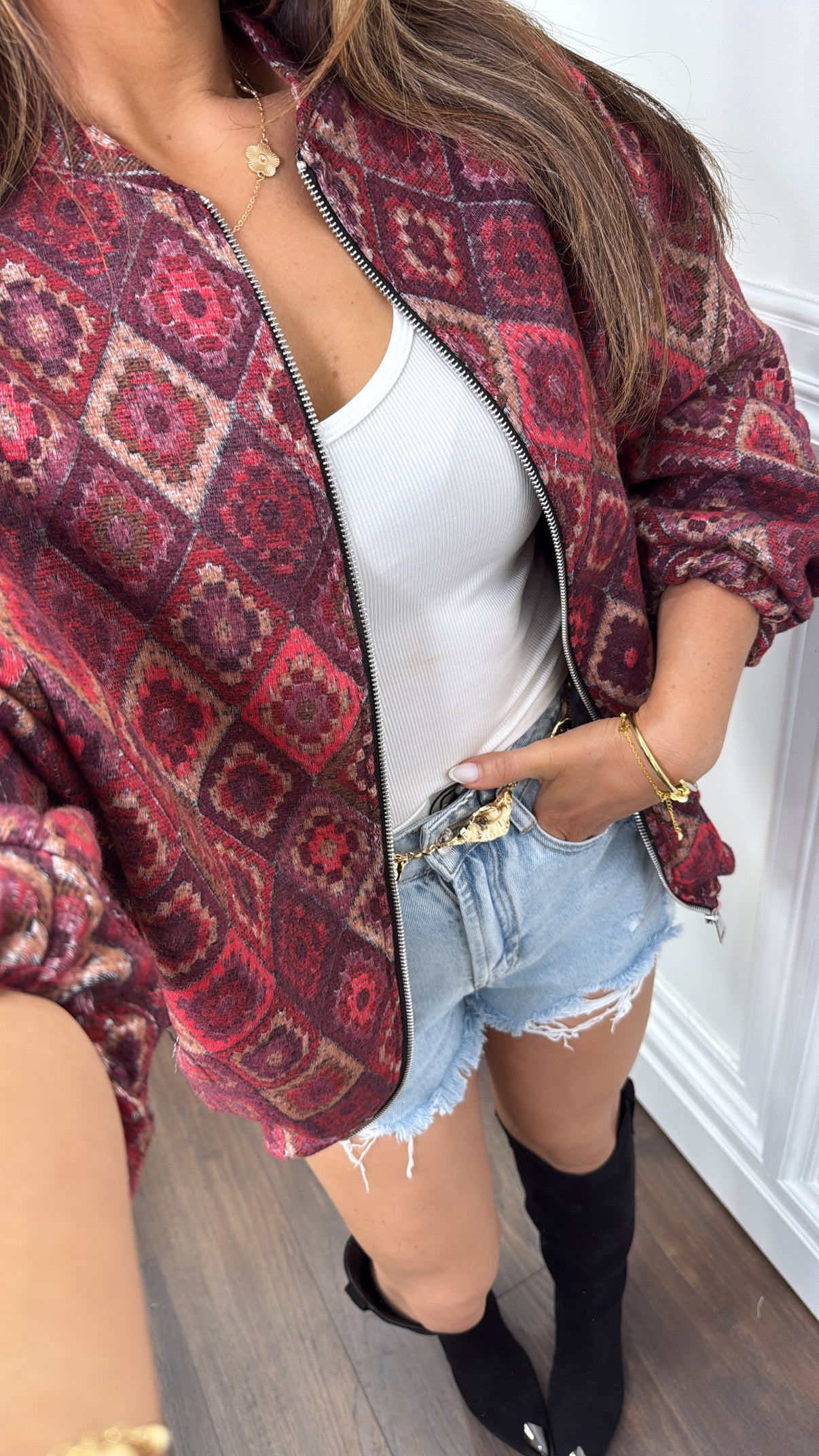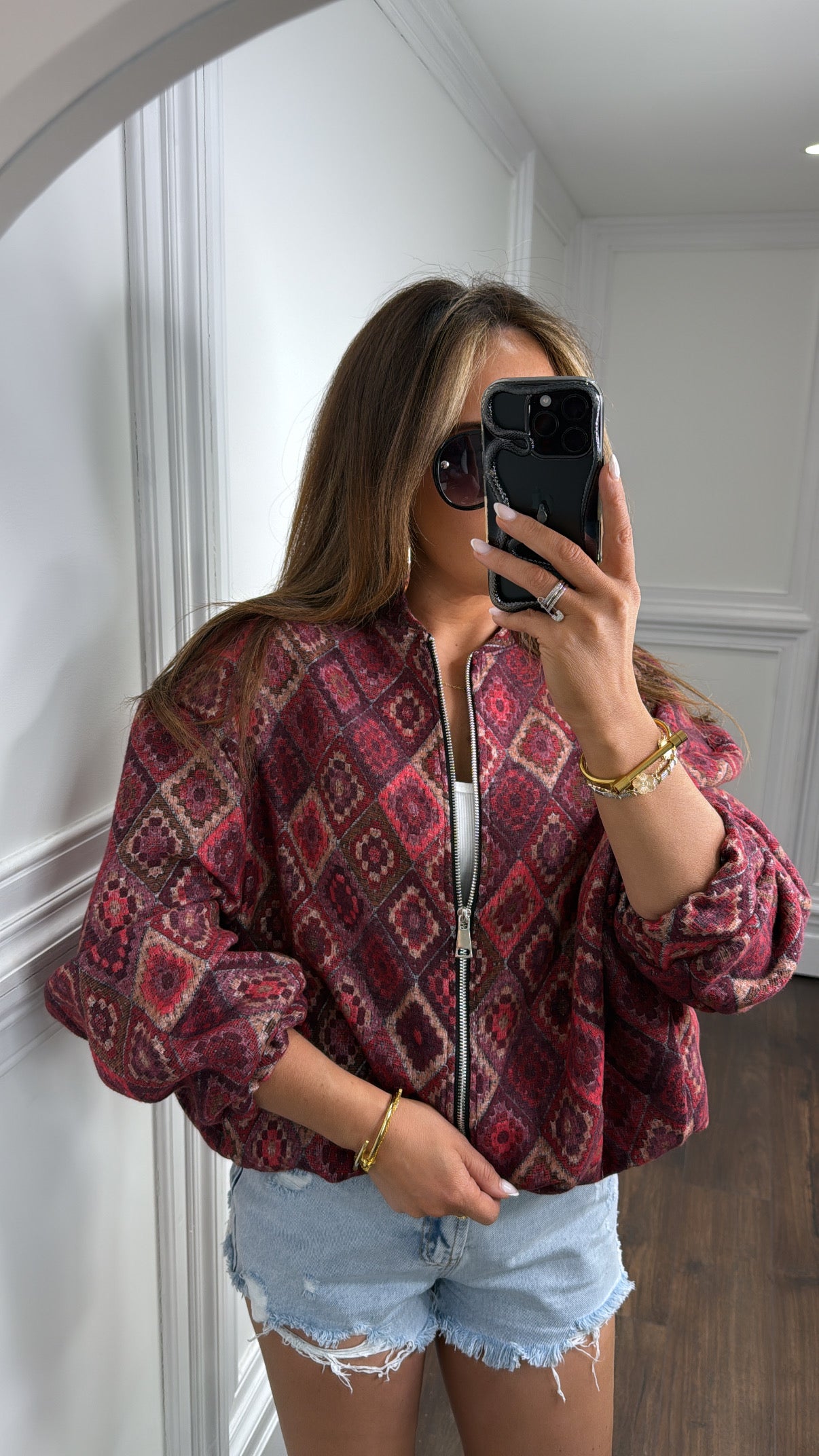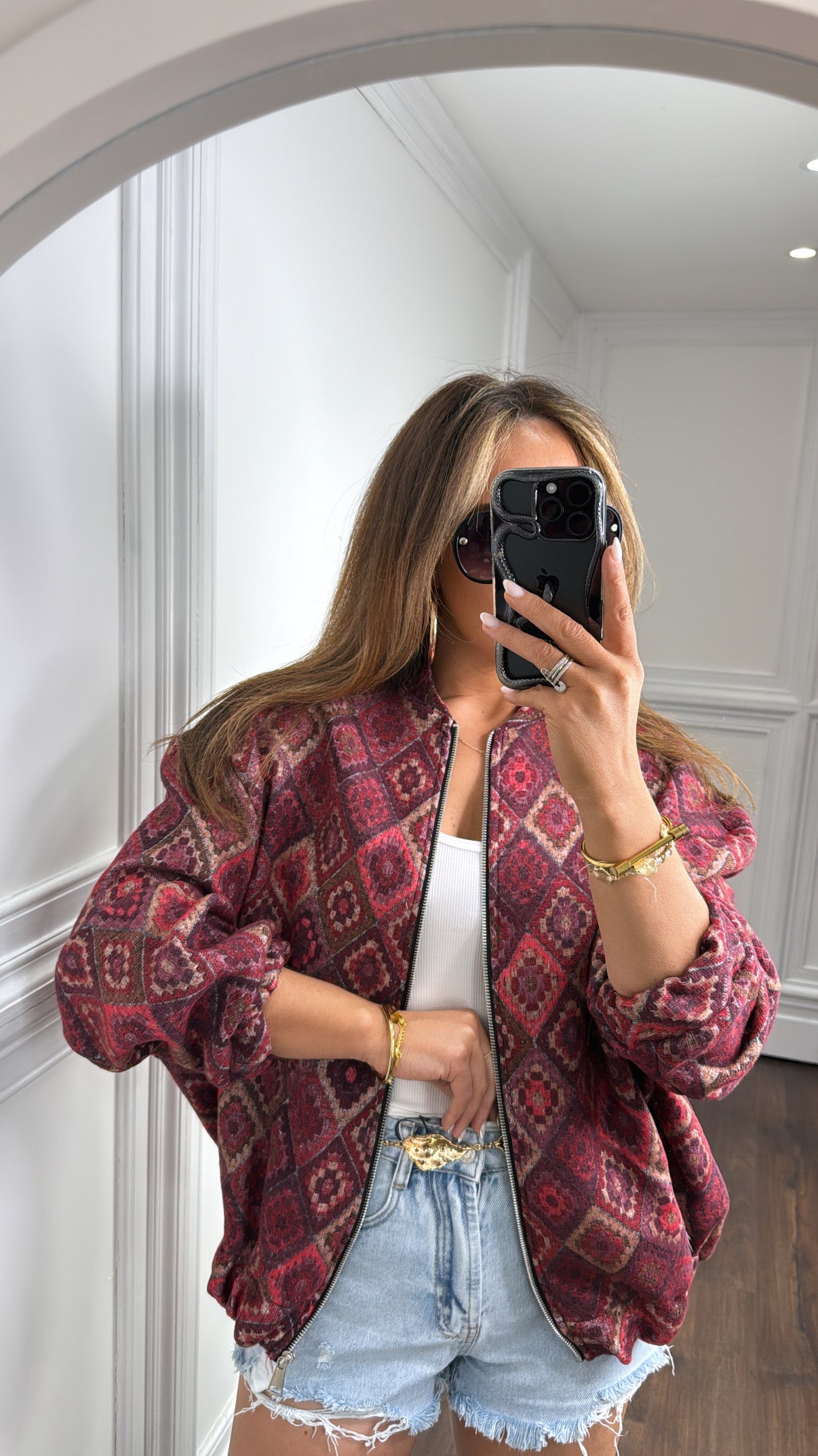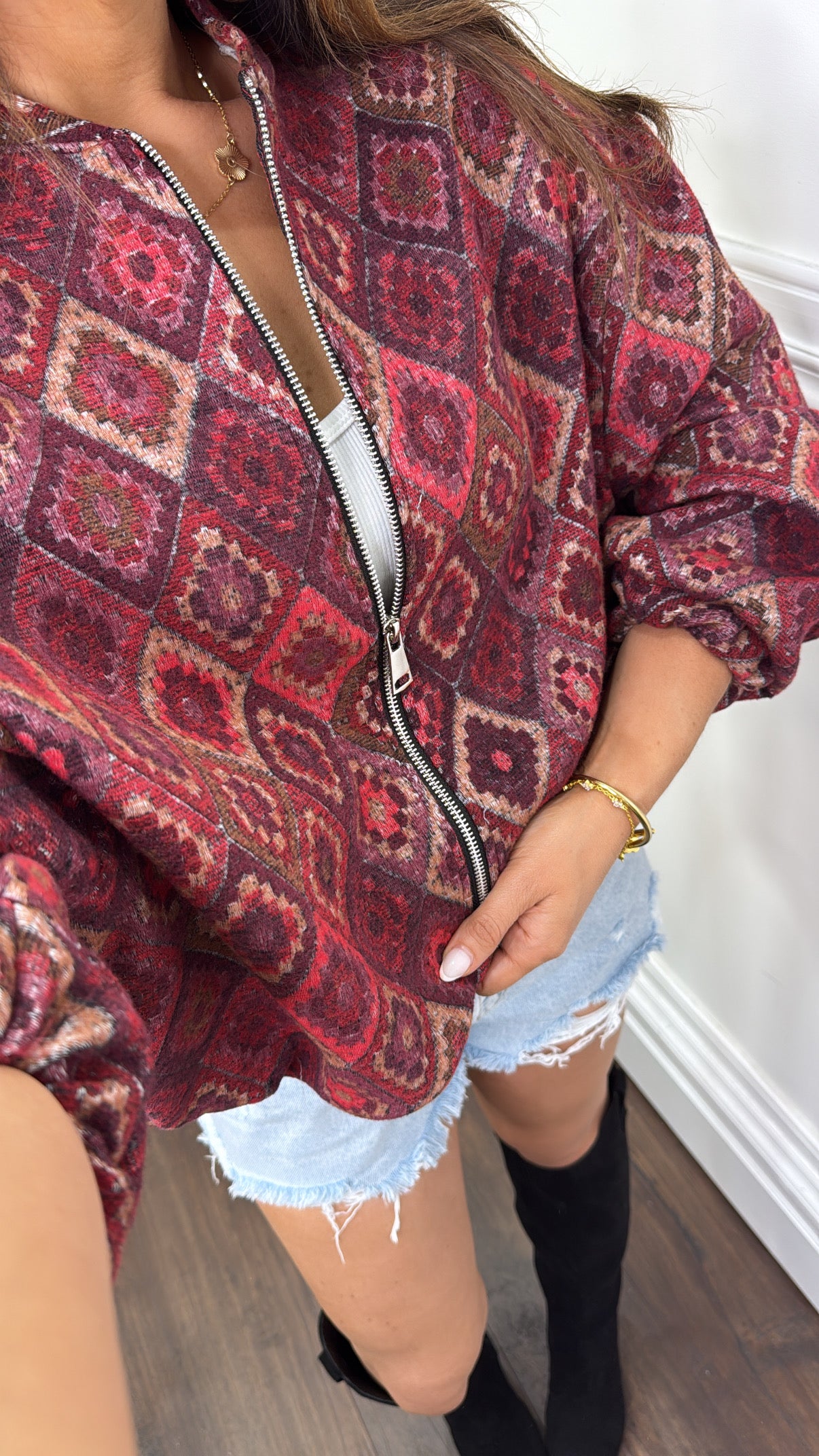Elevate your casual wardrobe with our IZZY burgundy aztec knit zip-up jacket. Crafted from soft knit fabric, it offers cozy comfort while showcasing a bold Aztec print. The zip-up front adds versatility, and elasticated waist and cuffs ensure a flattering, snug fit. Perfect for layering in style.