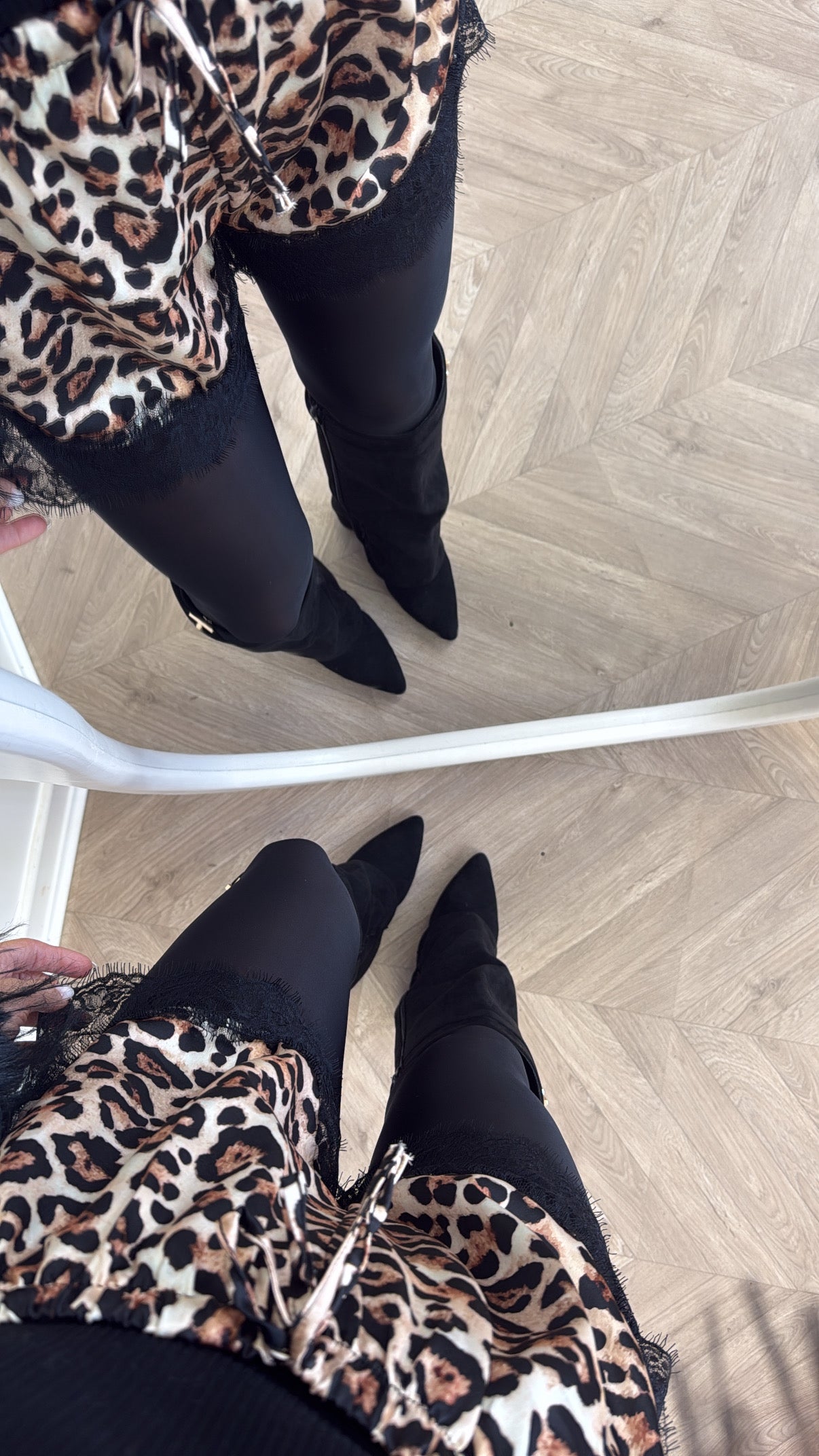 Elevate your party season look with these striking JENNA shorts. Crafted from sleek satin leopard print with delicate lace trim detailing, they strike the perfect balance between edgy and elegant. The elasticated waist ensures a comfortable fit all night long, making them ideal for dressing up at celebrations and special occasions. Versatile enough to pair with heels and a blazer or dress down with a casual top, these shorts are a wardrobe essential for the festive season.