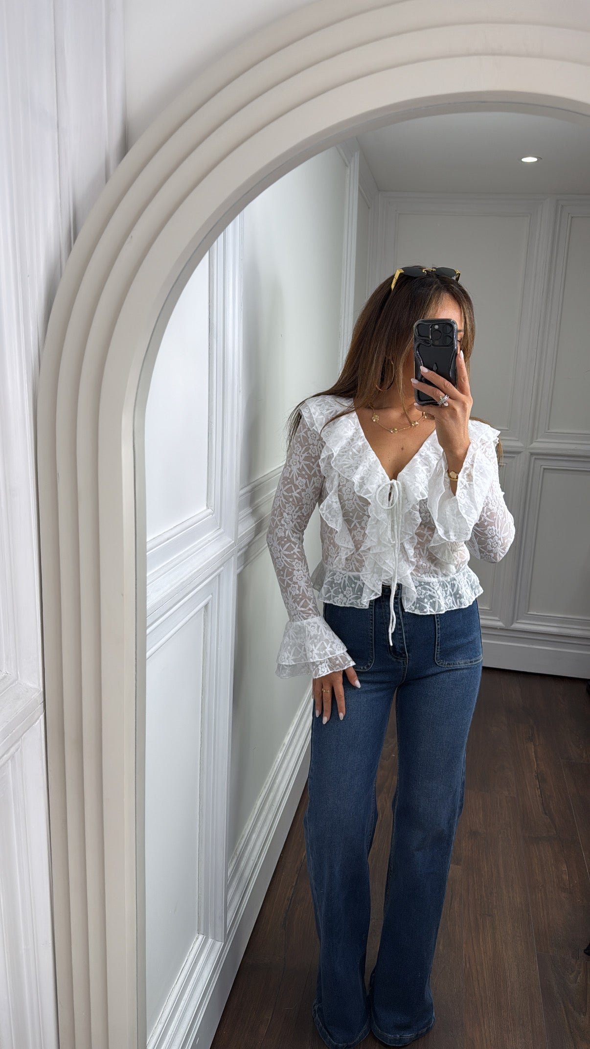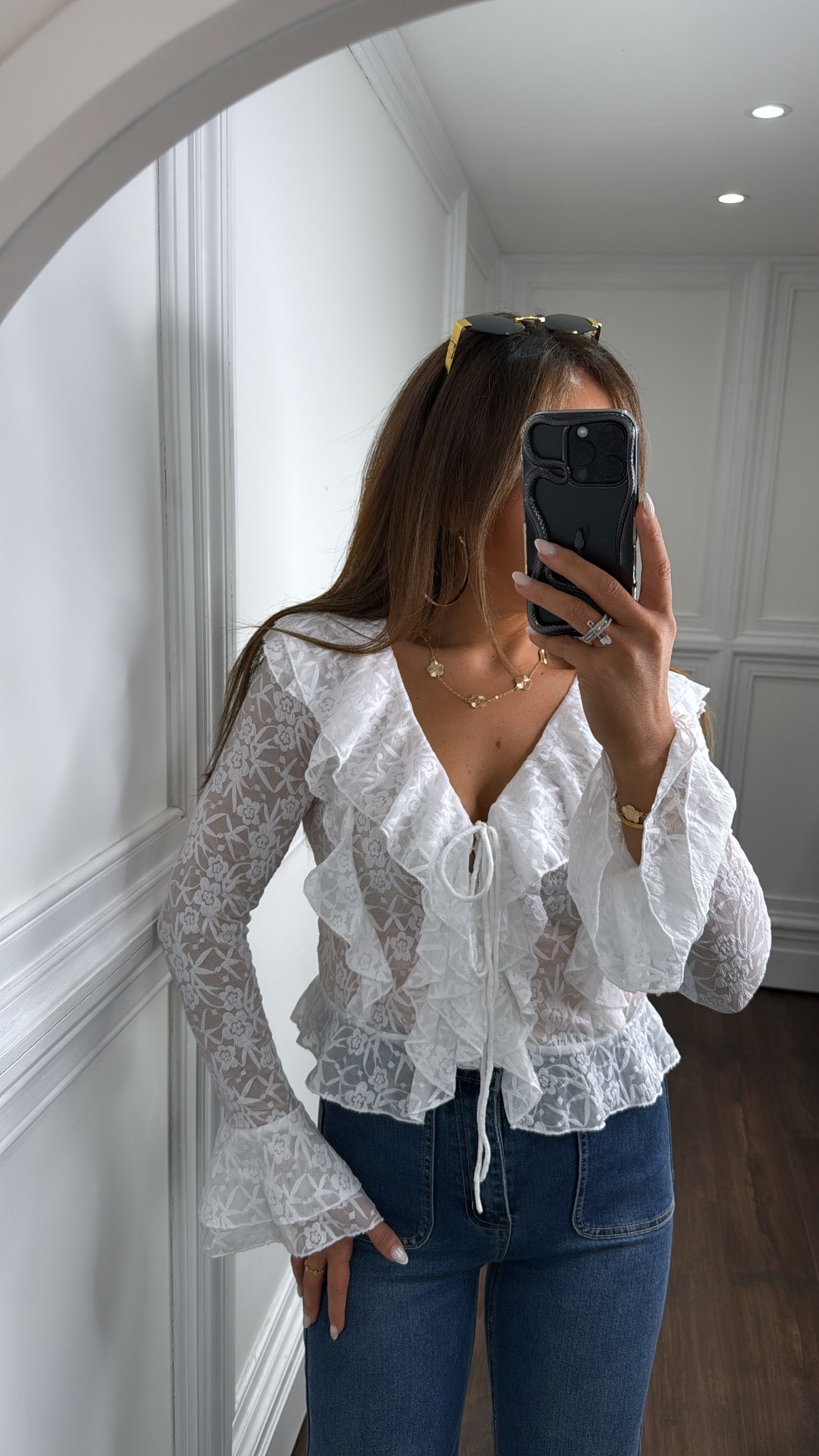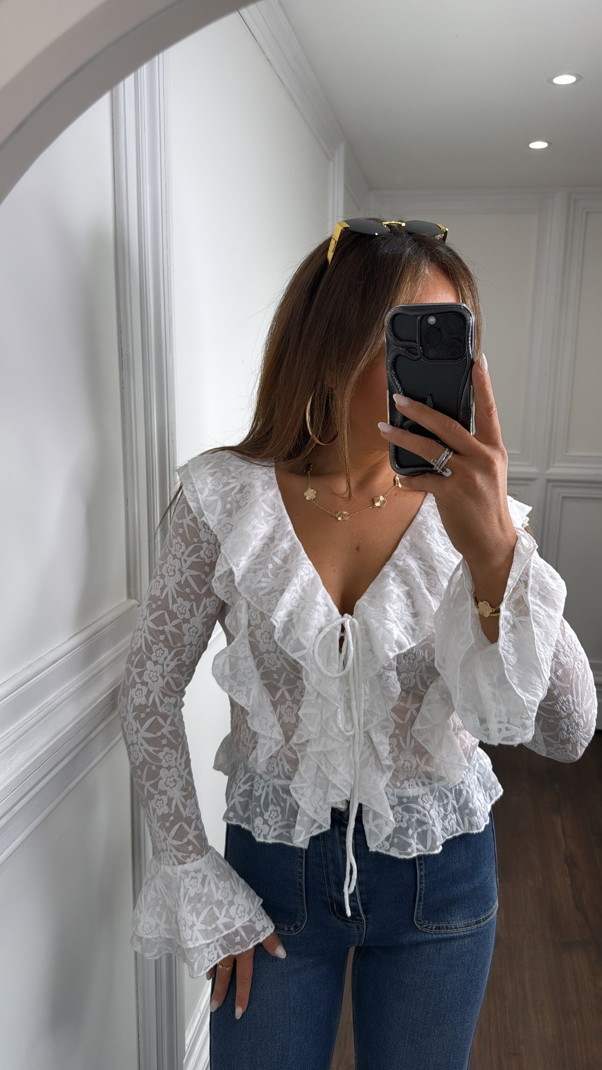 Achieve ultimate fashion-forward style with our JENNI white lace ruffle crop top. The stunning lace material and intricate ruffle design elevate any outfit, while the lace-up front and ruffle cuff sleeves add a touch of elegance. Look effortlessly chic in this must-have piece.