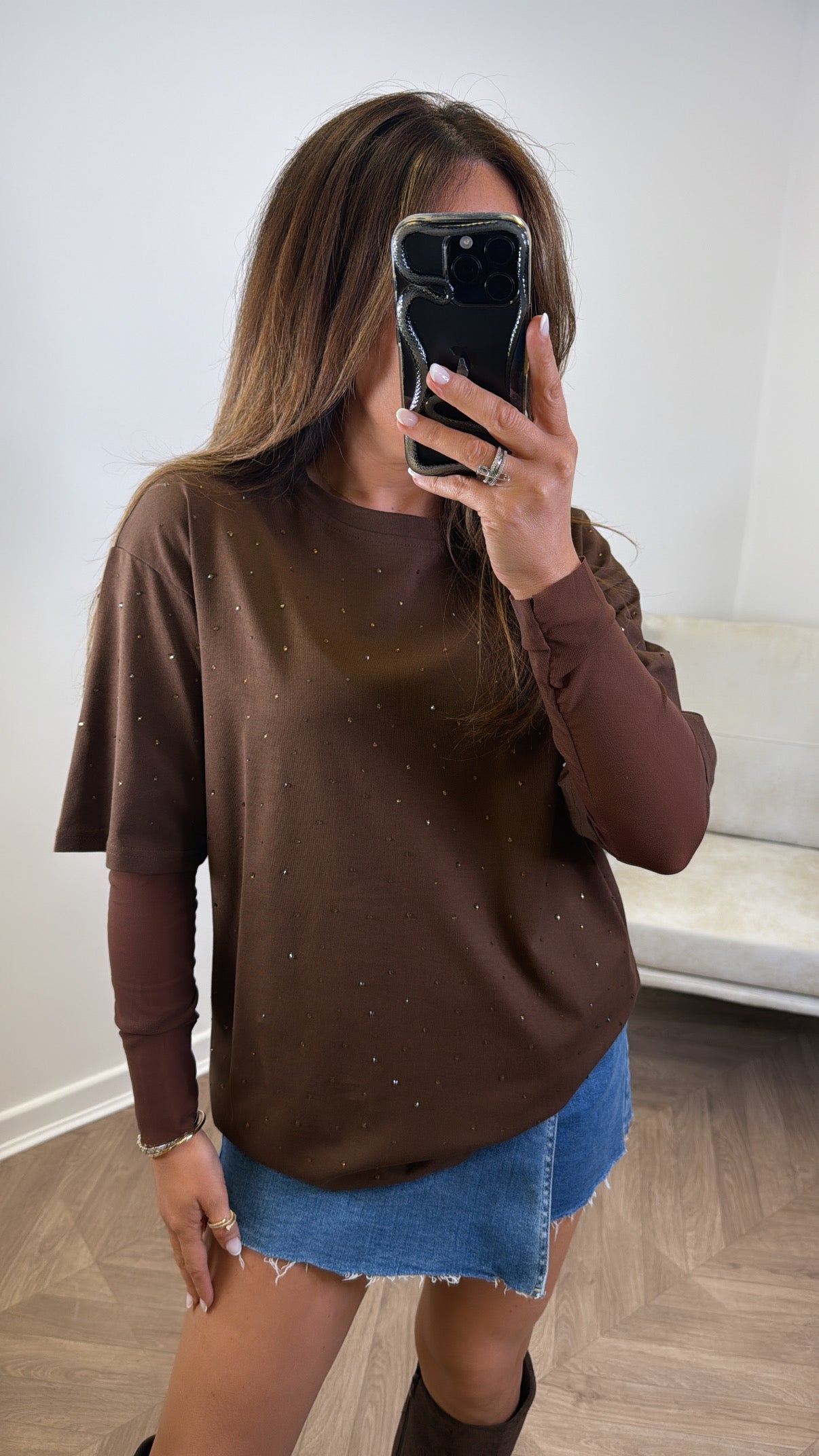 The perfect style fix to take you into new season! In a super soft fabric and mesh detail arms. This tough luxe t-shirt also features tiny embellished jewels.