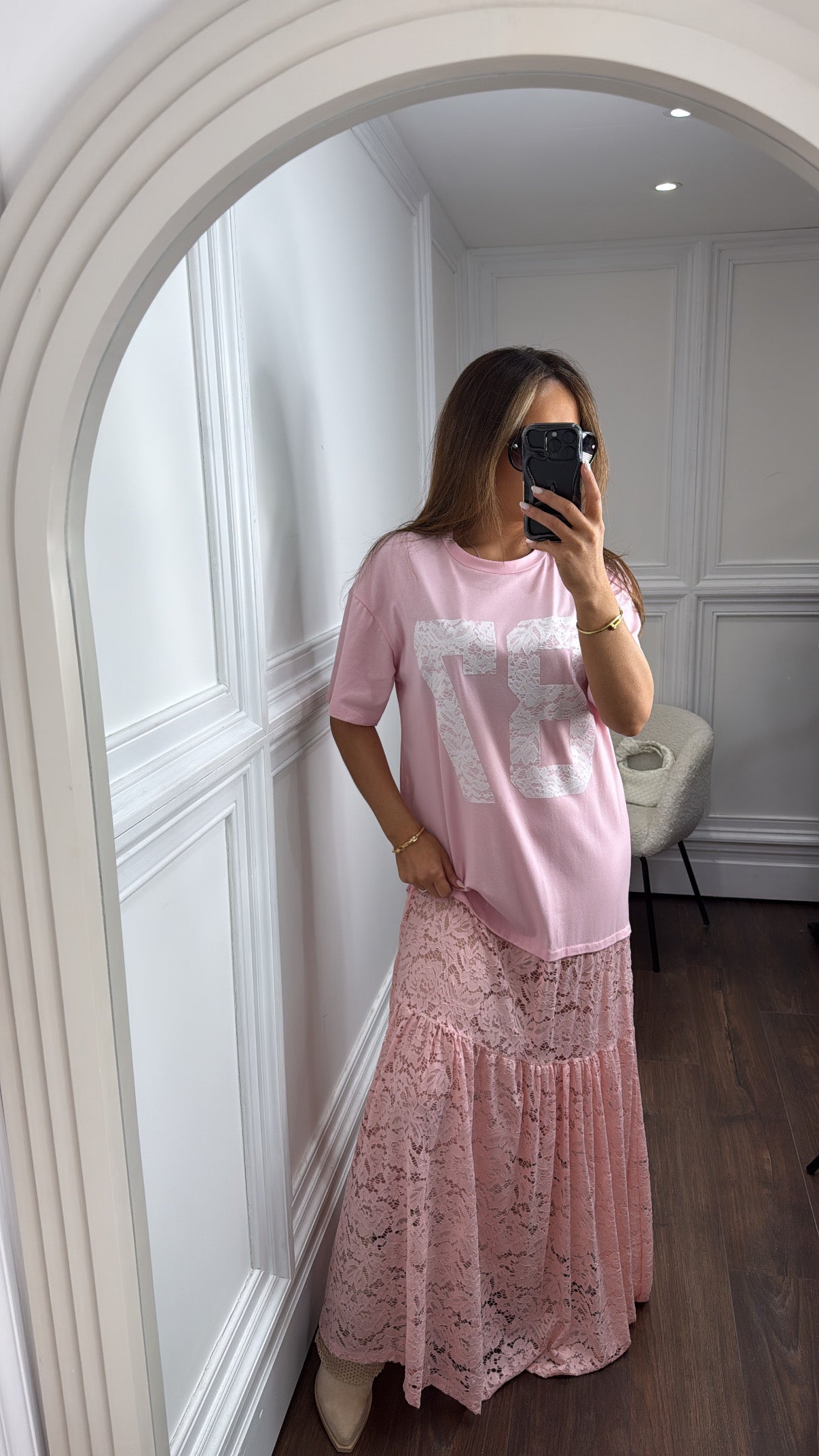 The JESSIE pink 87 lace maxi dress combines super cool vibes with basketball style in its t-shirt top and lace skirt design. Make a fashion statement with this unique and versatile piece.