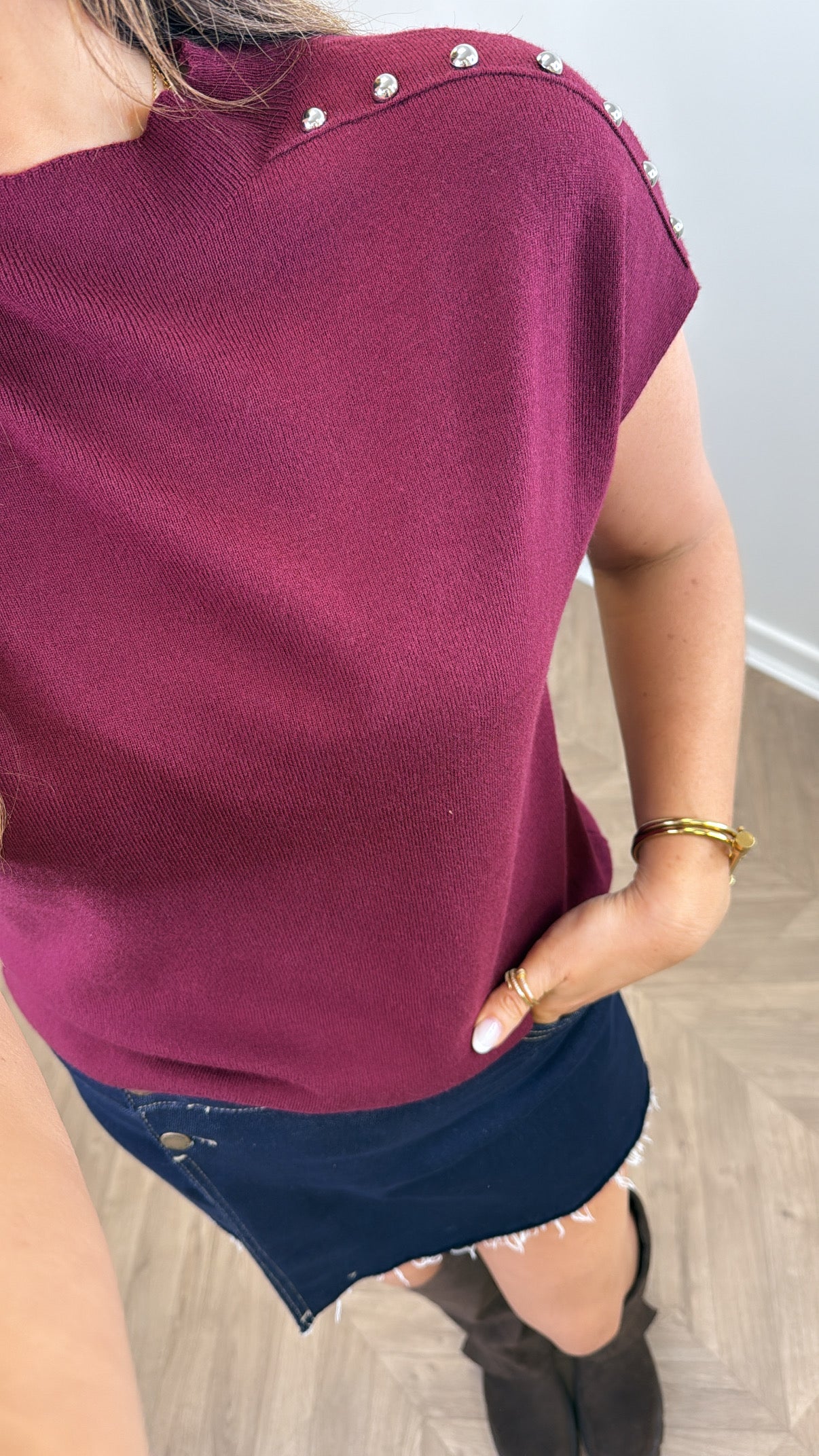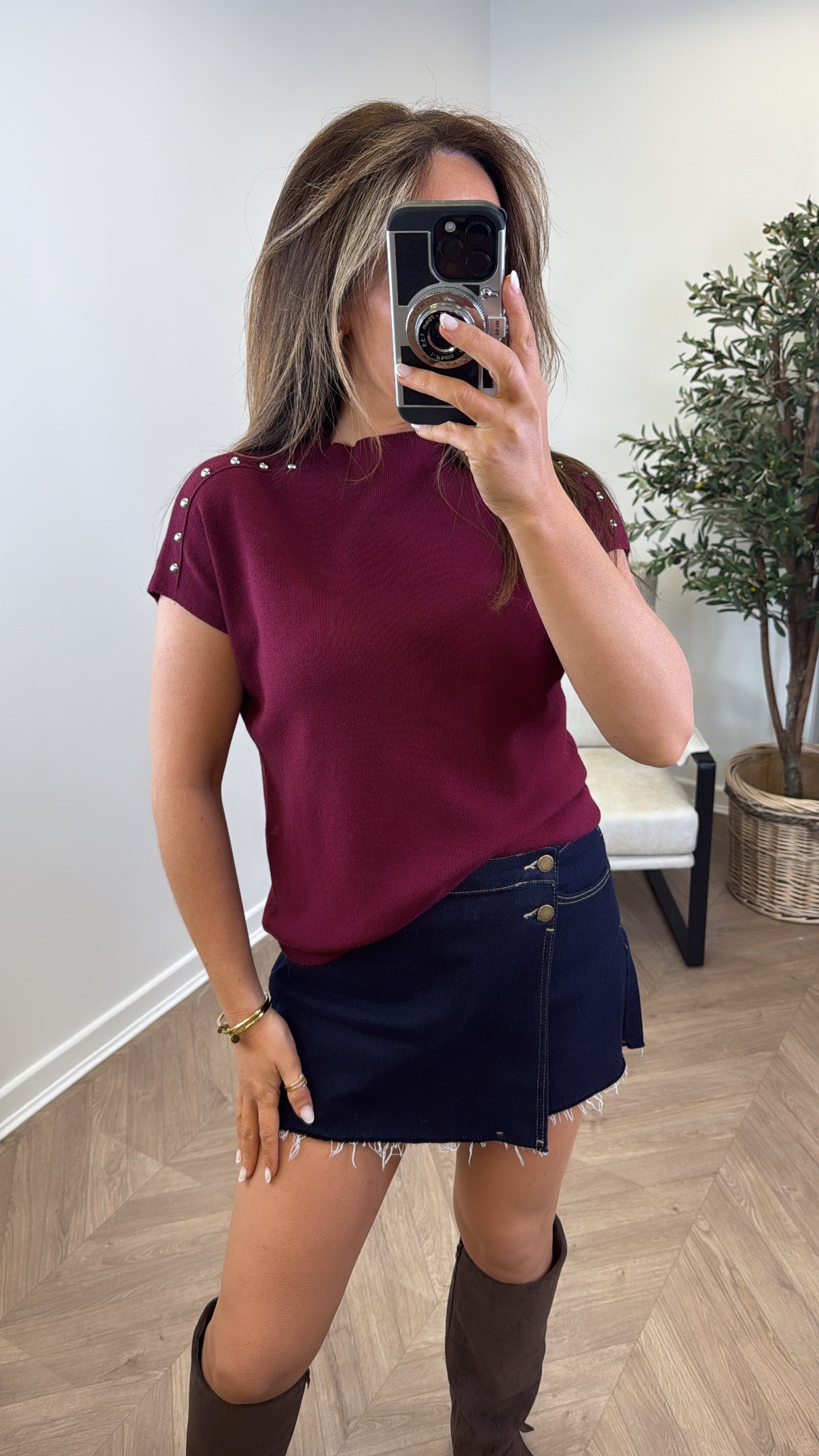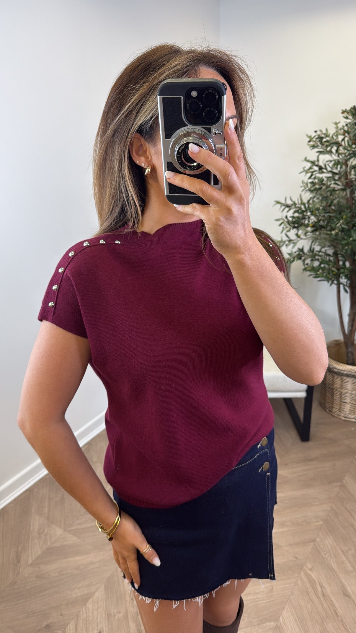 Elevate your wardrobe with the KAYLA burgundy knitted stud detail top. Crafted from fine knit fabric, it features chic silver studs on the shoulders and a graceful high neck. This stylish piece pairs effortlessly with jeans, making it a perfect choice for the new season's refined yet casual looks.