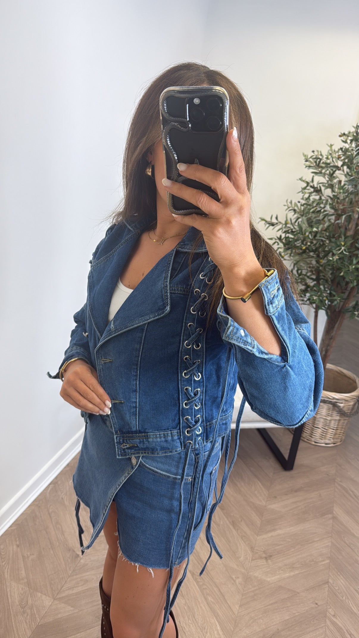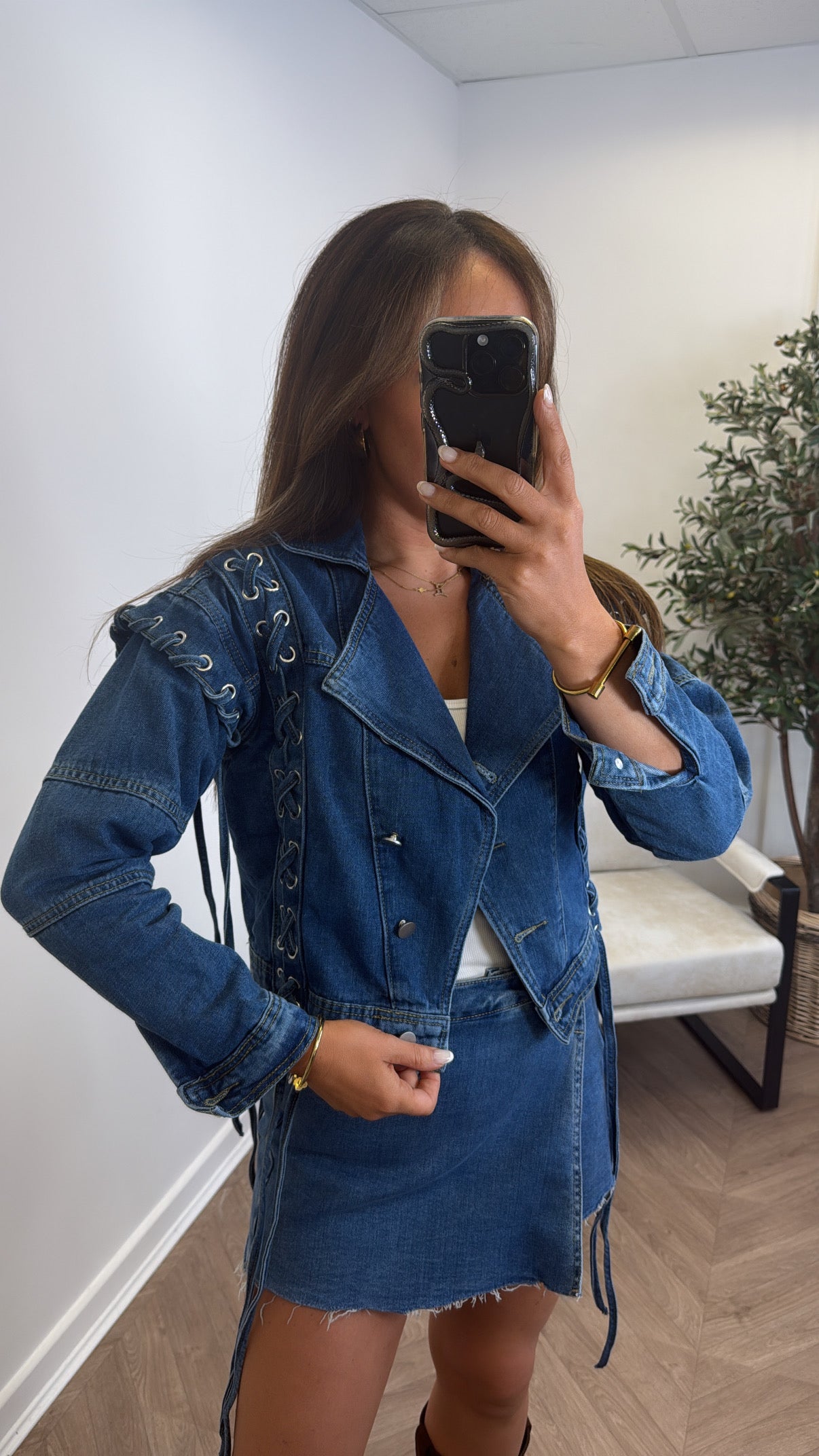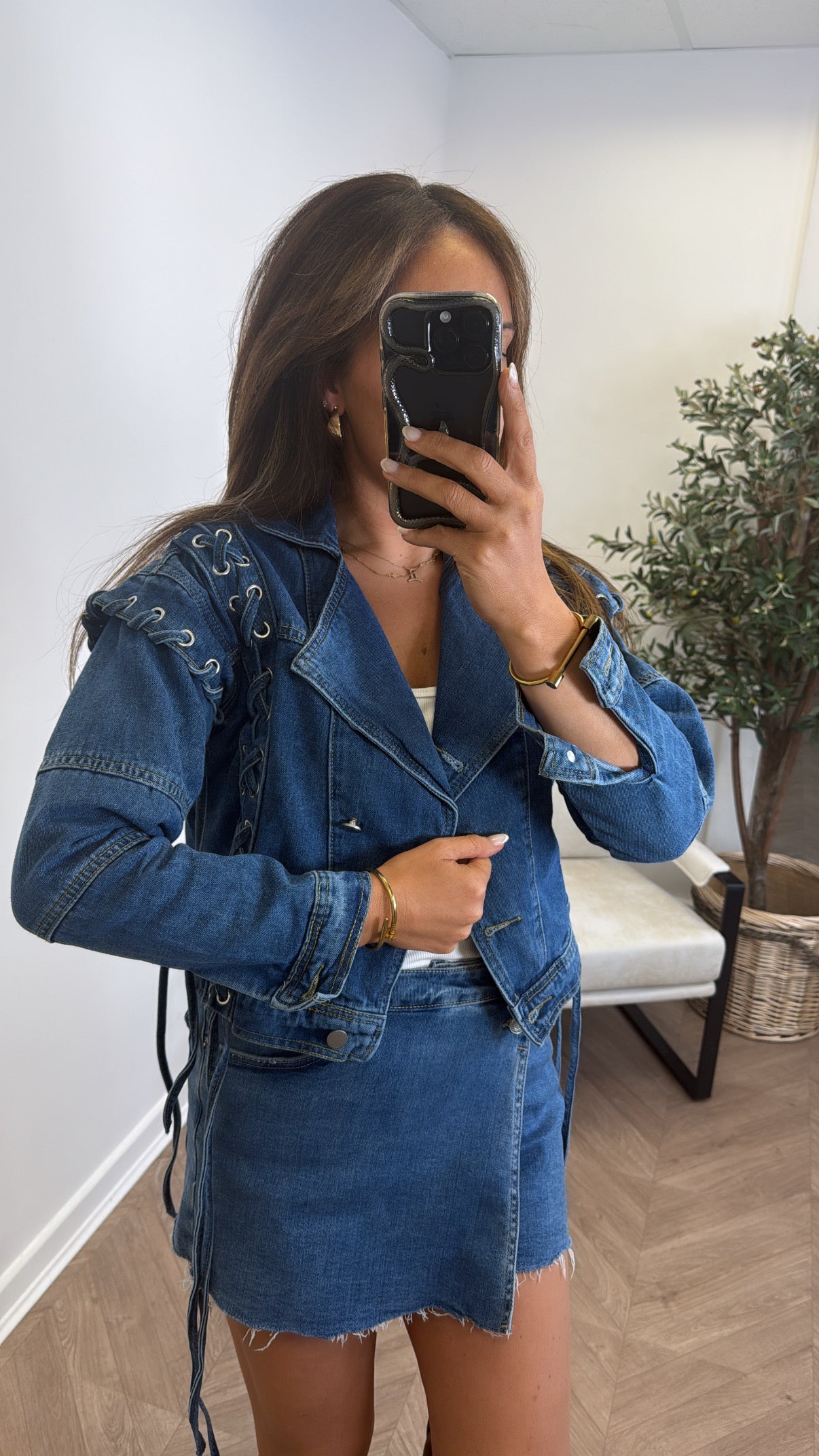 Elevate your wardrobe this season with the LACEY dark blue denim jacket, featuring a stylish lace-up detail and button-up front. Perfect for adding cool, effortless vibes to any outfit, this jacket blends classic denim with modern accents for a fresh, fashion-forward look.