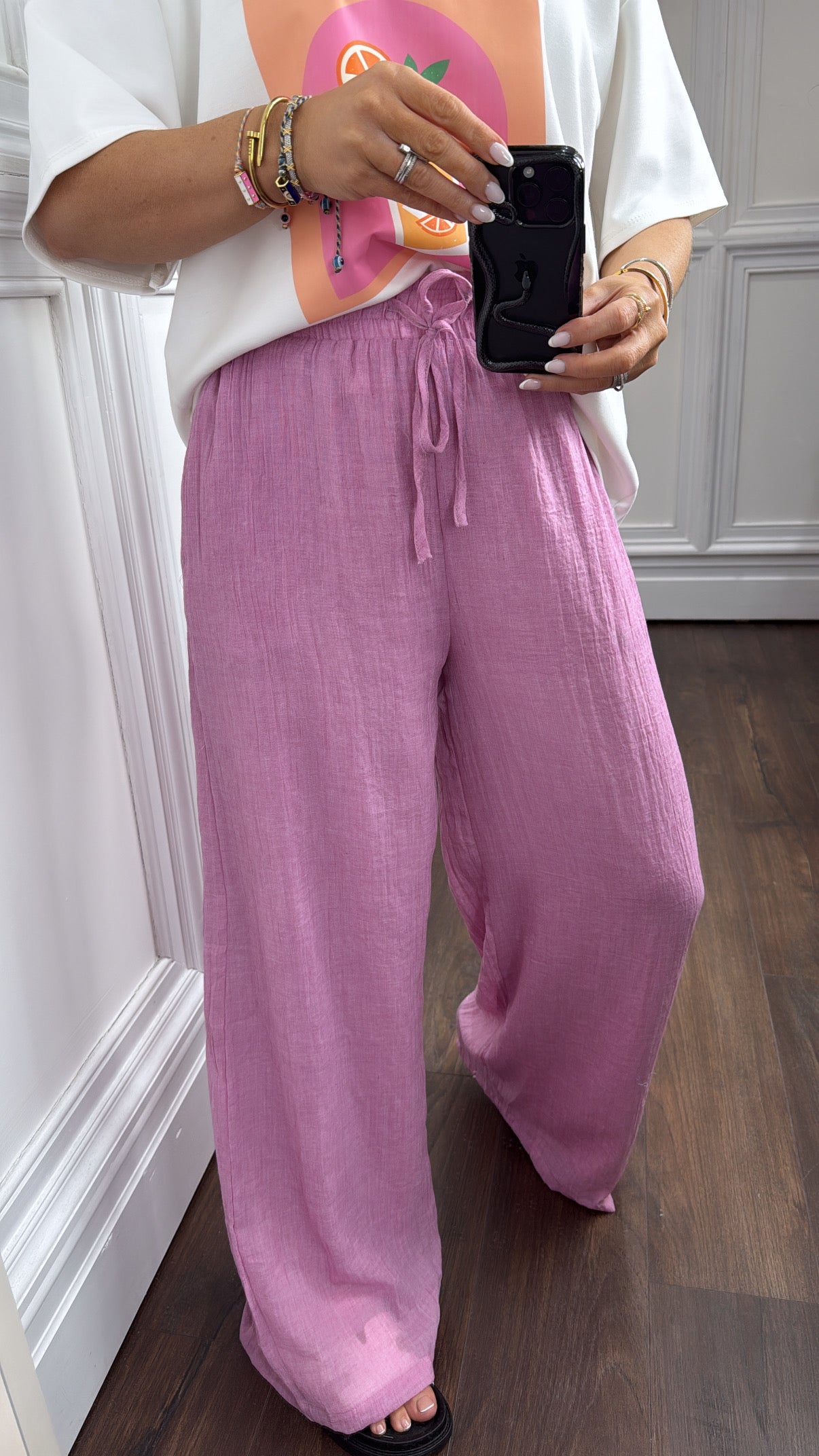 Step into style and comfort with our LARNE pink wide leg trousers. Made with a linen style fabric, these trousers not only look chic but also keep you cool. The elastic waist with a tie string ensures a perfect fit while the pockets add functionality. Elevate your wardrobe with these fashion-forward trousers.