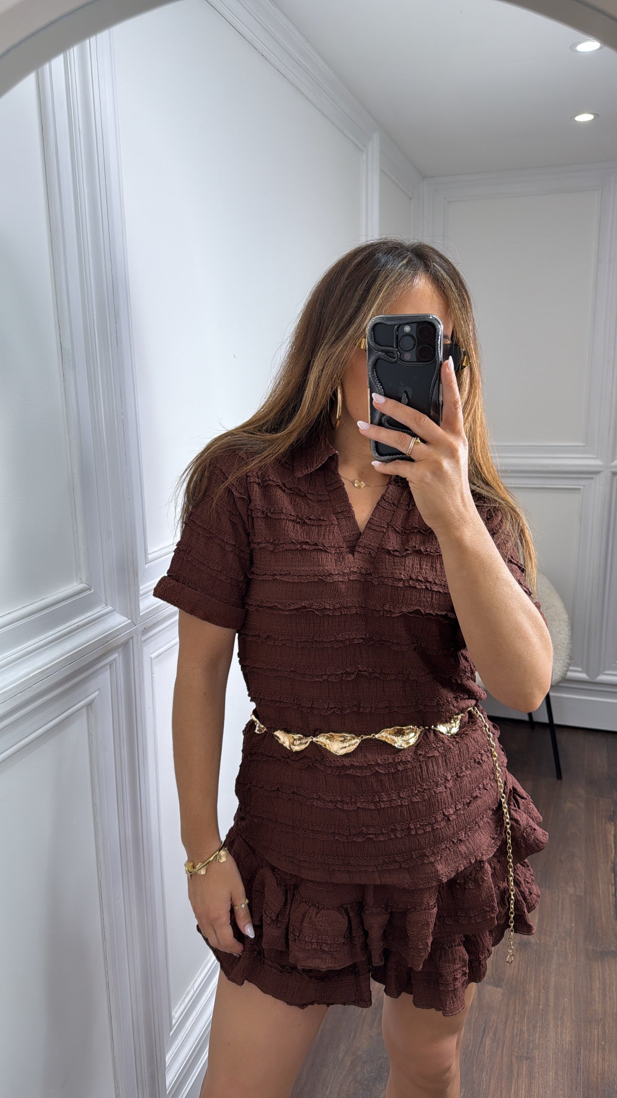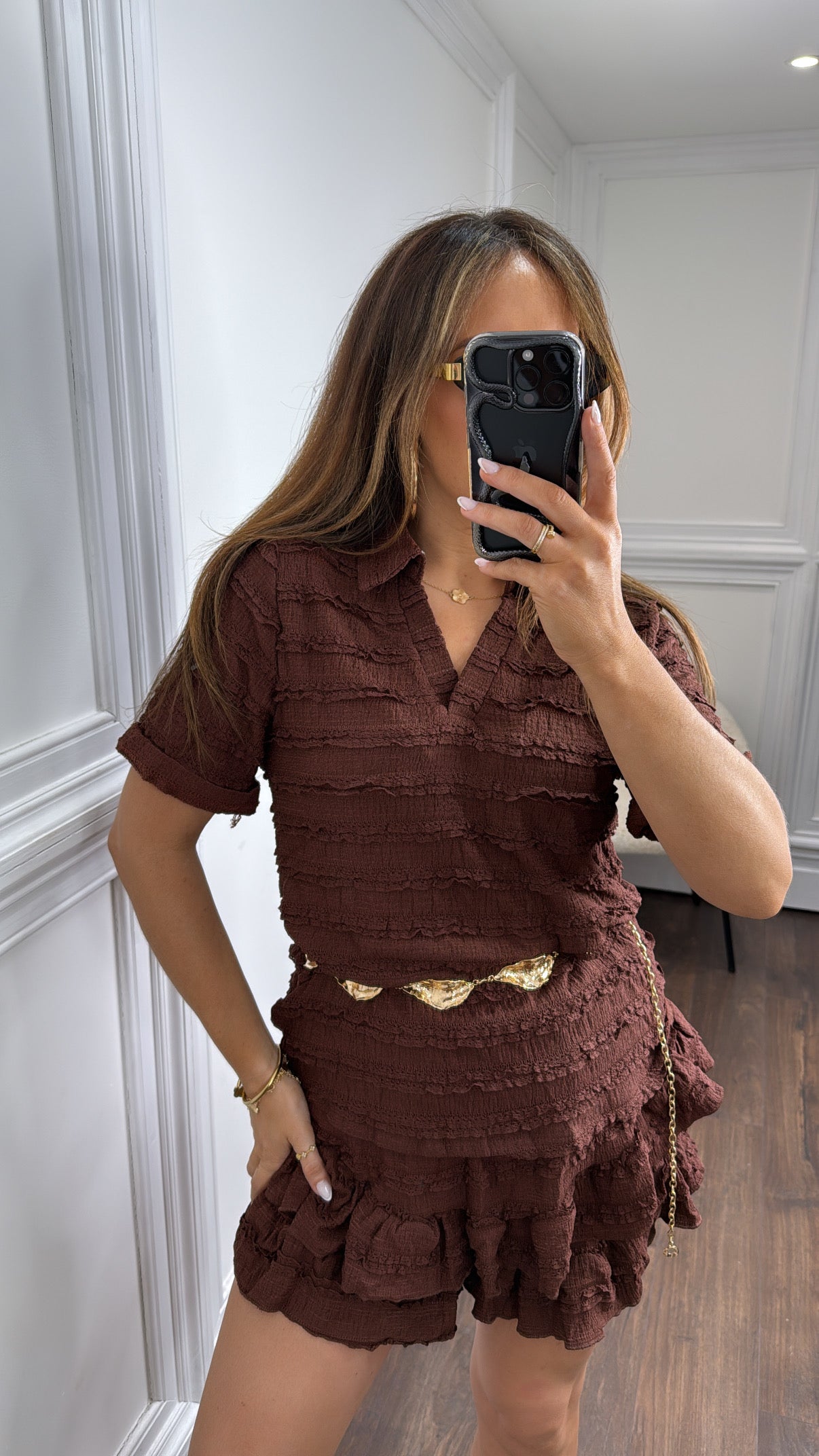 LEXIE brown textured ruffle skort co-ord