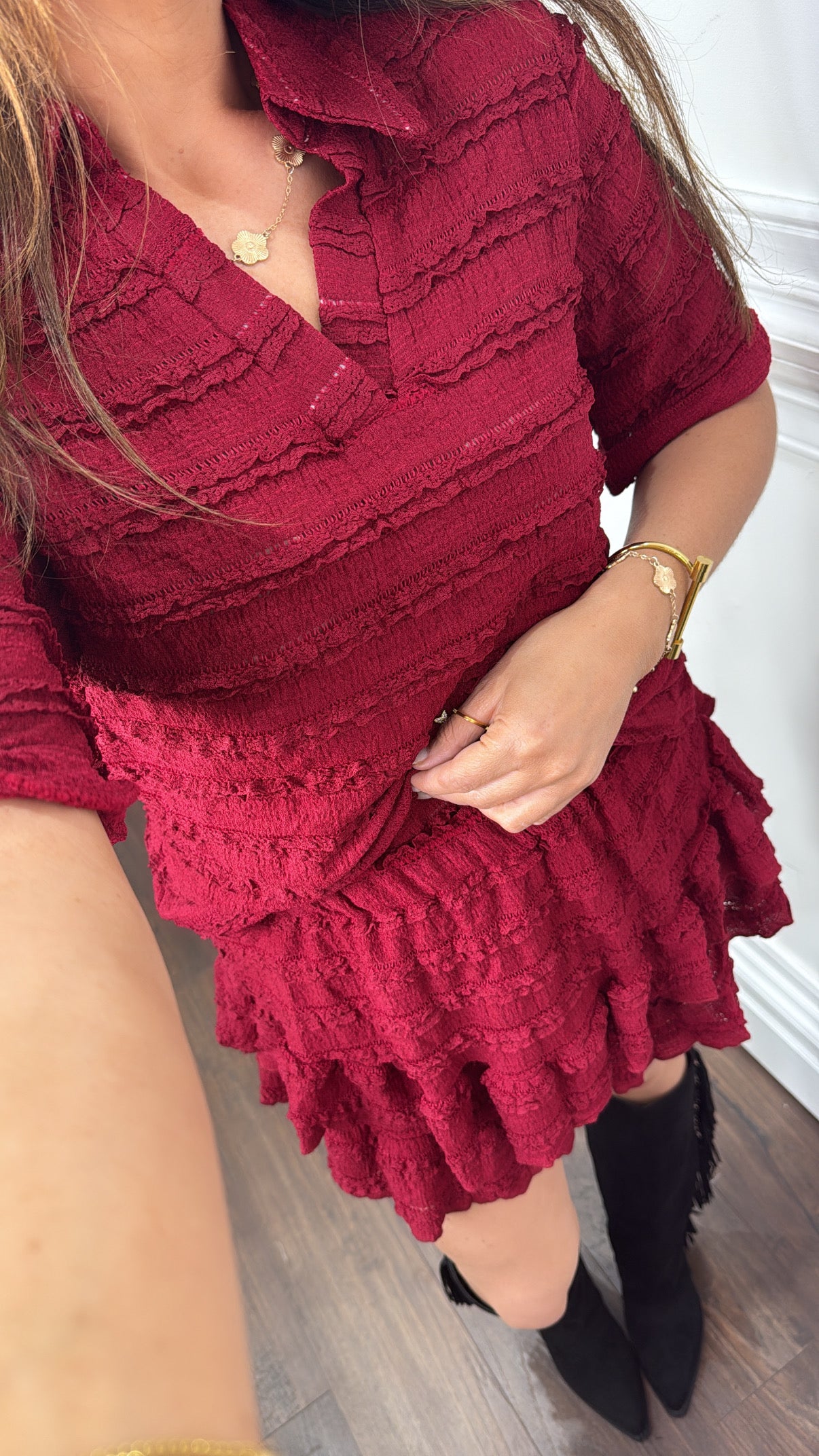 Upgrade your wardrobe with the LEXIE burgundy textured ruffle skort co-ord. This super cute and classy set features ruffle detailing and comes with matching shorts for a fashion-forward look. Elevate your style and turn heads with this must-have piece.