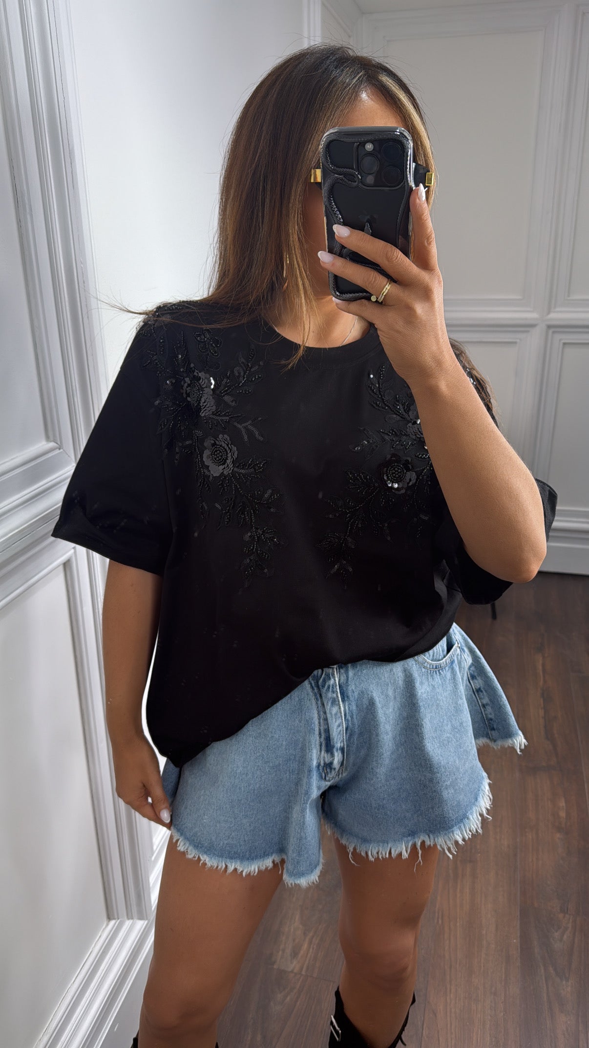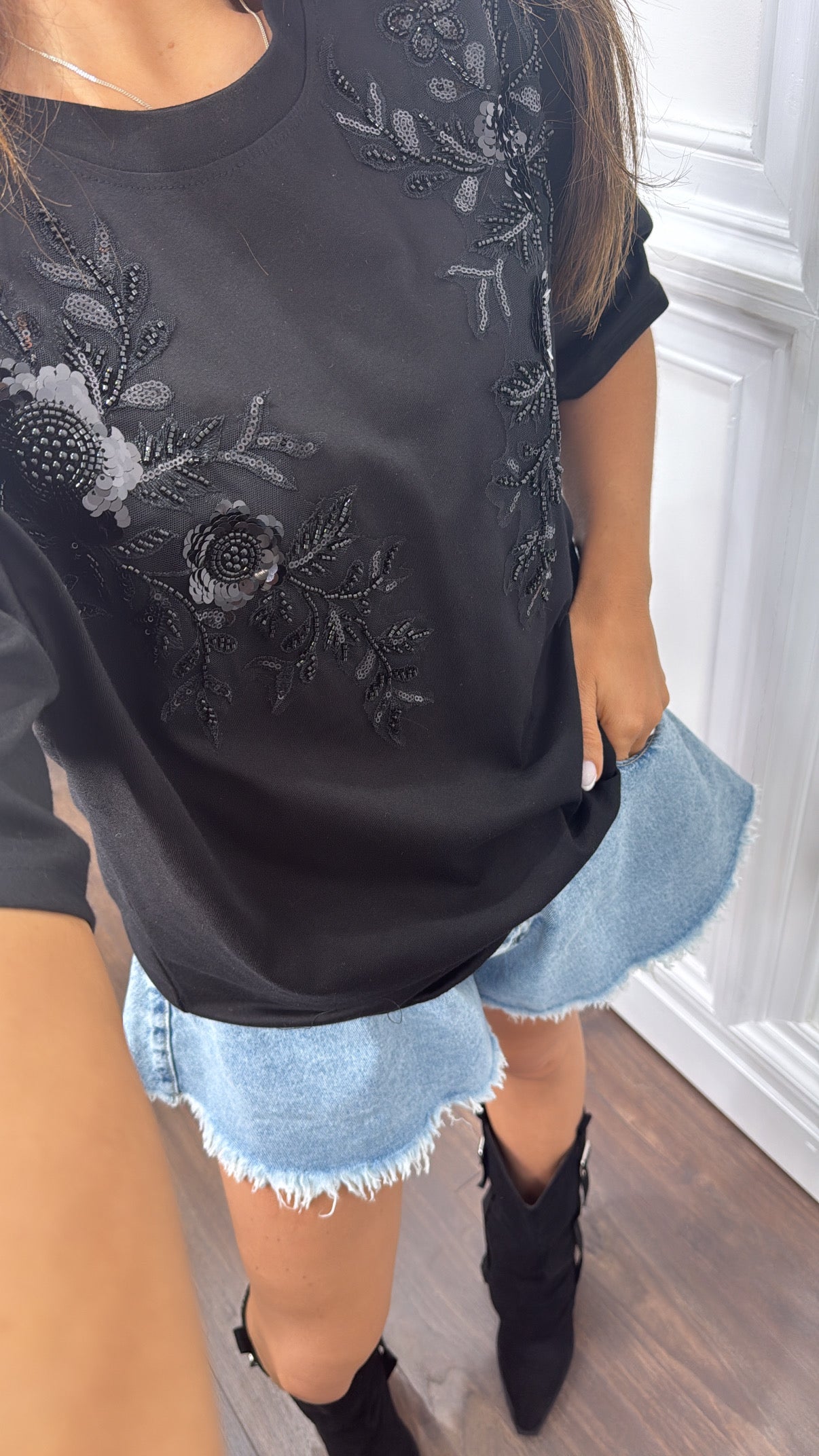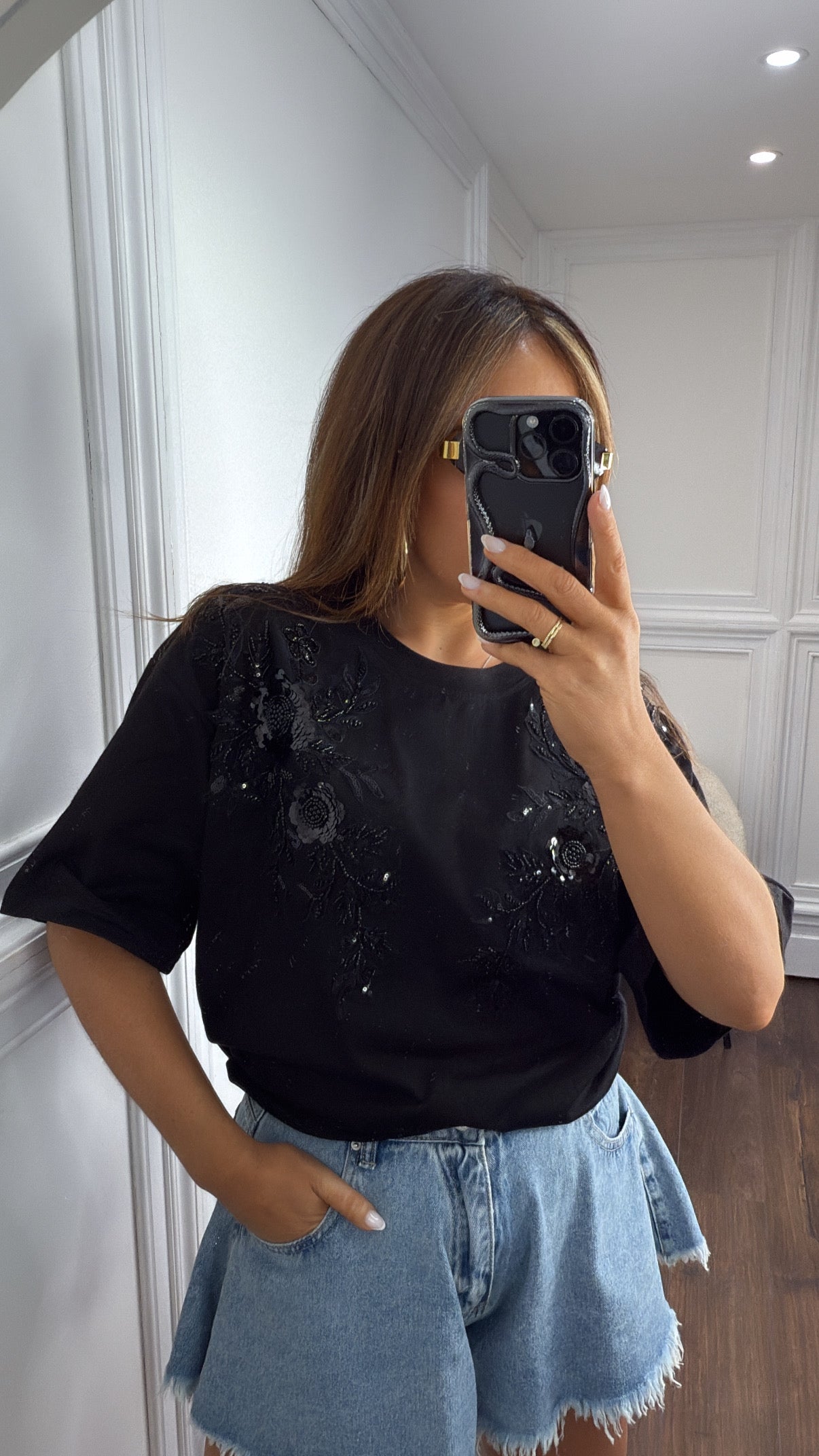Elevate your casual wardrobe with the LOLITA black floral beaded tshirt. This statement piece features an exquisite sequin and beaded floral design that catches the light with every movement. Crafted from a premium fabric that feels luxurious against the skin, this tshirt effortlessly transitions from day to evening wear. The intricate embellishments add a touch of glamour to the classic silhouette, making it a versatile addition to your style collection.