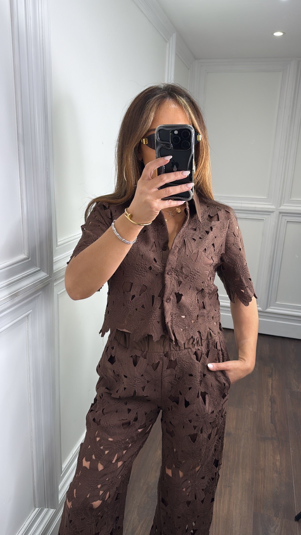 Elevate your wardrobe with the LORNA brown crochet trouser co-ord, featuring intricate full crochet detailing that exudes sophistication. The trousers are thoughtfully lined with shorts for comfort and coverage, creating a smart luxe look perfect for stylish occasions. This co-ord effortlessly blends elegance with modern fashion, making it a standout choice for those who appreciate refined craftsmanship.