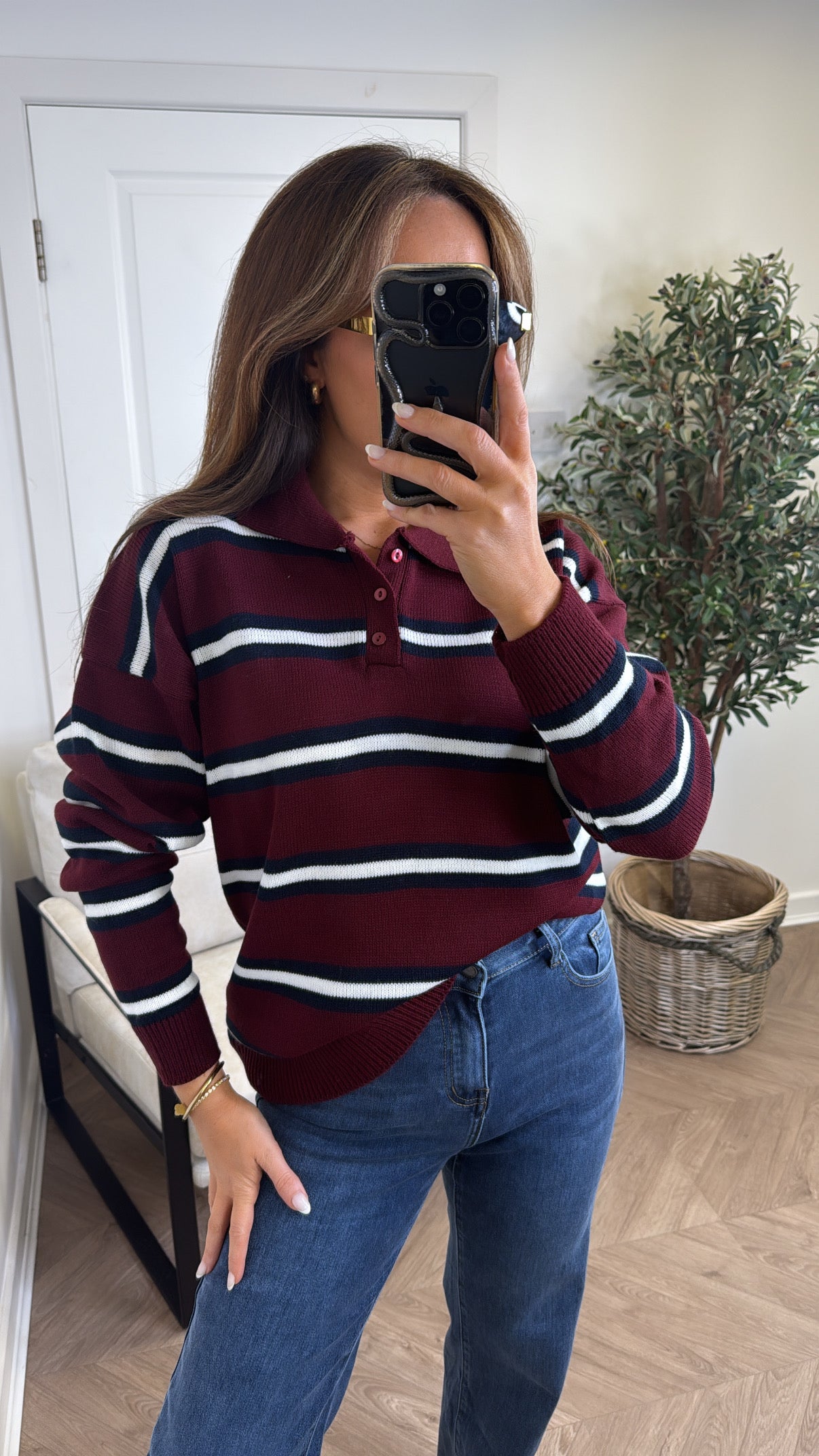 Embrace the new season with the LOUISE burgundy stripe knitted polo jumper. Crafted from a soft knit fabric, it features a stylish base accented by navy and white stripes. The classic polo collar and long sleeves add a polished, timeless touch, making this jumper a versatile wardrobe staple that blends comfort with effortless style.