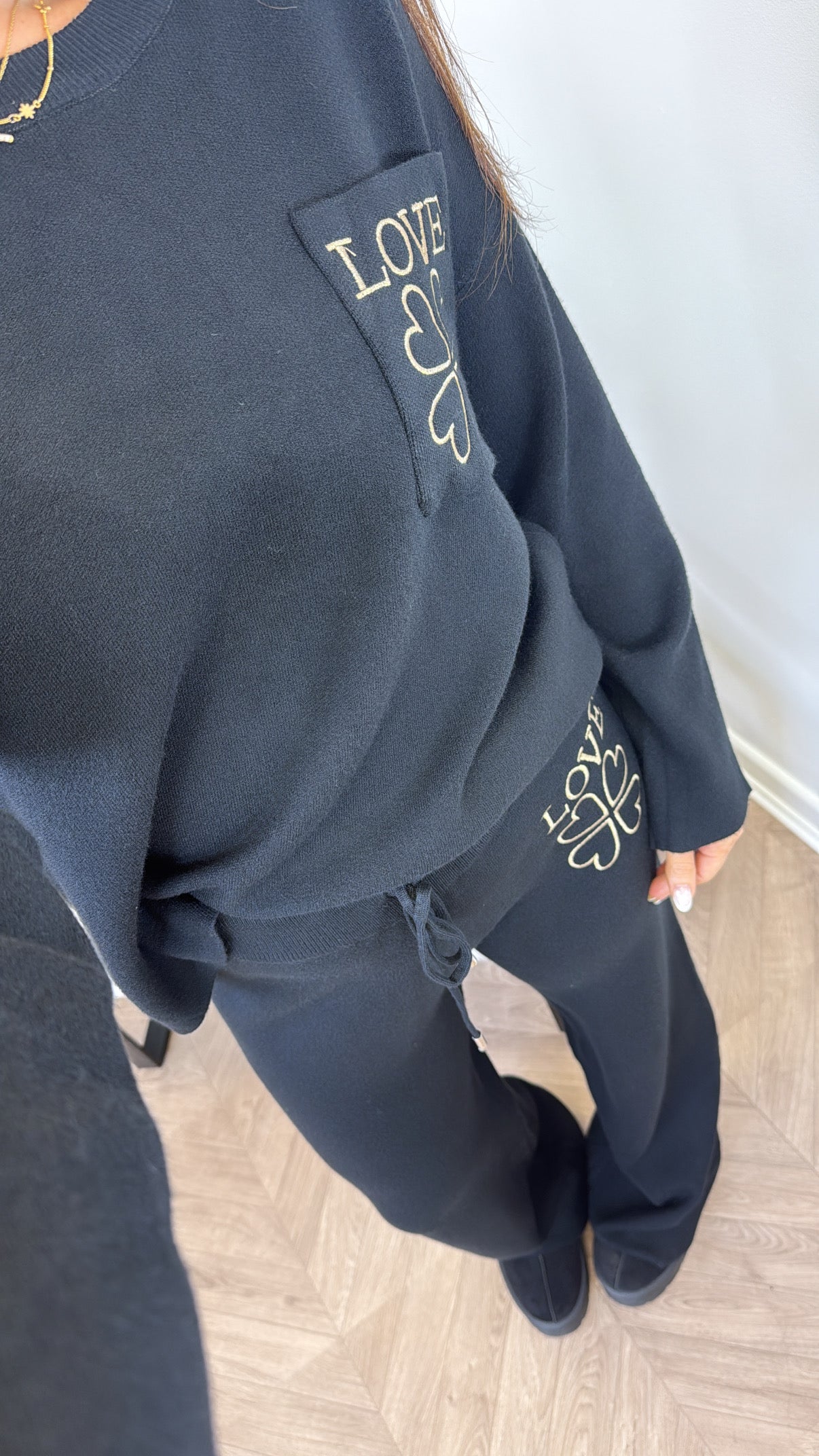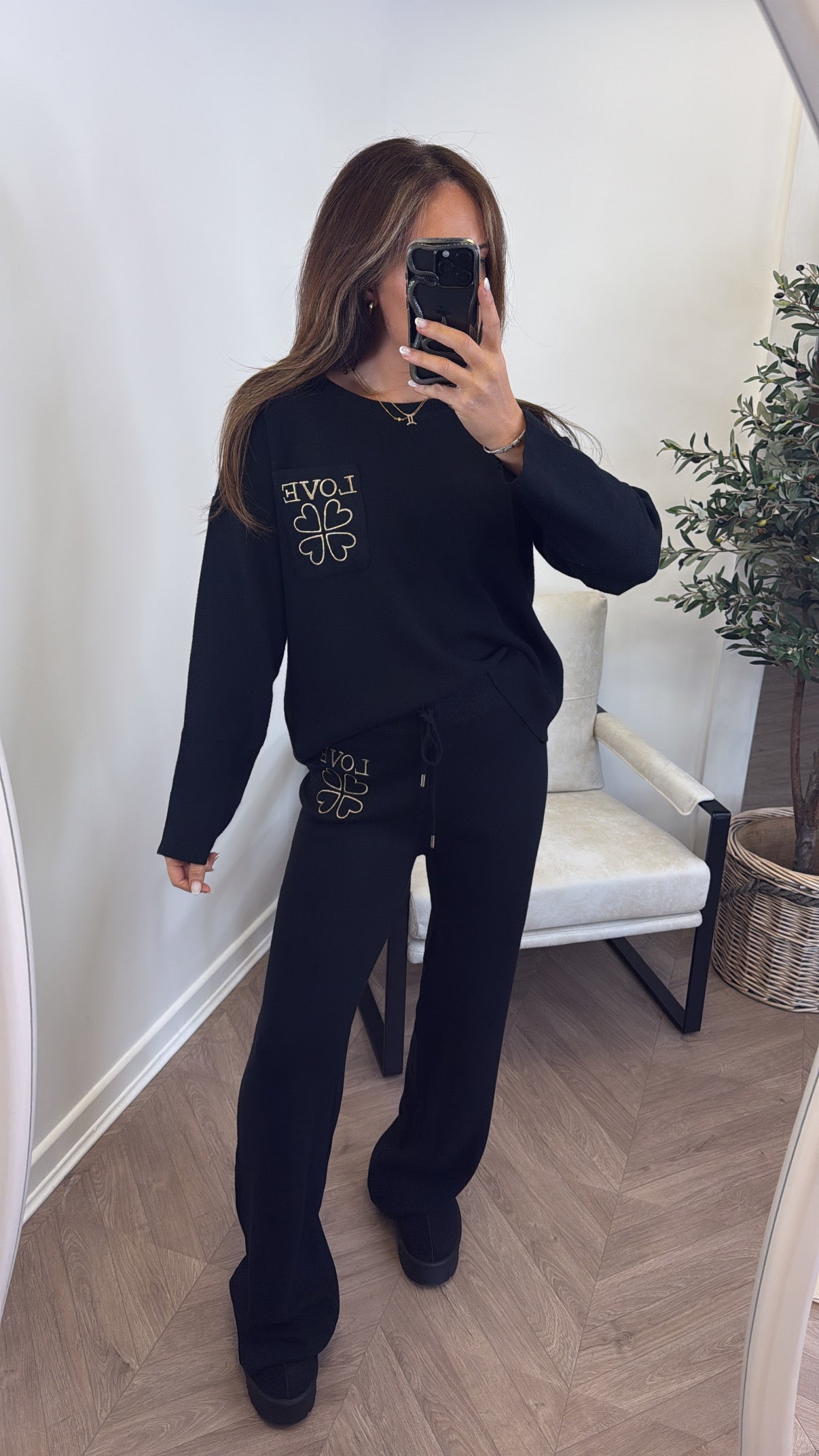 Experience effortless style and comfort with the LOVE black embroidered lounge set. Crafted from soft, breathable fabric, this set offers a comfy fit ideal for relaxing or casual outings. The elegant black tone and delicate embroidery add a subtle touch of fashion-forward detail to your loungewear collection. Perfect for those who value both comfort and chic simplicity.