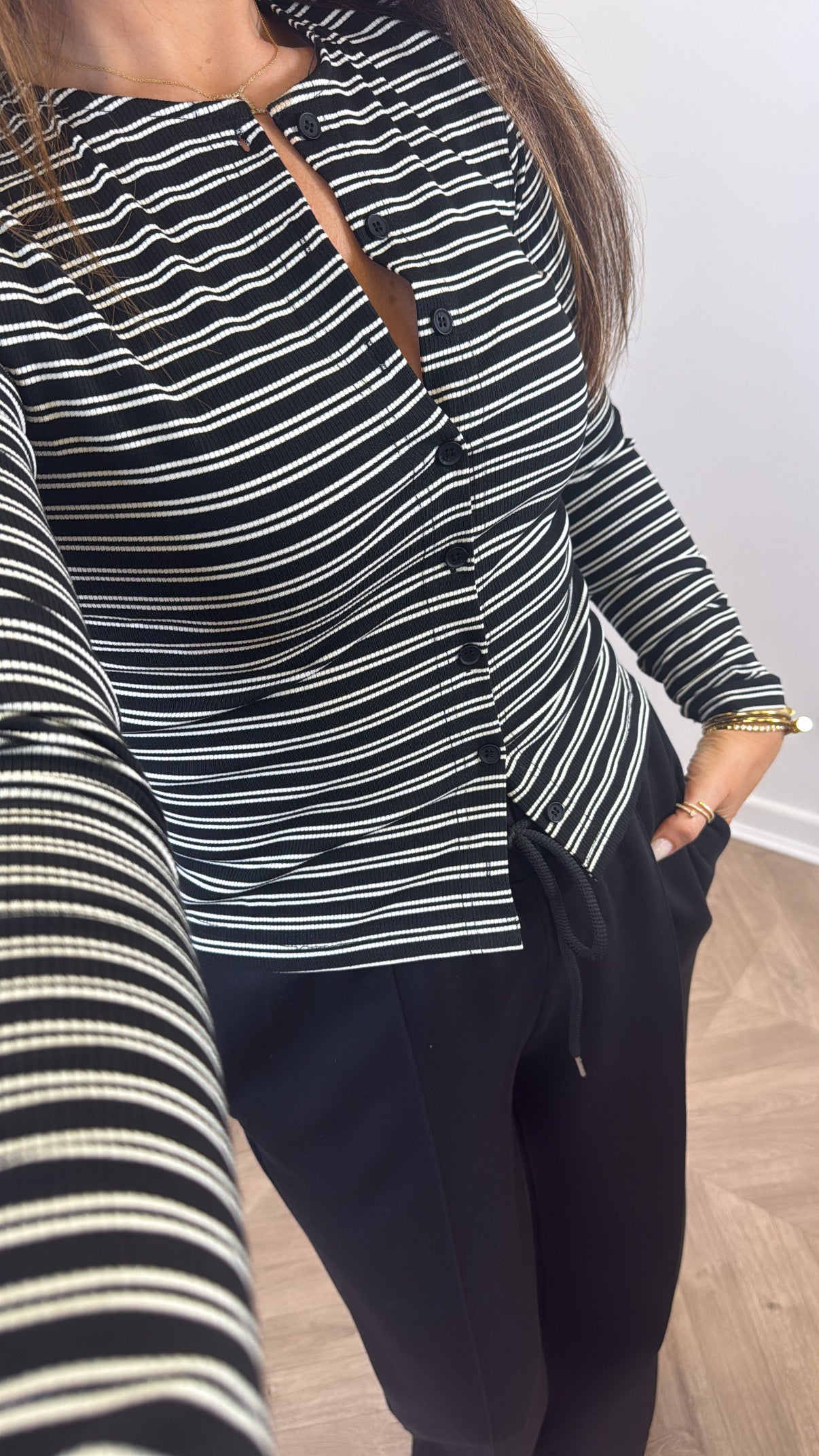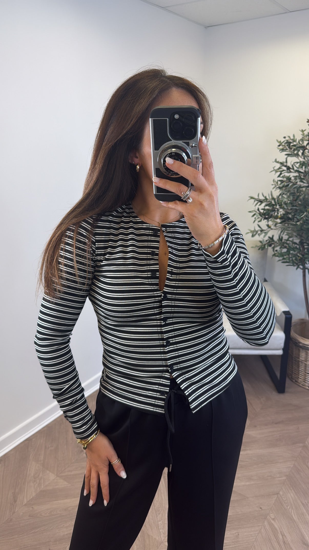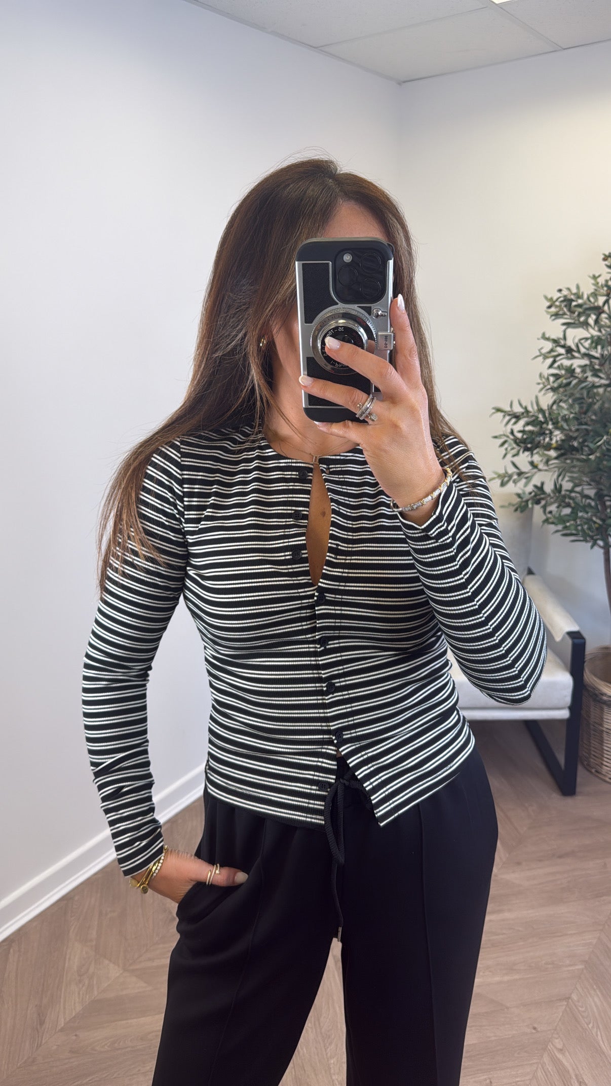 The LUCIE black stripe half button-up top blends classic style with a modern edge. Featuring long ribbed sleeves and a striking black base with crisp white stripes, it offers a sleek silhouette perfect for layering or standing out on its own this season. The half button-up design adds a chic touch, balancing comfort and fashion effortlessly.