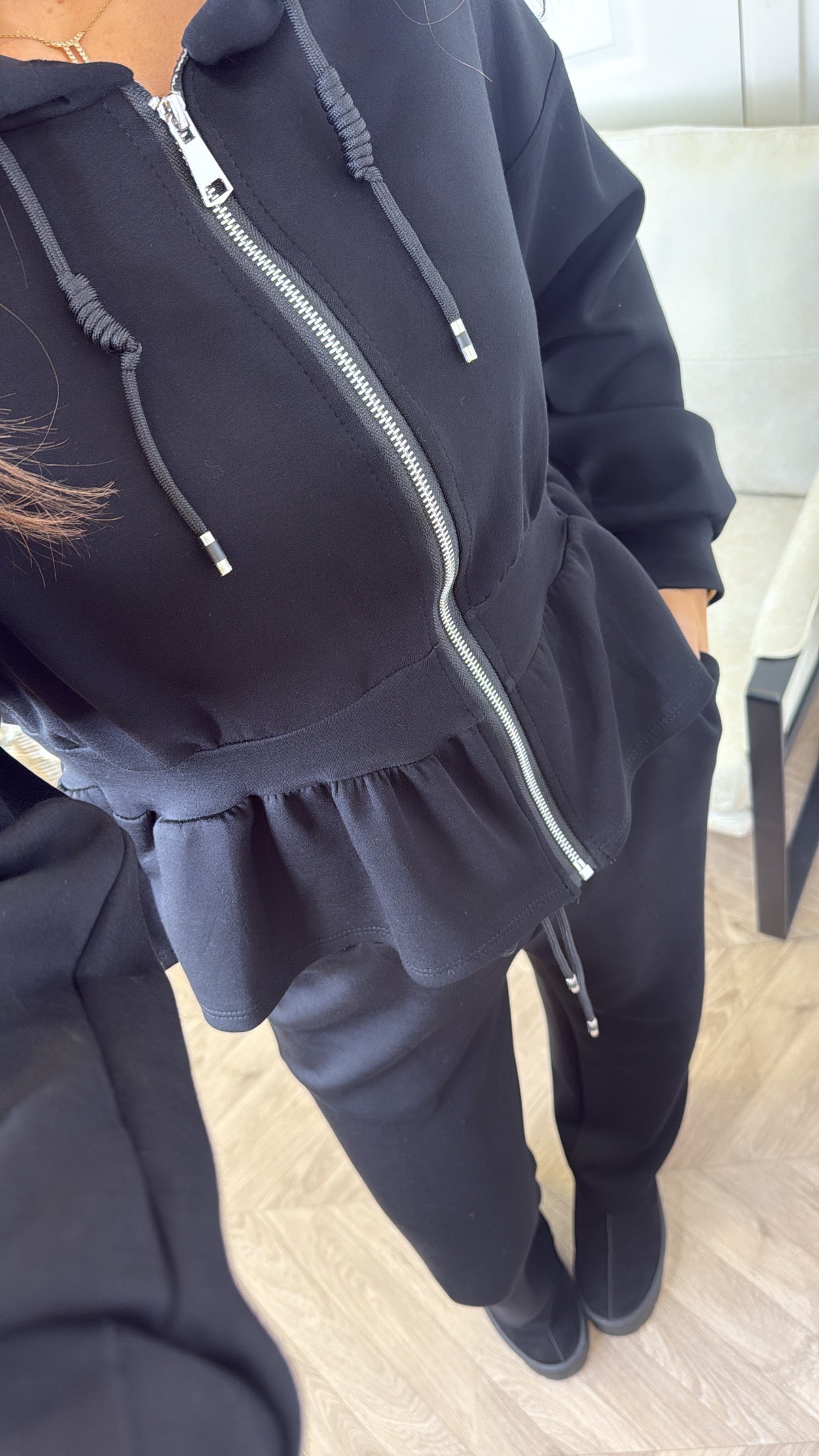 Elevate your style with the LUELLA black peplum jacket and trousers co-ord. The jacket features a flattering peplum waist and a sleek zip-up front, crafted from soft, comfortable fabric. Paired with wide-leg joggers that have an elasticated waist, this set combines tailored elegance with relaxed comfort for a chic, modern look.