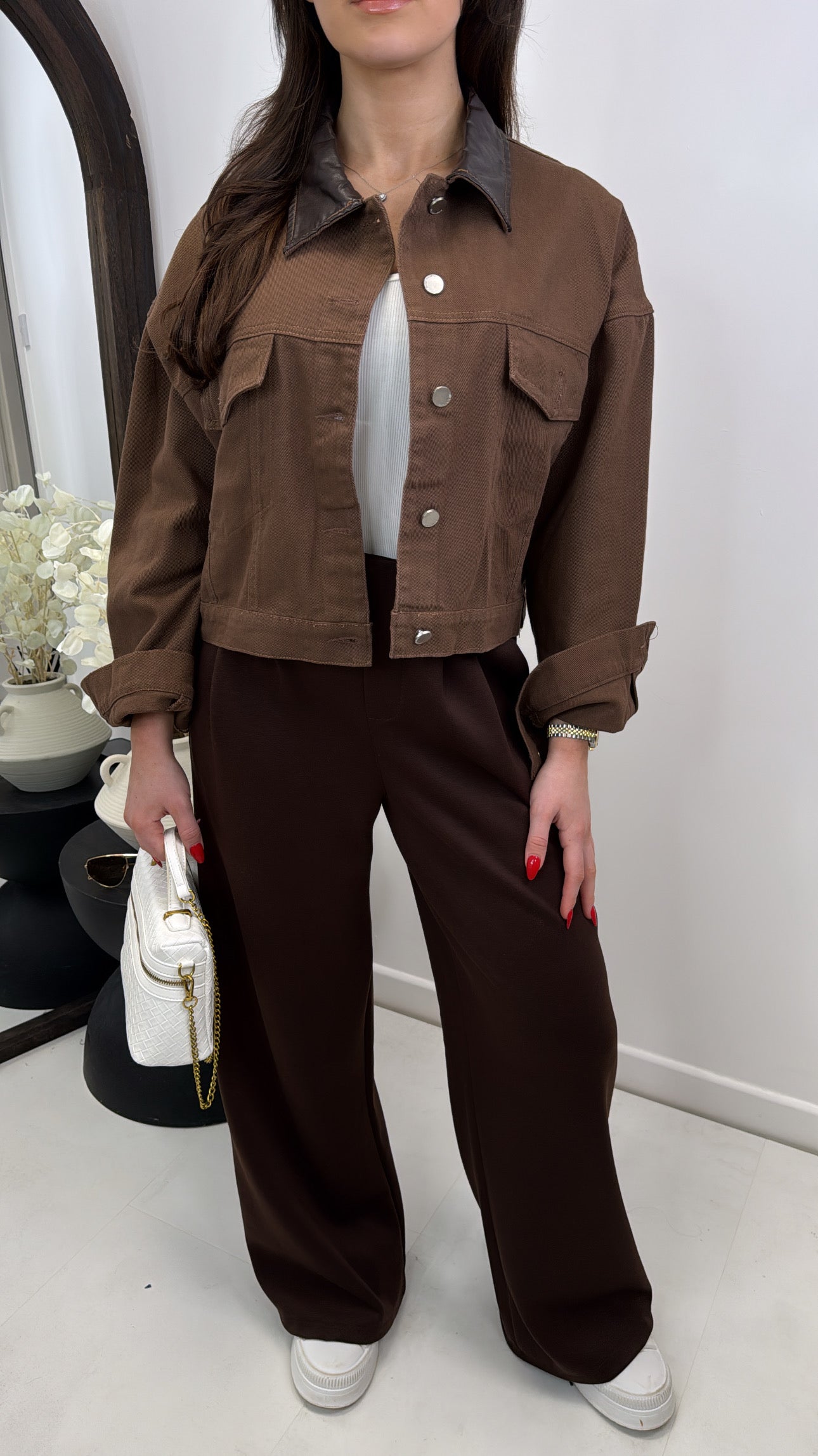 Elevate your casual wardrobe with this charming brown denim jacket. Crafted with a soft faux leather collar, it delivers that coveted structured look with a modern twist. The classic button-down front pairs perfectly with practical pockets for everyday convenience. Whether you're layering over a dress or pairing with jeans, this versatile piece brings effortless style and personality to any outfit.