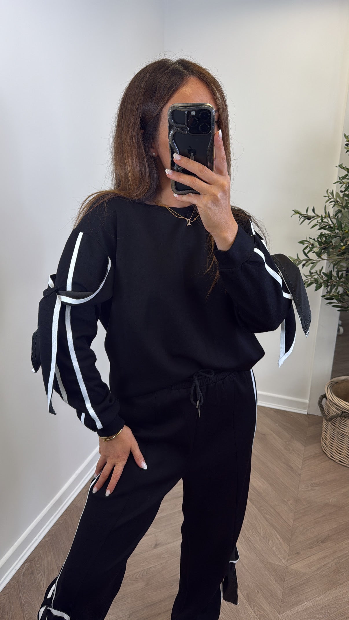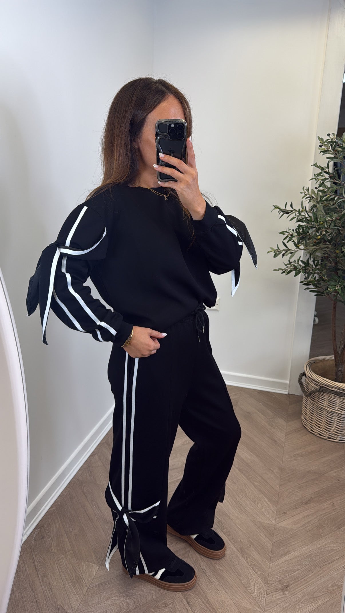 This new season MAISIE tracksuit combines style and comfort with its black jumper and wide-leg joggers. The round neck jumper features chic tie details on the arms, while the joggers showcase matching ties at the legs. White contrast stripes add a striking edge, making this set perfect for relaxed yet fashionable looks.
