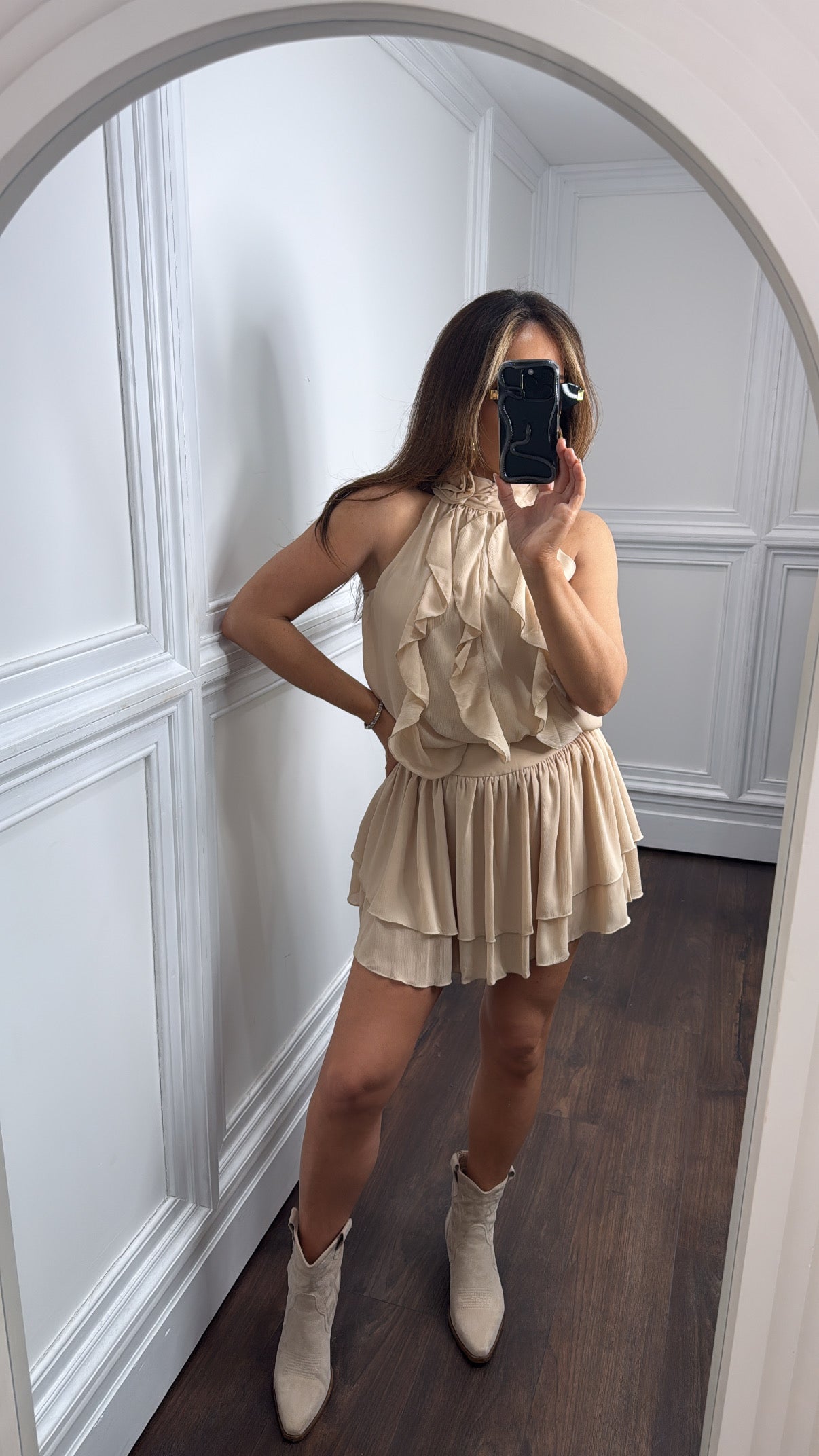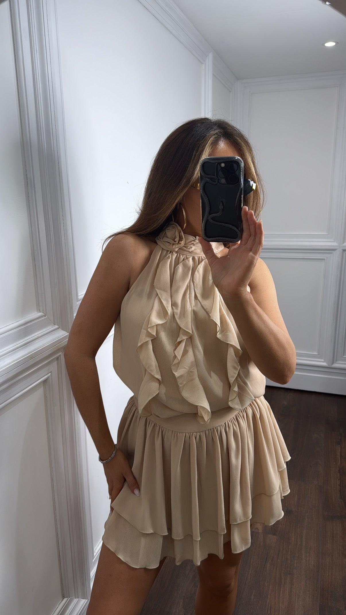 This stylish beige co-ord features a playful ruffle skort paired with a chic top adorned with a delicate corsage detail at the neckline. Designed with a convenient zip fastening, it offers both comfort and a flattering fit. Perfect for making a fashionable statement with effortless charm.