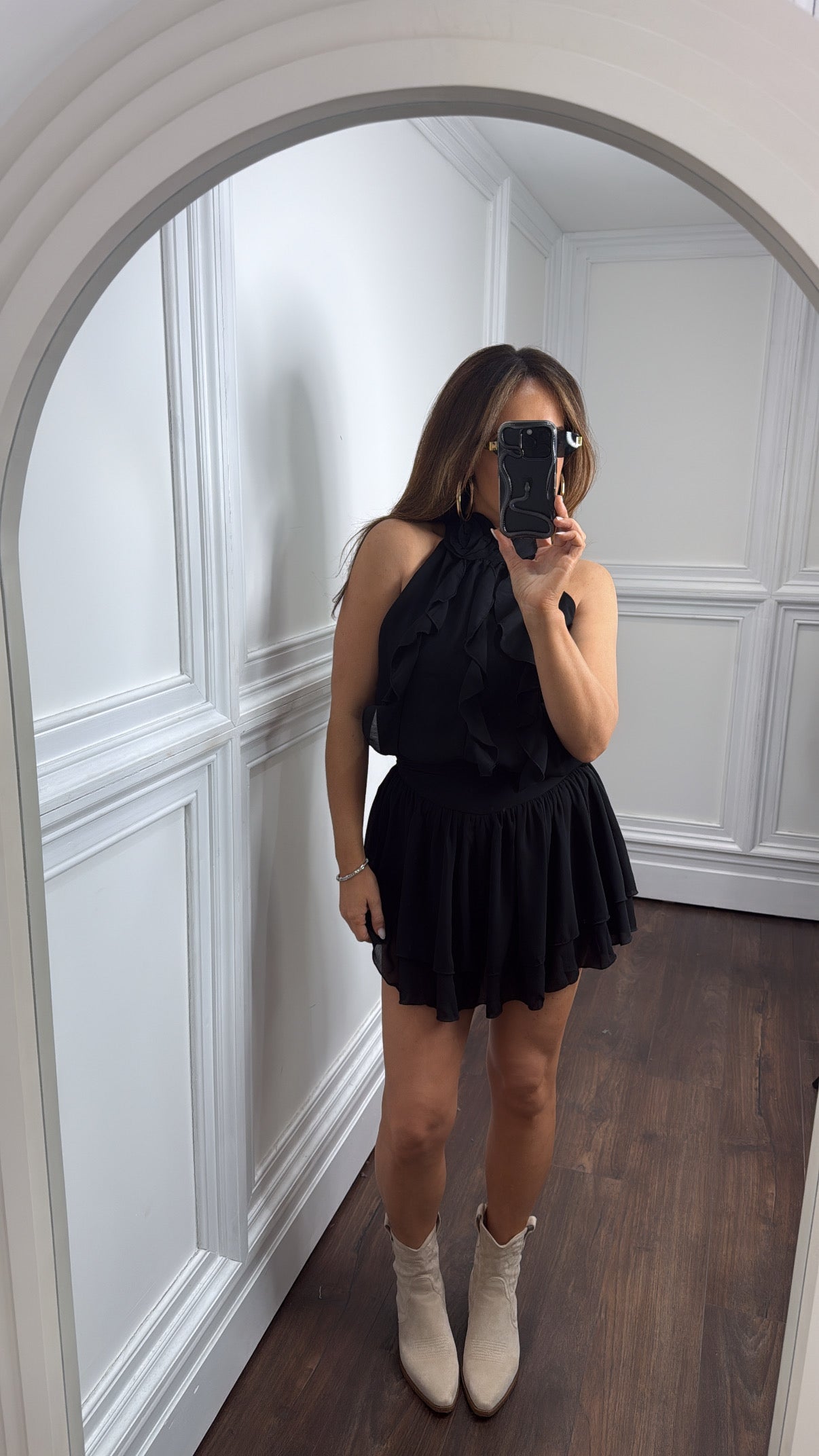This stylish black co-ord features a playful ruffle skort paired with a chic top adorned with a delicate corsage detail at the neckline. Designed with a convenient zip fastening, it offers both comfort and a flattering fit. Perfect for making a fashionable statement with effortless charm.