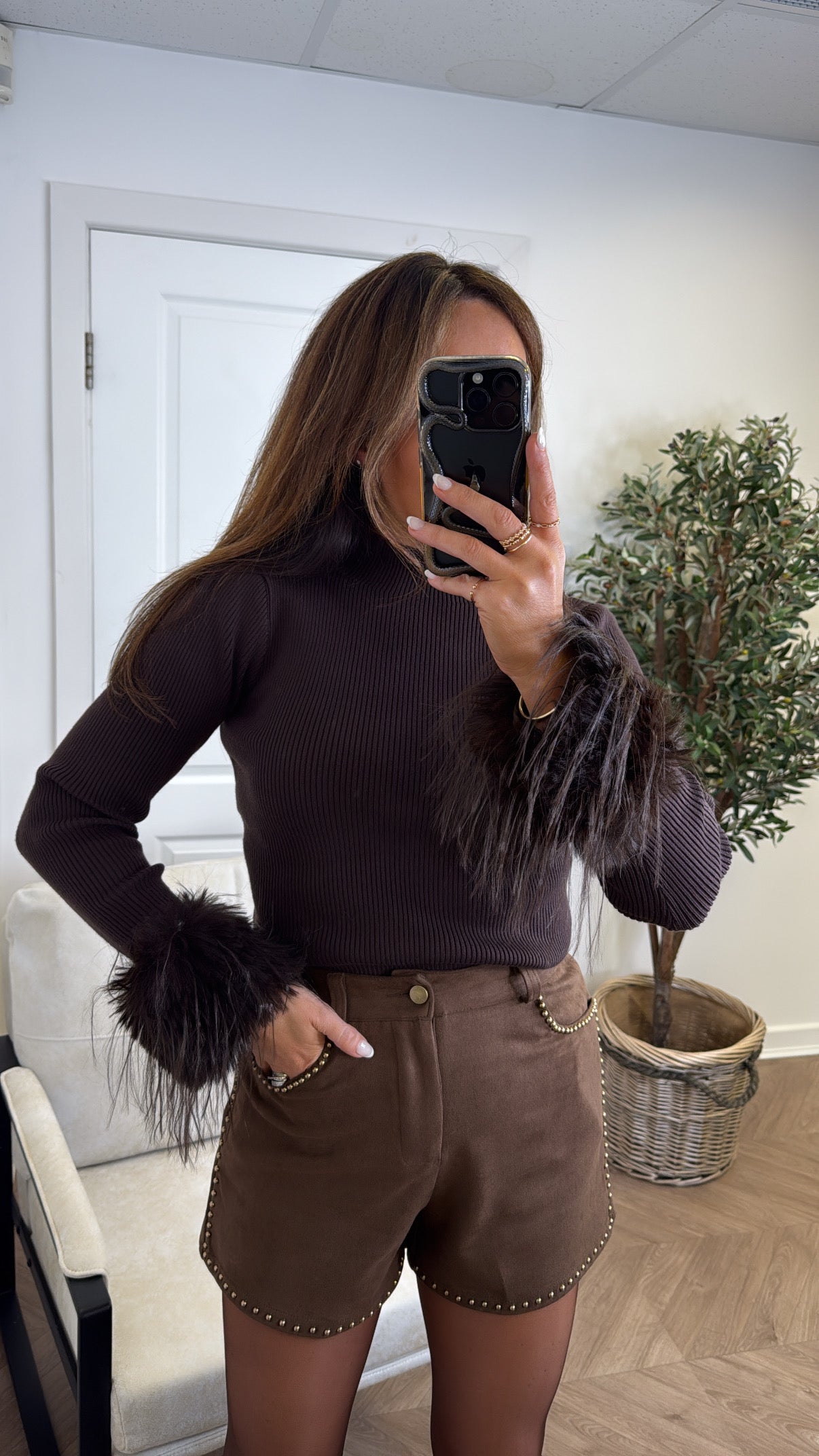 This MILLY brown ribbed top features a fitted silhouette that complements your shape, paired with luxe fluffy cuffs for an elegant, textural contrast. Crafted from stretchy fabric, it offers comfort and ease of movement while elevating any outfit with a chic, fashionable edge.