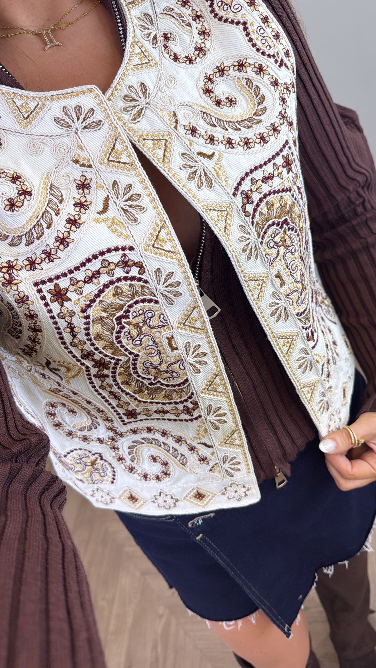 Elevate your festival look with the MILLY cream embroidered waistcoat. Featuring intricate embroidered details, this waistcoat adds a touch of artistic flair and texture to your outfit. Its cream hue provides a versatile, stylish base perfect for layering.