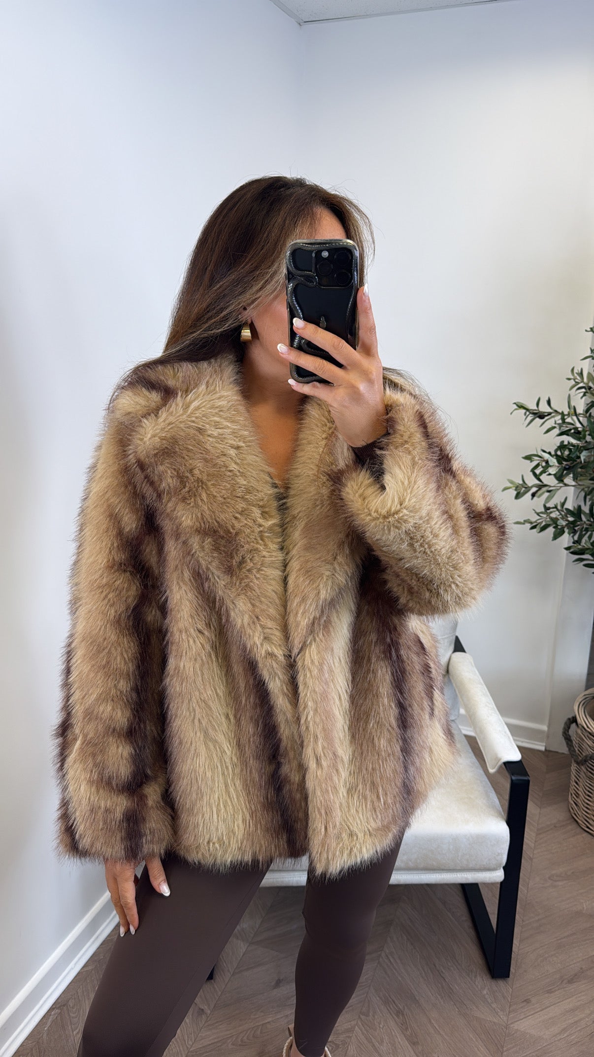 Elevate your outerwear with the MOLL camel faux fur jacket, featuring an unreal two-tone design that blends luxe style with effortless glam. This snuggly jacket offers warmth and softness, making it a standout statement piece for any fashionable wardrobe. Perfect for adding texture and sophistication to your look, it’s the ultimate in cozy, chic outerwear.