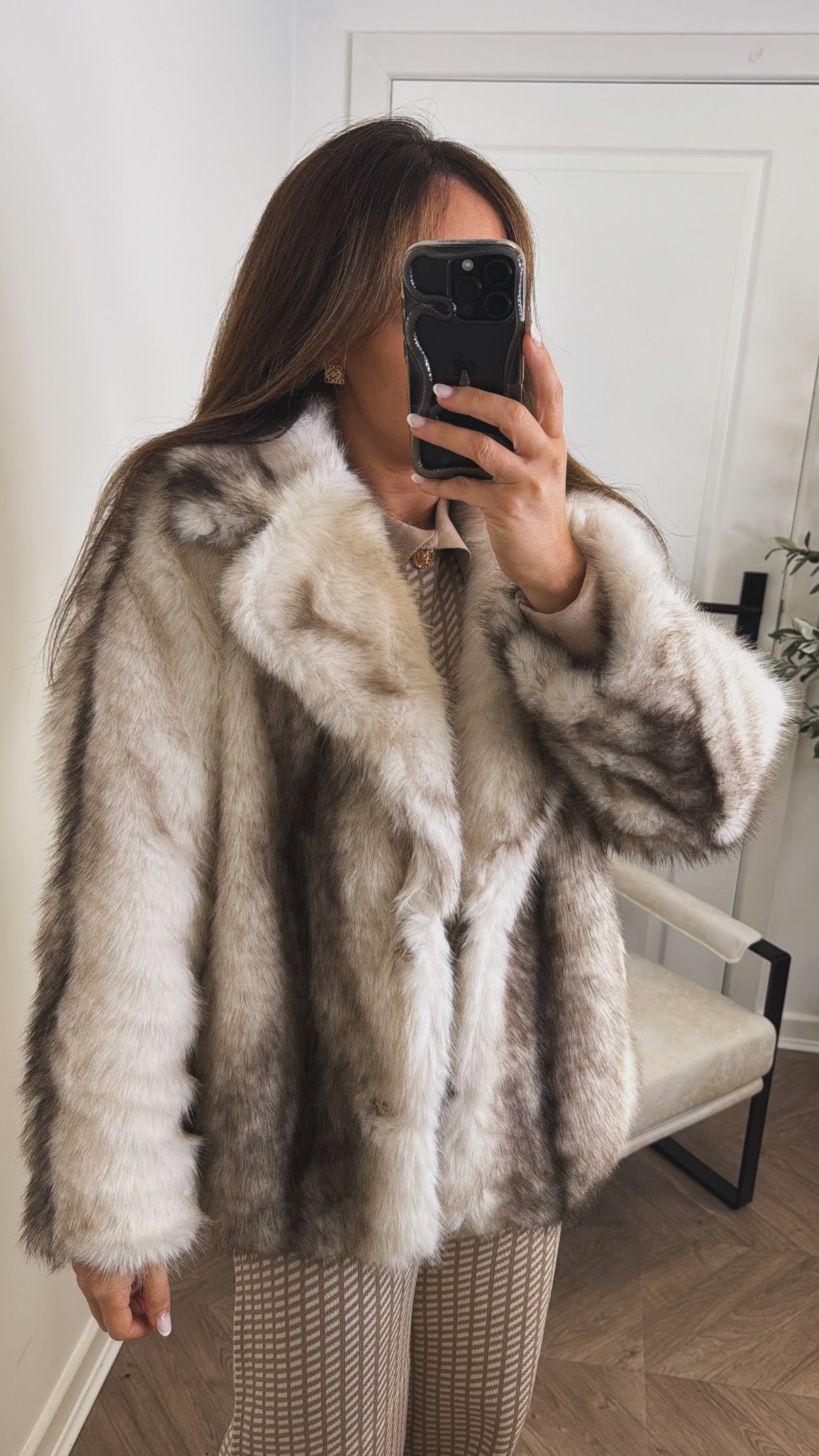 Elevate your outerwear with the MOLL cream faux fur jacket, featuring an unreal two-tone design that blends luxe style with effortless glam. This snuggly jacket offers warmth and softness, making it a standout statement piece for any fashionable wardrobe. Perfect for adding texture and sophistication to your look, it’s the ultimate in cozy, chic outerwear.