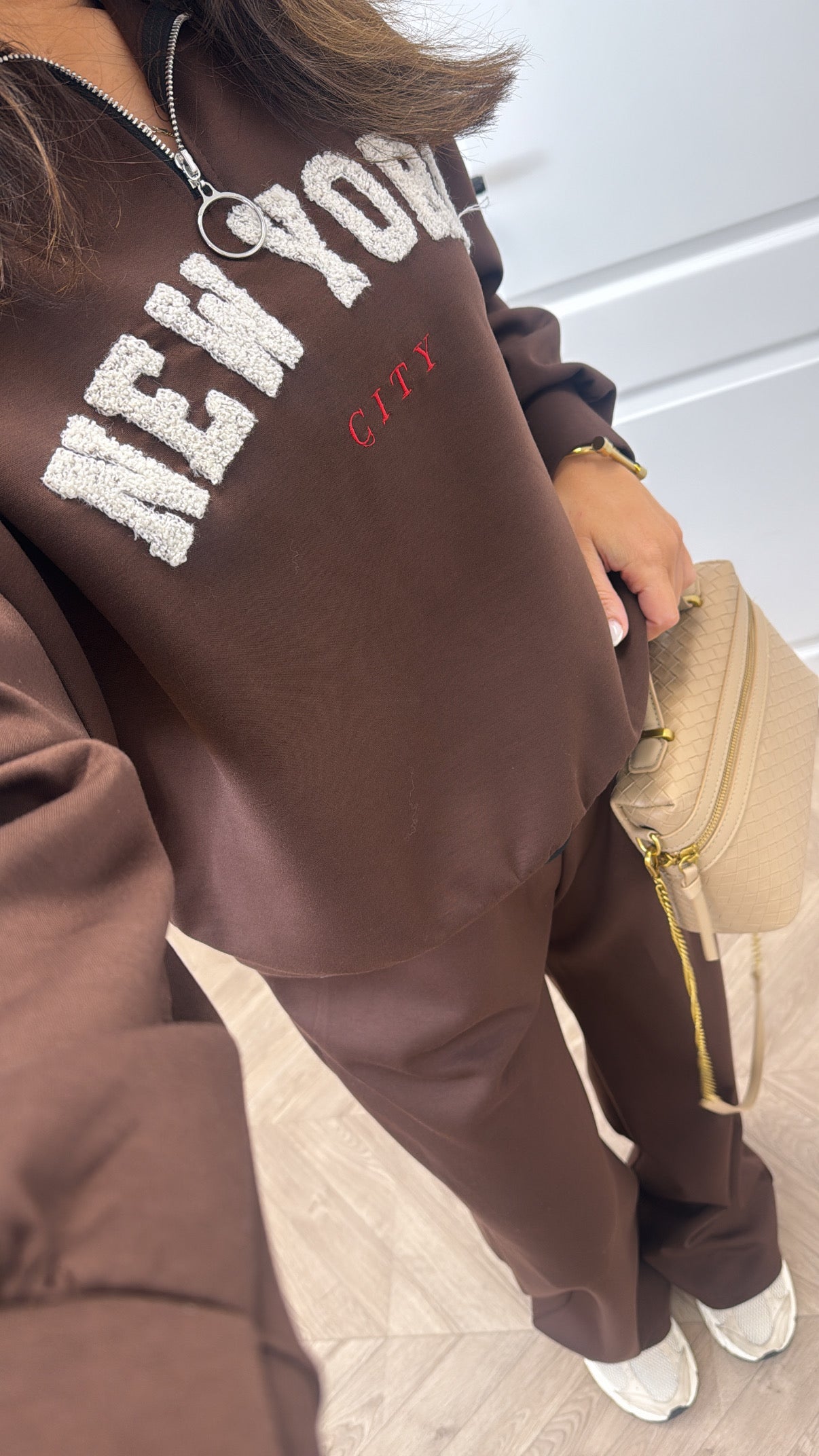 Stay cozy and chic in our NEW YORK brown borg logo tracksuit. The brown color and cream logo add a touch of fashion to this zip up jacket and wide leg joggers set. With an elasticated waist, it's both stylish and comfortable. Perfect for any fashion-forward individual.