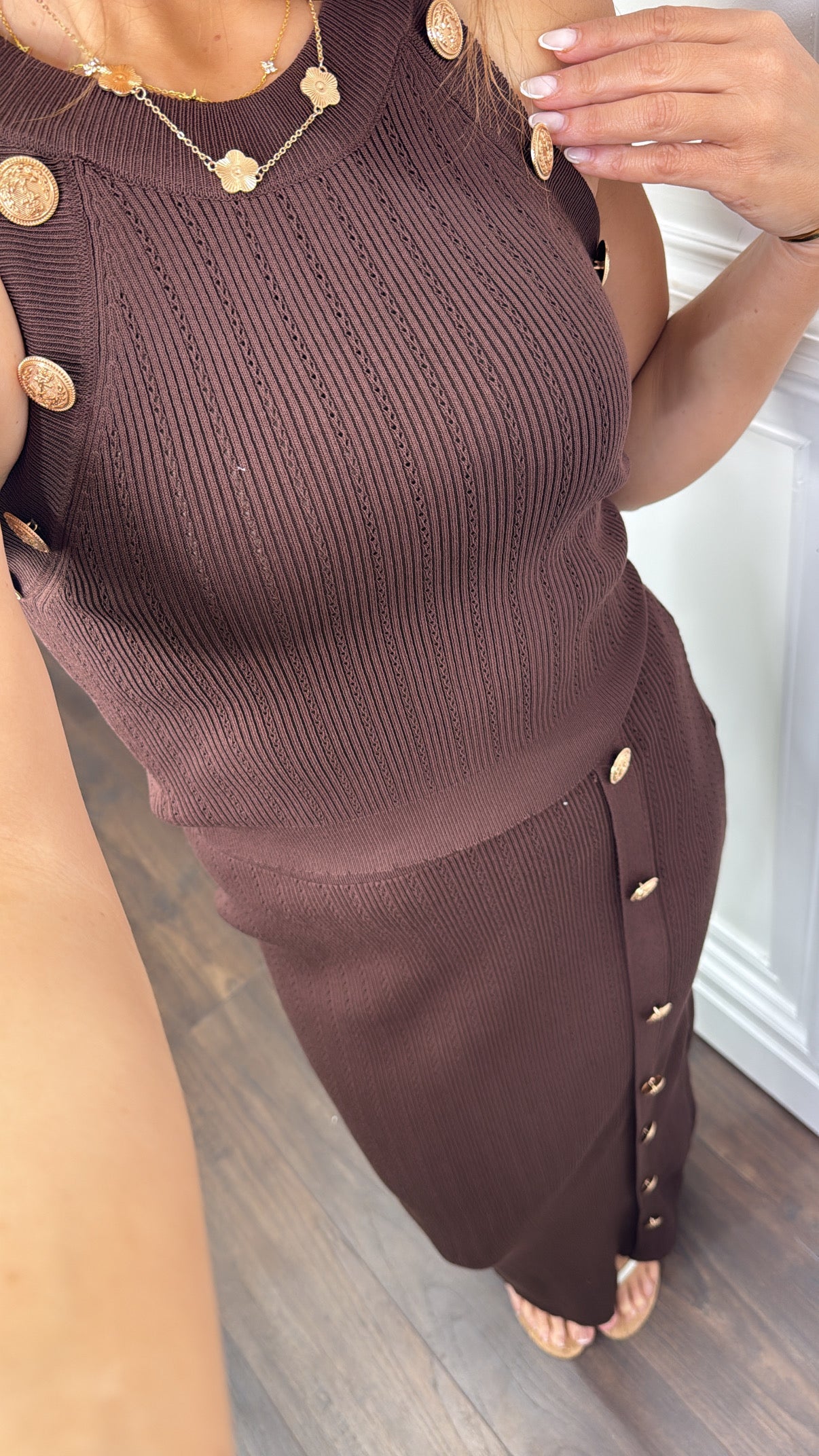 Elevate your wardrobe with our OLIVIA co-ord set, featuring a chic brown knitted fabric that offers both comfort and style. The maxi skirt flows gracefully, enhanced by elegant gold button details that add a touch of sophistication. Perfect for making a fashionable statement with effortless ease.