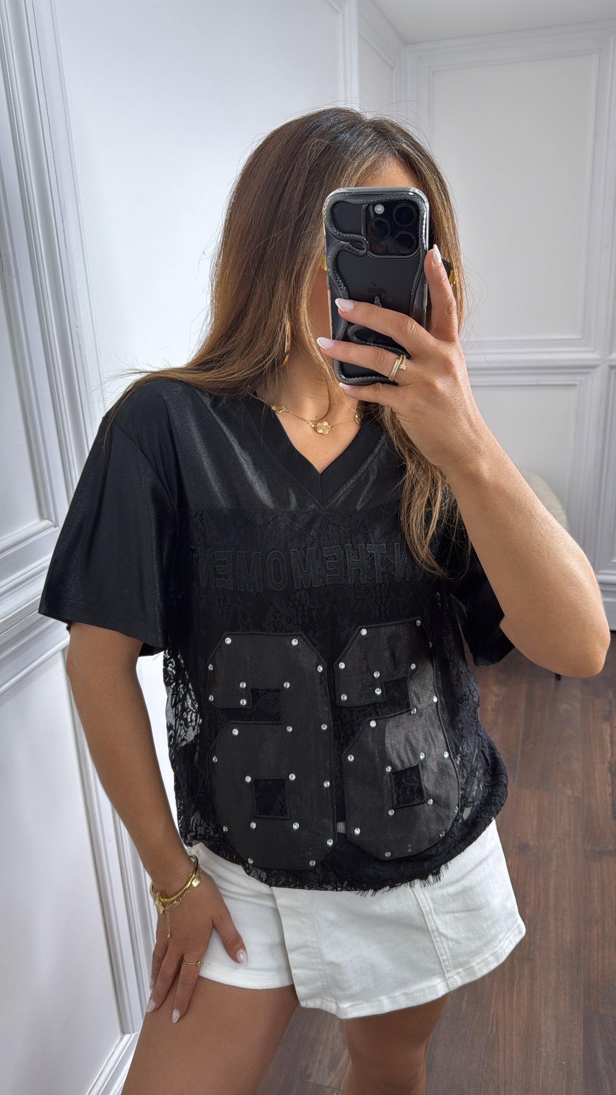 Elevate your style with this exquisite black lace top that commands attention. The sheer lace overlay creates a captivating silhouette while the built-in vest top ensures comfort and coverage. Luxurious satin accents add textural contrast, while delicate diamanté embellishments catch the light with every movement. The distinctive '66' motif adds an edgy, fashion-forward element that transforms this piece from simply elegant to utterly unforgettable. Own every moment in this statement-making essential.
