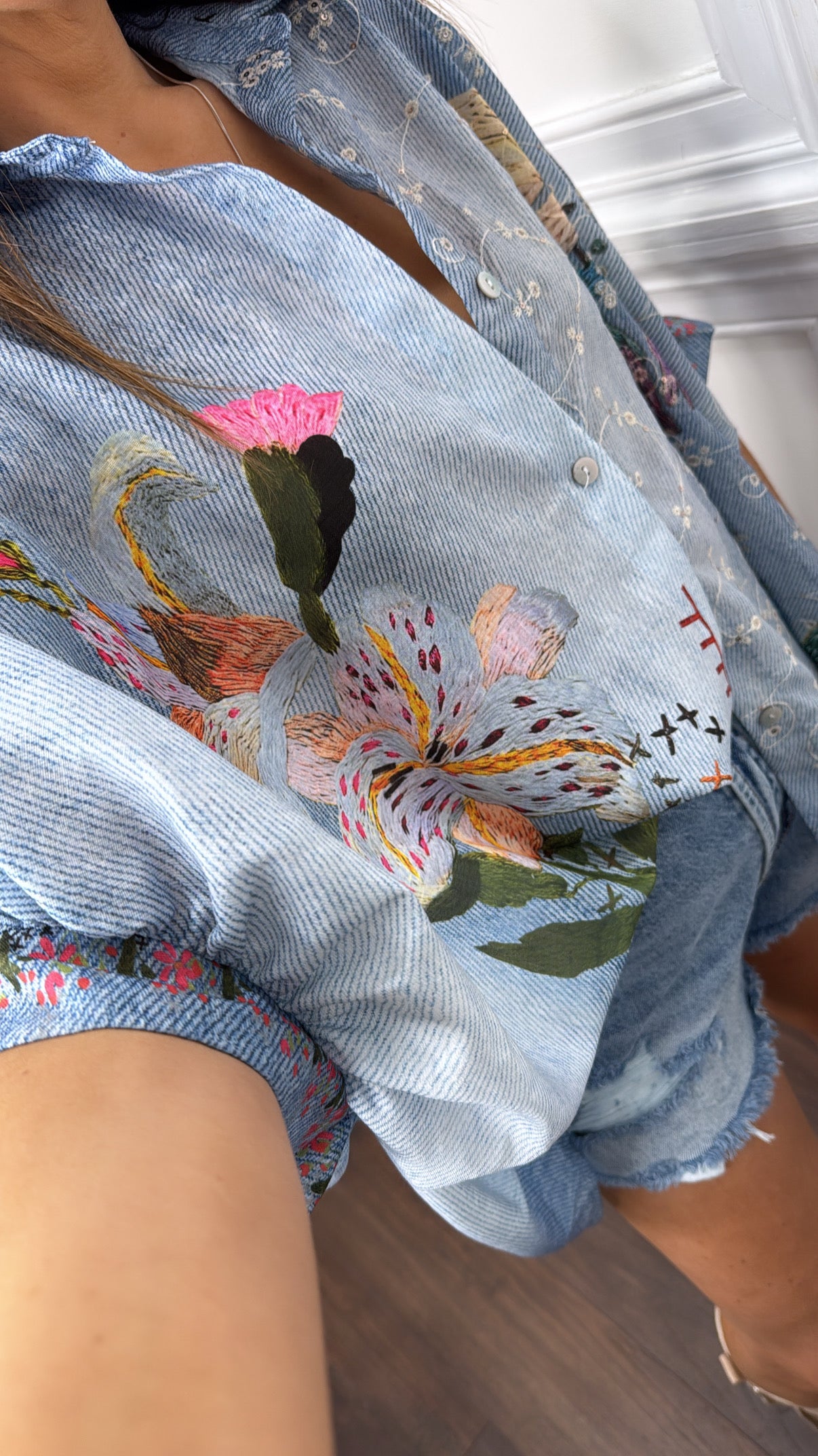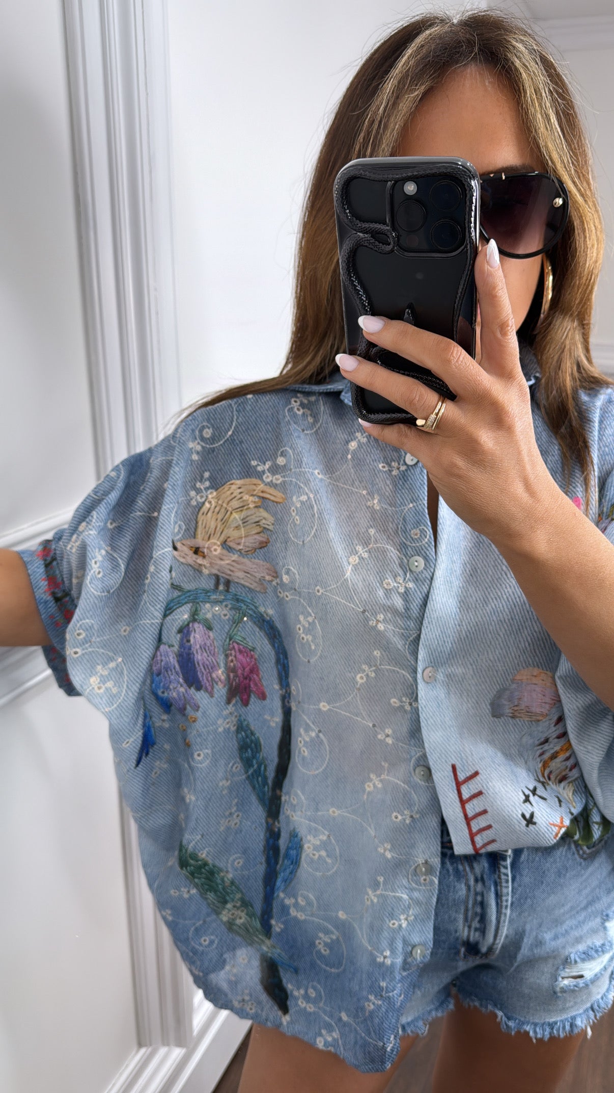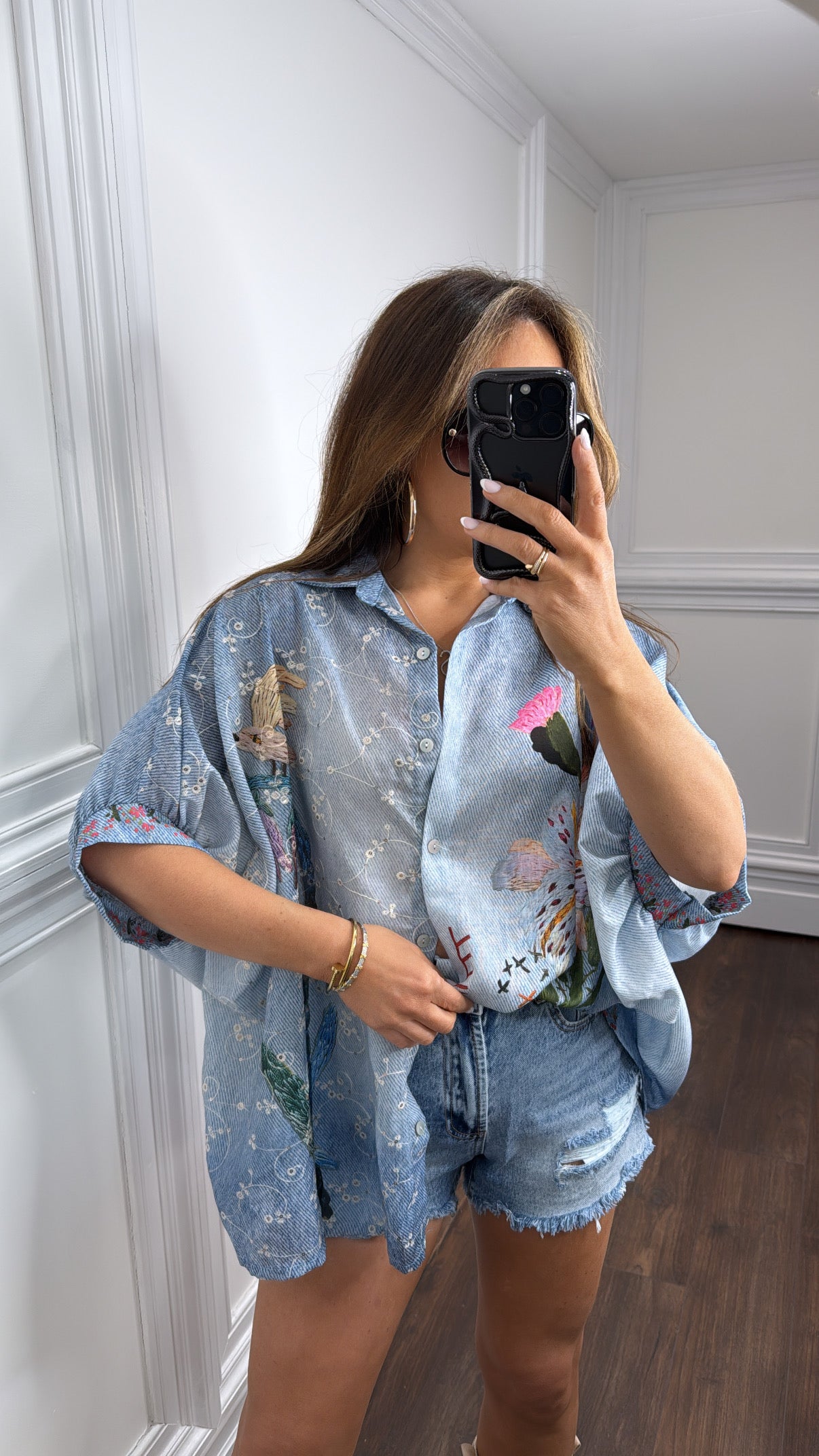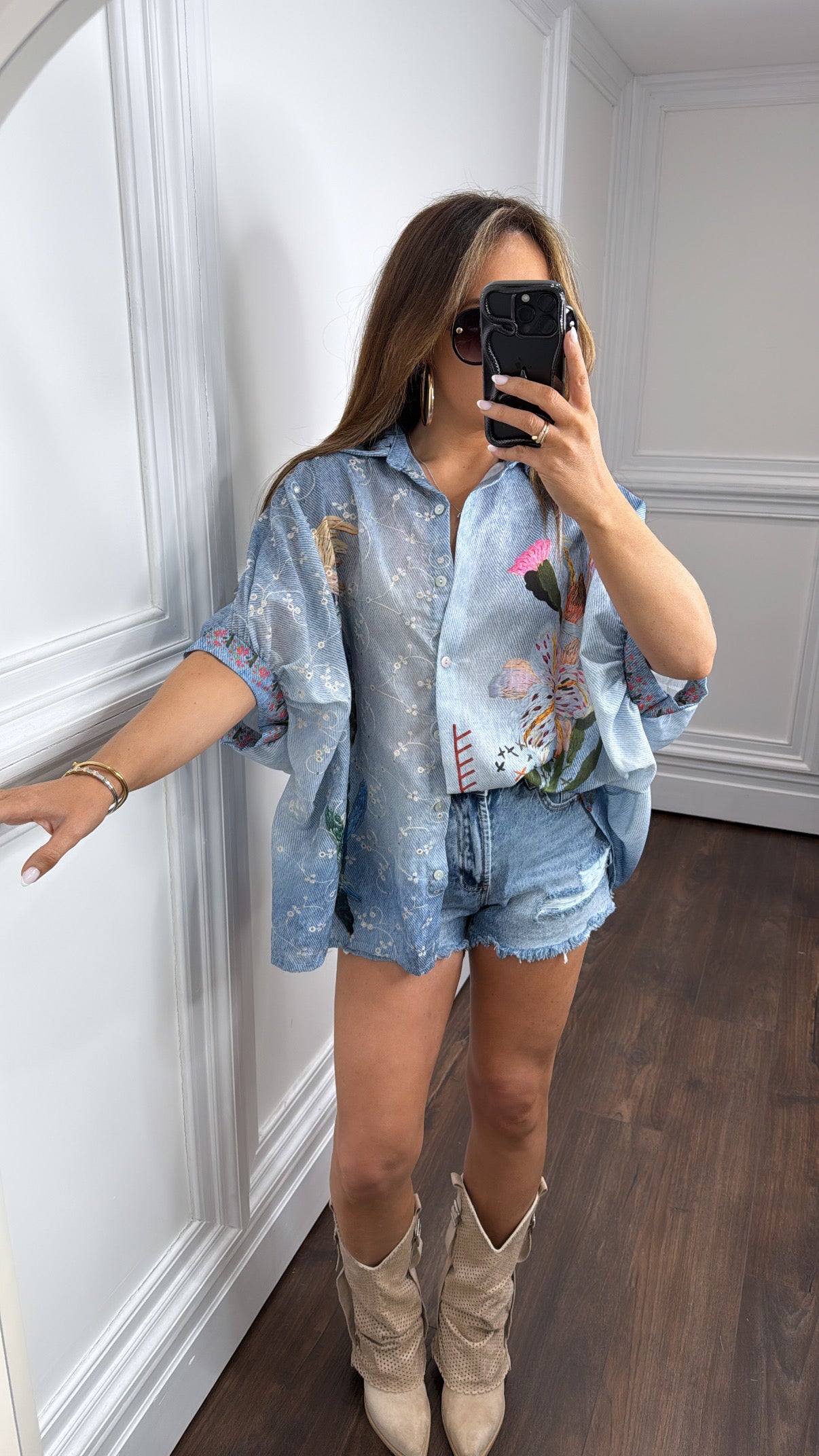 This PALOMA shirt makes a statement with its oversized fit and trendy, floral design. The delicate sequin details add a touch of glamour to the overall look. Stay fashionable while feeling comfortable in the lightweight and breathable linen-like material. Perfect for any occasion.