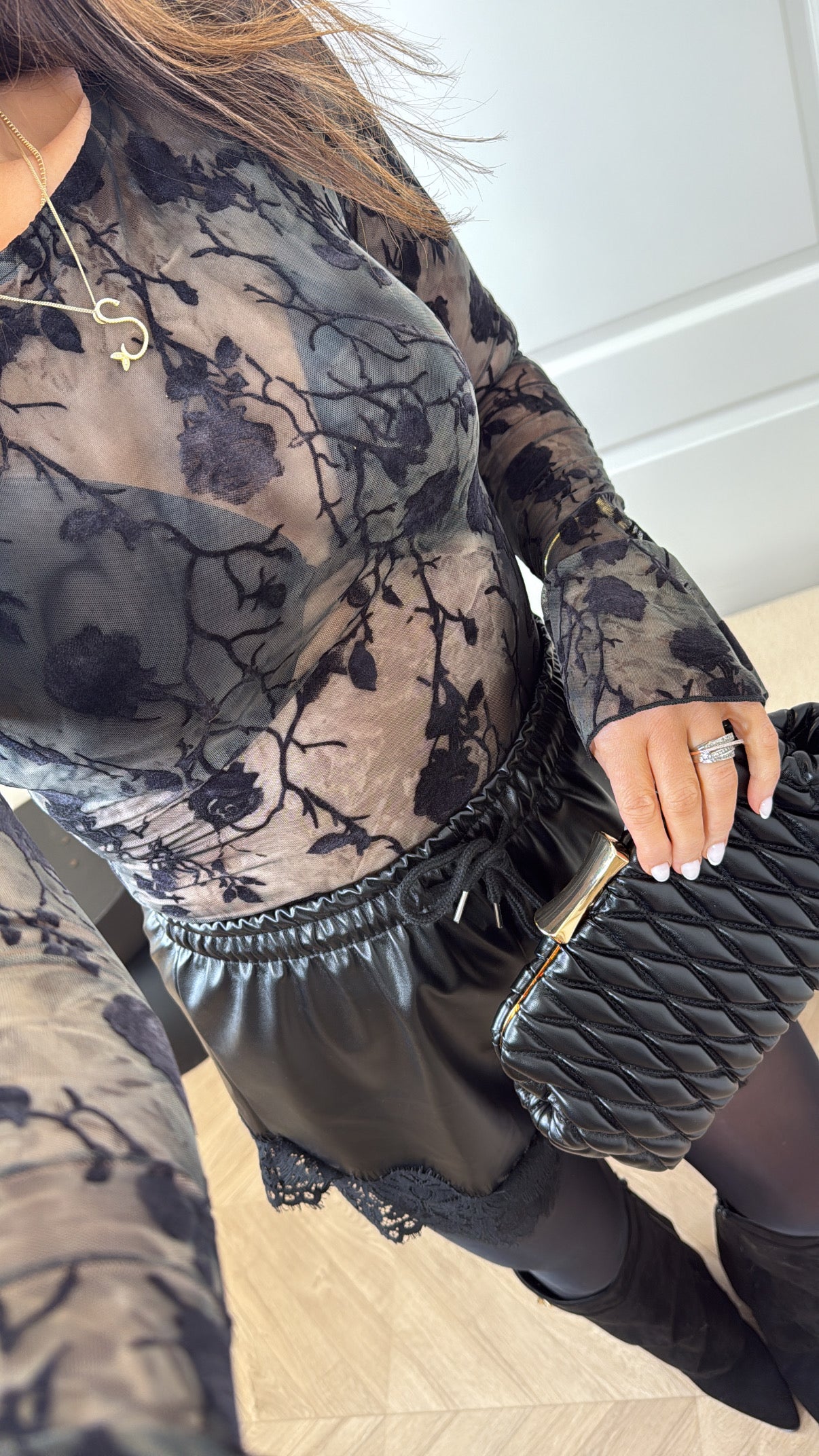 Elevate your wardrobe with this striking black mesh bodysuit, where delicate floral detailing meets contemporary silhouette. The sheer mesh fabric creates an alluring, layered look, while intricate floral embellishments add romantic sophistication. Finished with a charming frill cuff that frames the wrist with playful elegance, this piece transitions seamlessly from night out to styled layering. Perfect for those who appreciate bold femininity with refined edge.