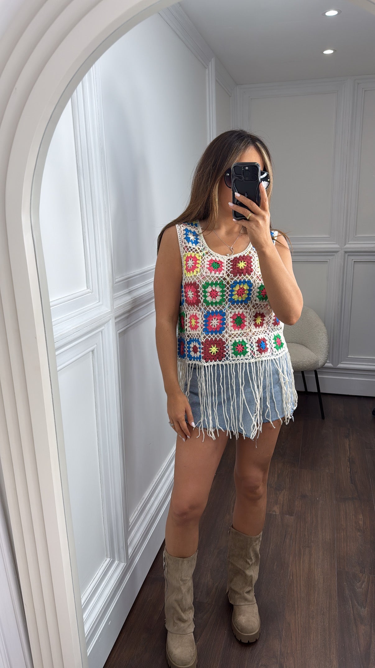 Elevate your summer wardrobe with our PENELOPE crochet detail vest top. This eye-catching piece features vibrant crochet detailing and playful tassel fringe edges that create movement with every step. The versatile black base makes it effortlessly stylish while the colourful accents add that perfect pop of personality. Pair with denim or shorts for an instantly chic, festival-ready look.