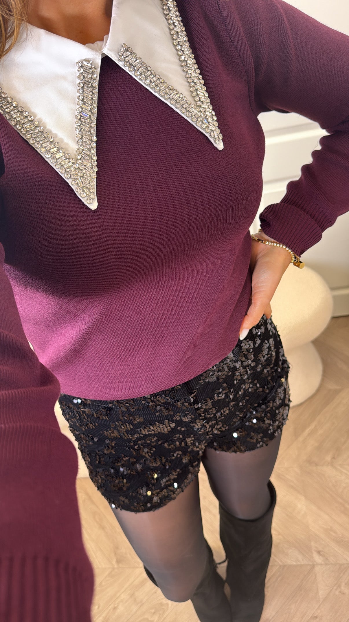 Elevate your festive wardrobe with this stunning dark plum luxe jumper, featuring an oversized embellished jewel collar that commands attention. Crafted from fine knit fabric, Penelope delivers effortless sophistication with a contemporary edge. The intricate collar detailing adds a touch of glamour, making it the perfect statement piece for Christmas gatherings and beyond. Layer it over your favourite pieces or wear solo for an instantly polished look that transitions seamlessly from day to evening.