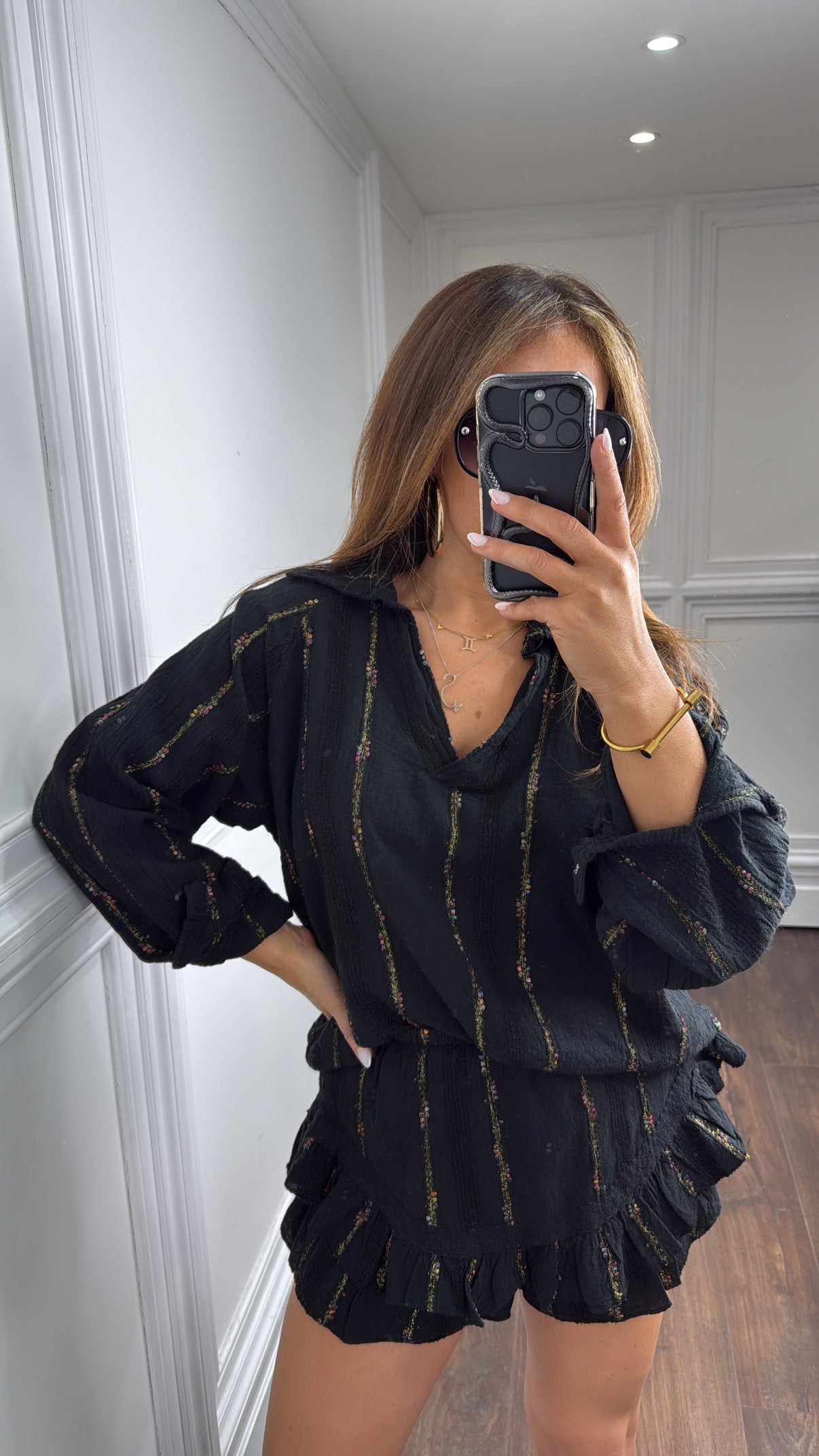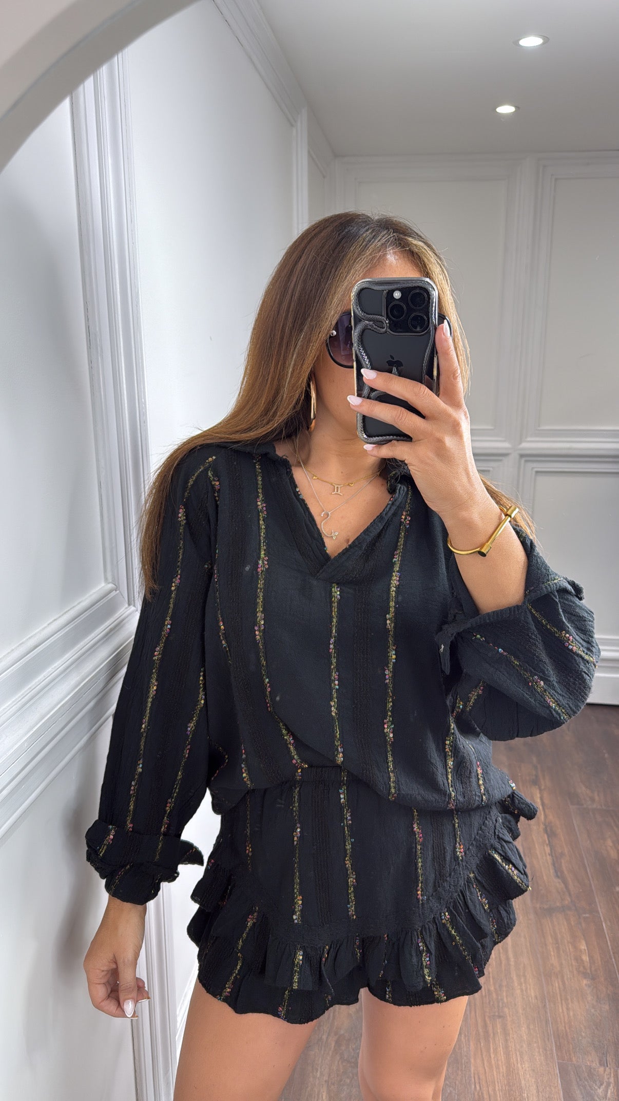 The PIXIE black cheesecloth skort co-ord combines effortless festival style with intricate detailing. Featuring an embroidered design enhanced by shimmering gold thread, it adds a touch of luxe to your look. The stretchy waistband ensures a comfortable, flattering fit, making it perfect for all-day wear. Embrace a chic, bohemian vibe with this standout piece.