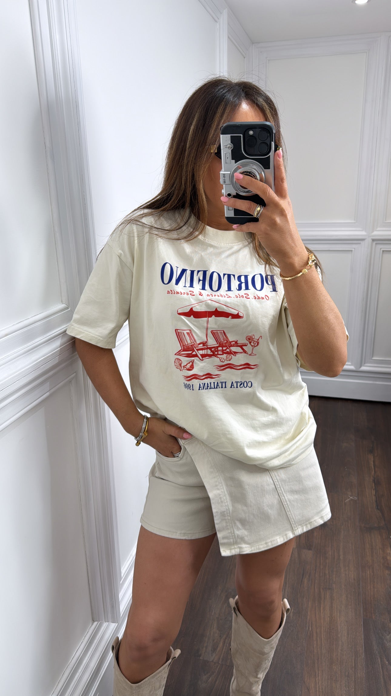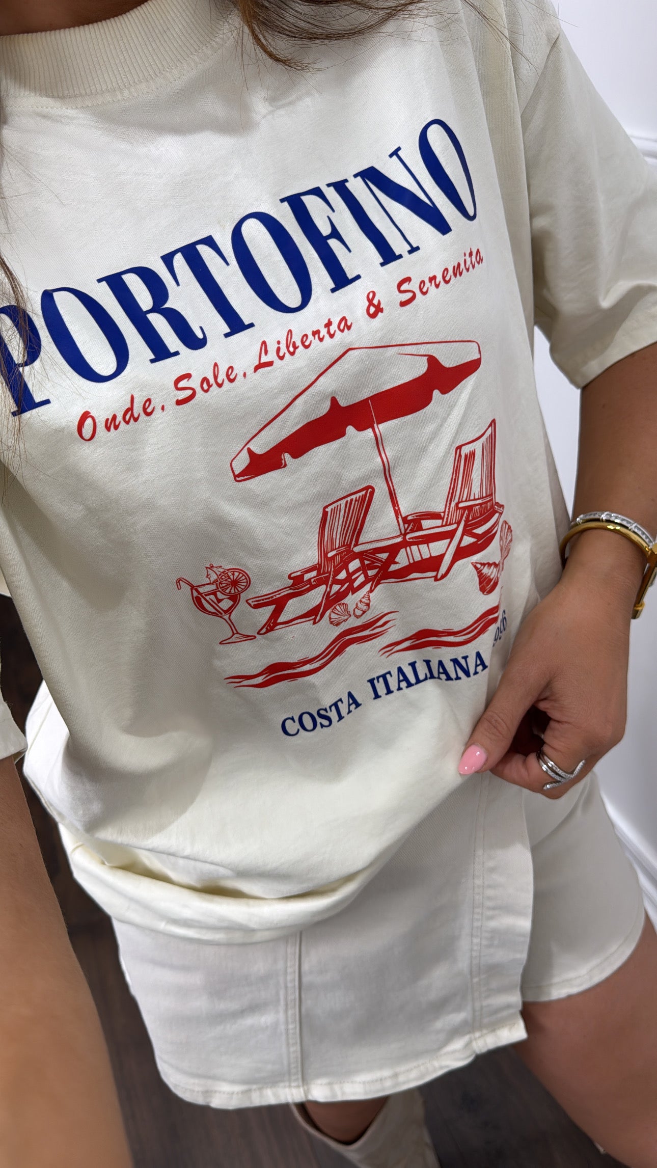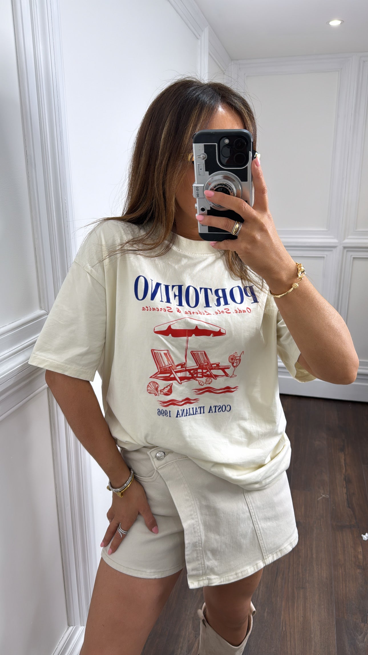 Elevate your style with the new PORTOFINO cream logo oversized t-shirt. Perfectly paired with leggings or shorts, the striking blue writing and vibrant red picture make a bold fashion statement. Upgrade your wardrobe today.